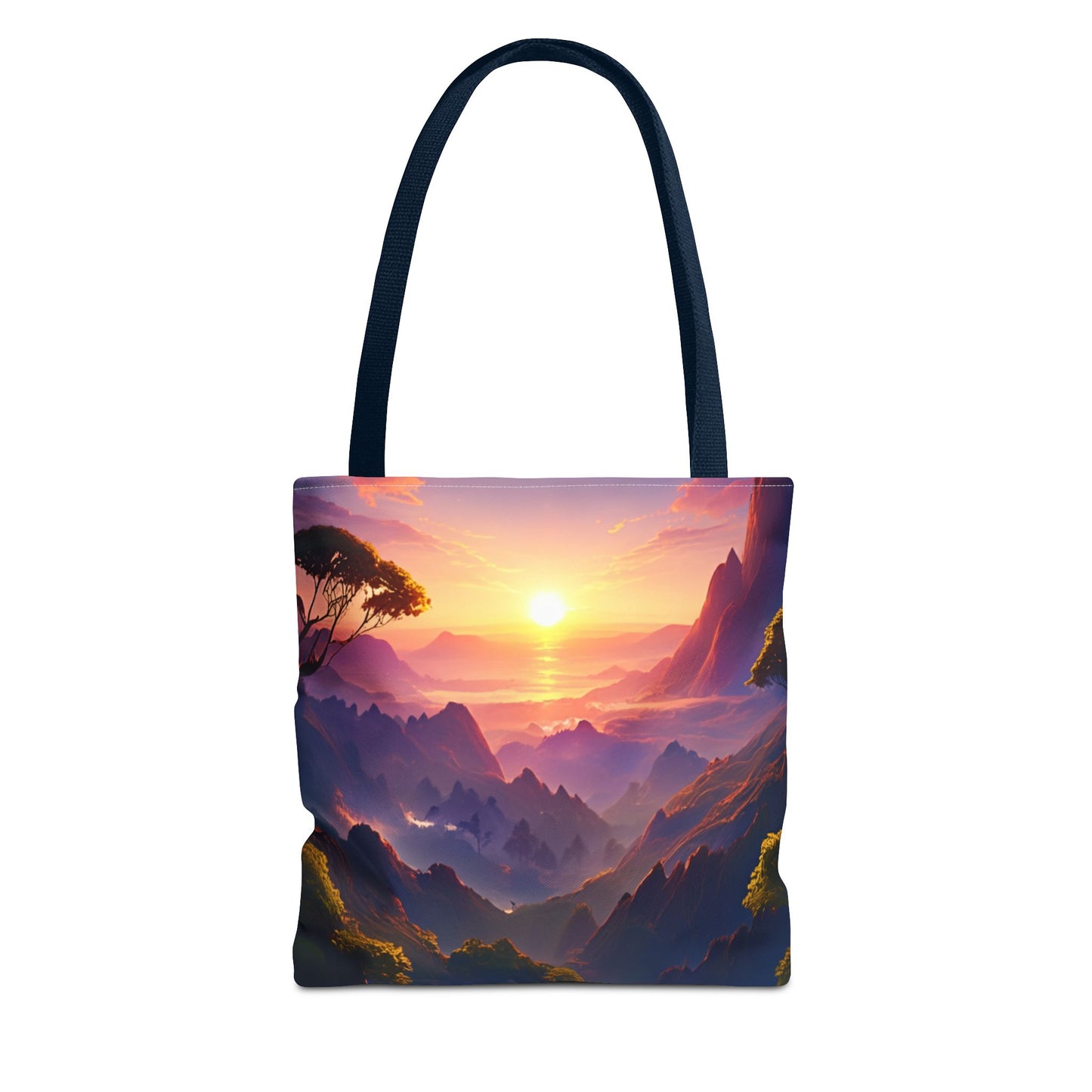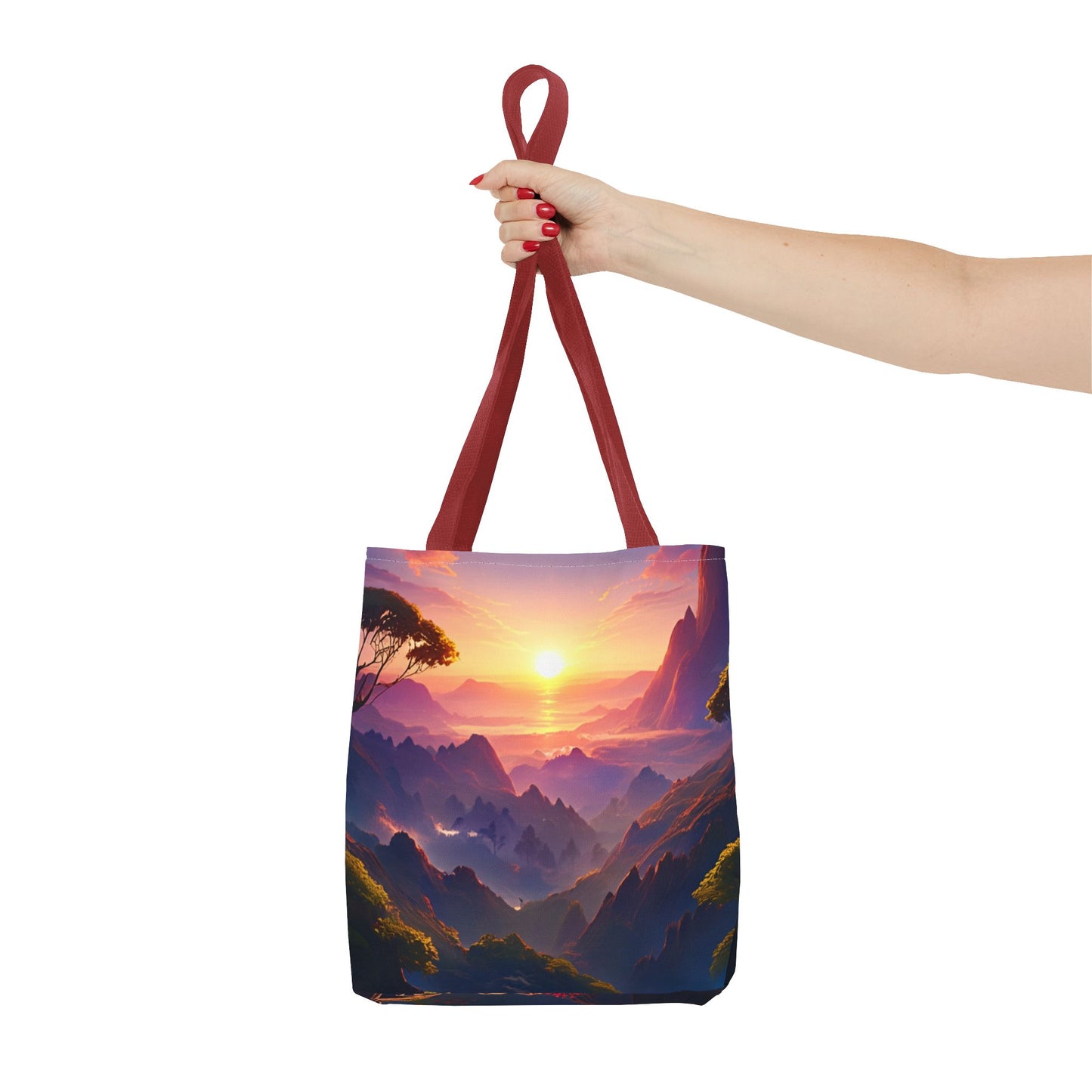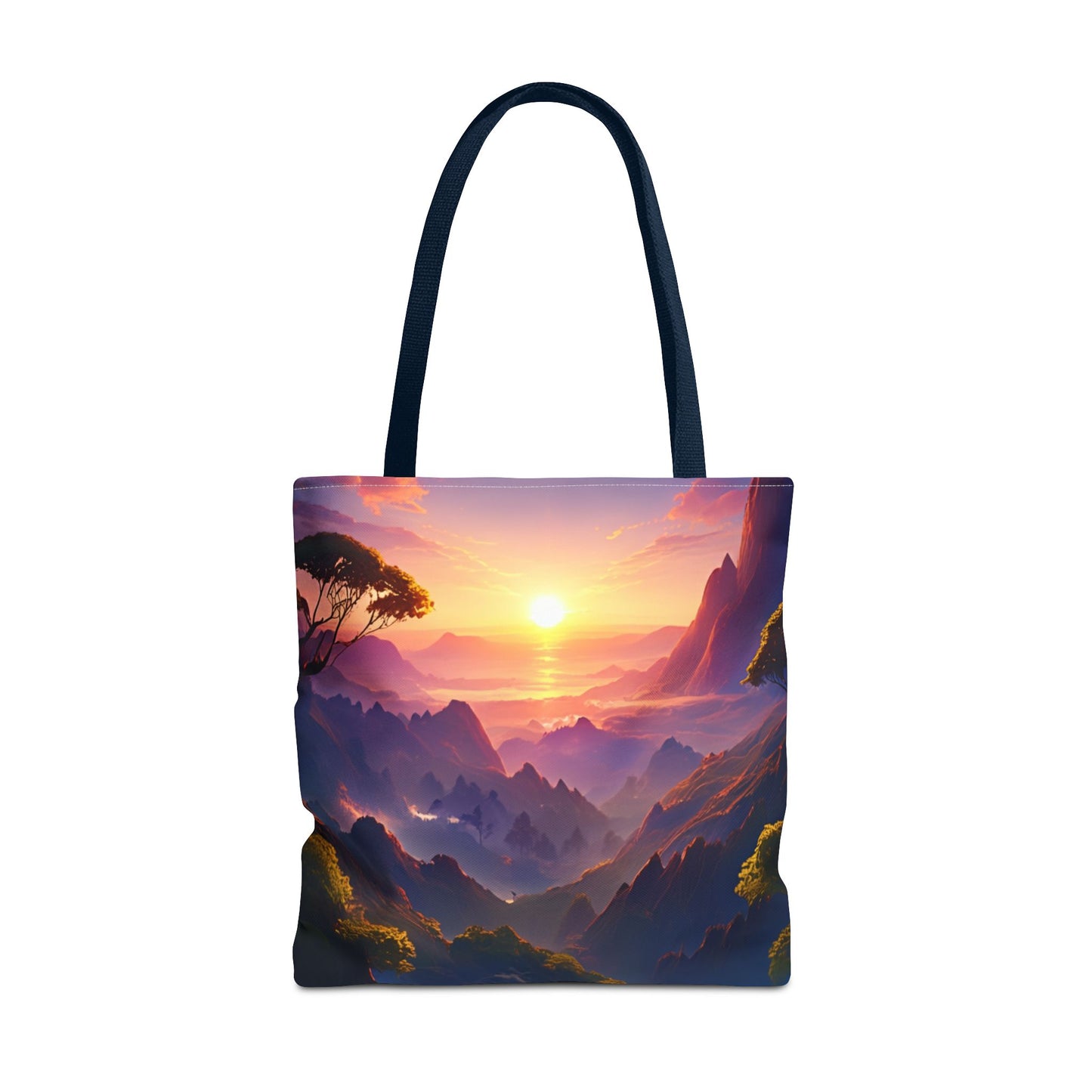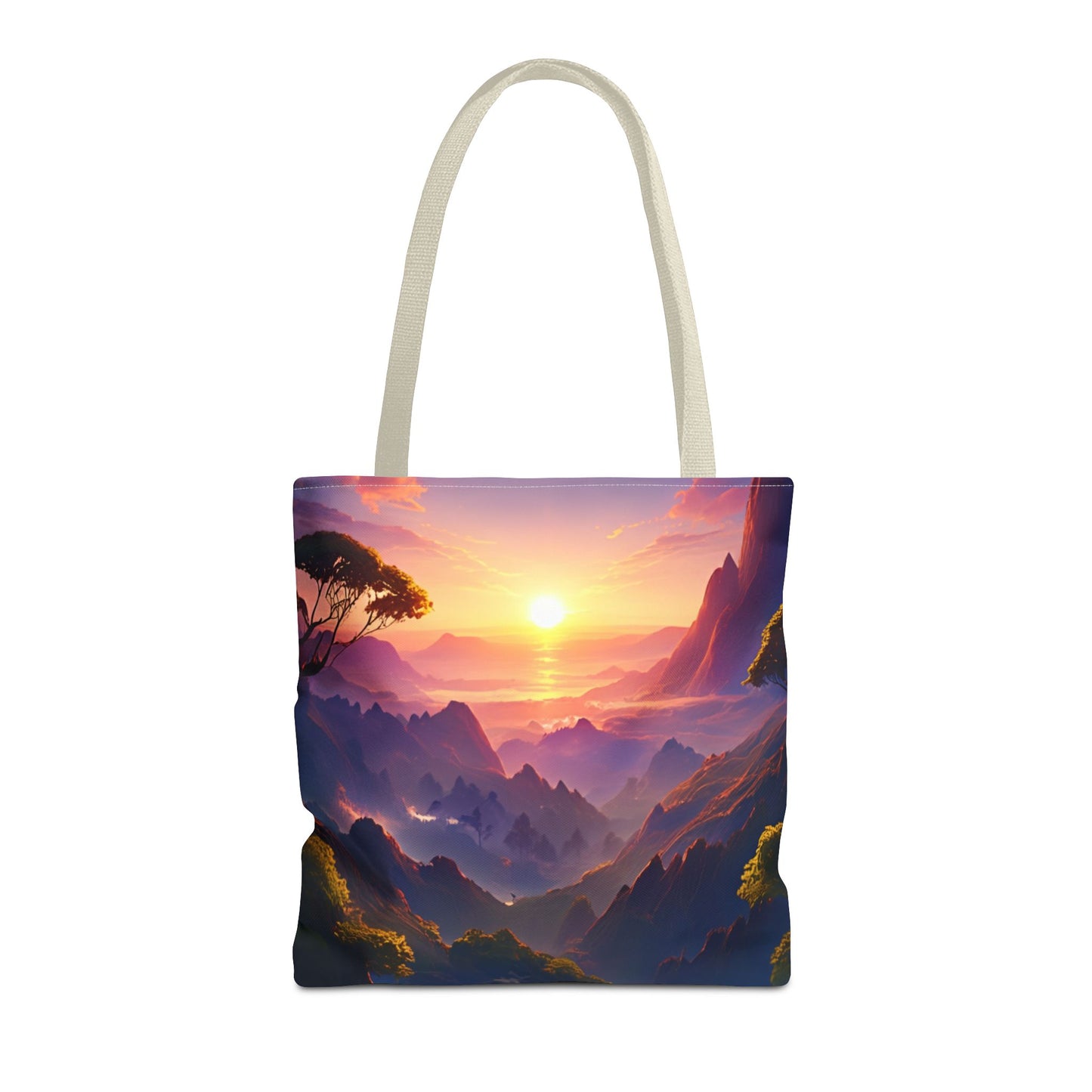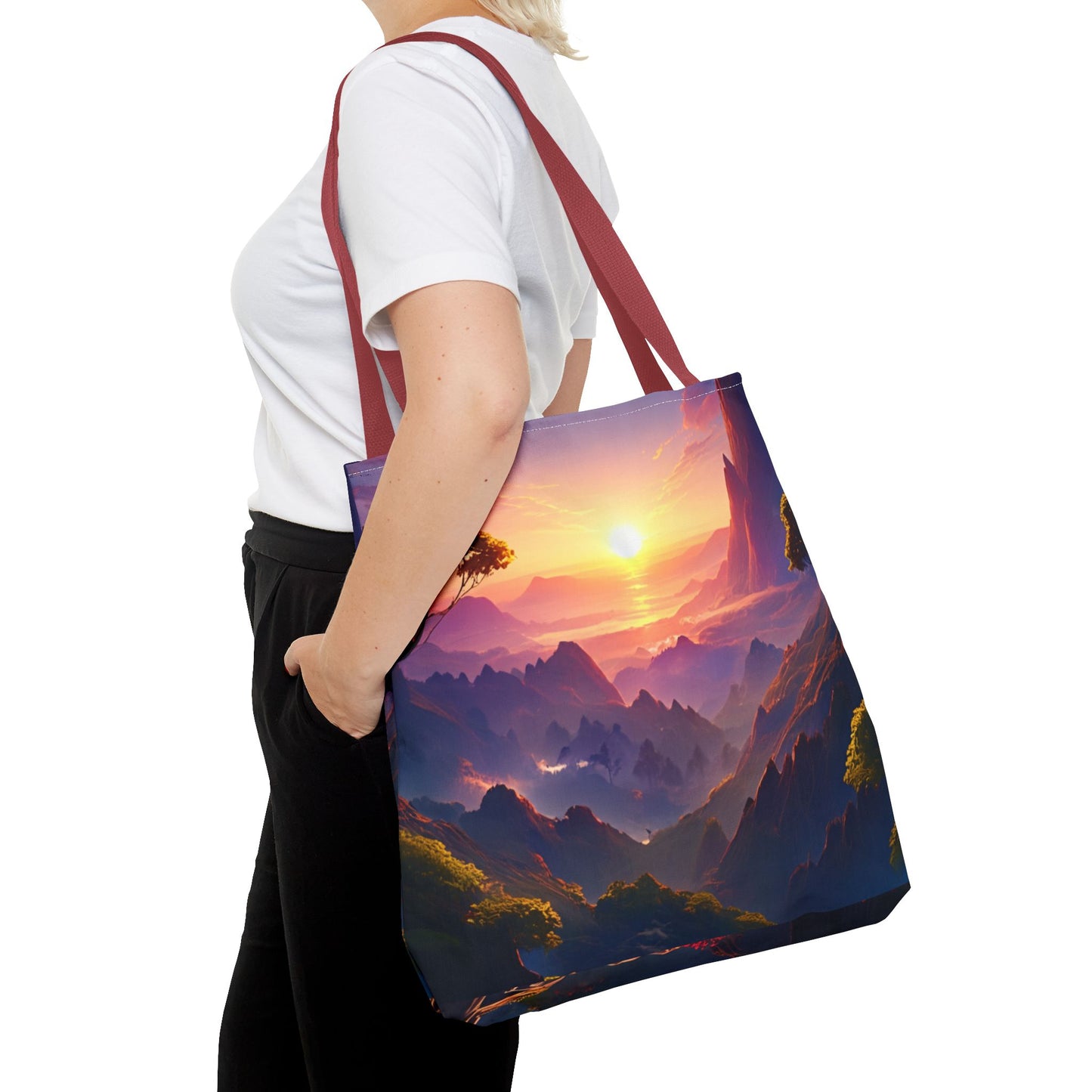 A fun scenic landscape at sunset tote bag that brings a relaxing and peaceful vibe. Perfect for nature lovers and those who enjoy serene views. Ideal for everyday use, outdoor activities, and trips to the beach or park. Relevant for summer holidays, picnics, and nature-themed celebrations.
