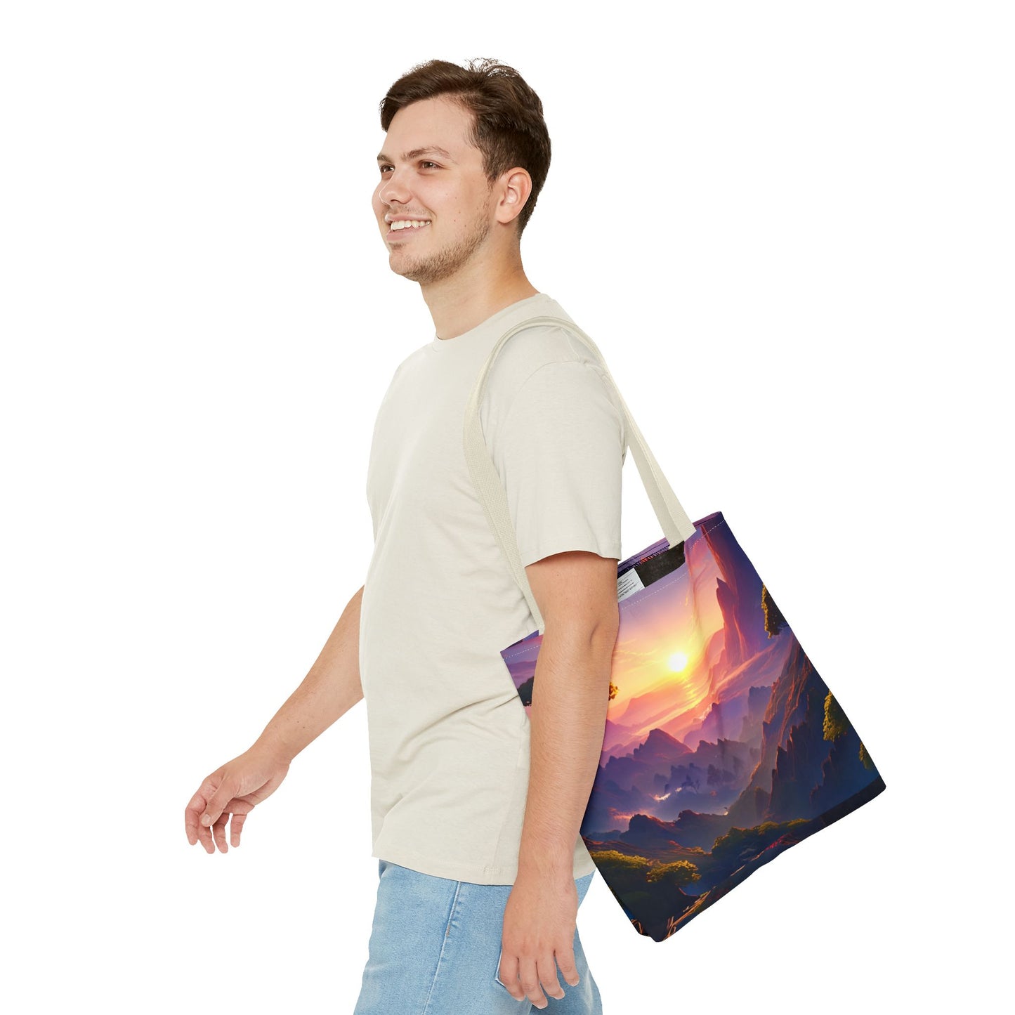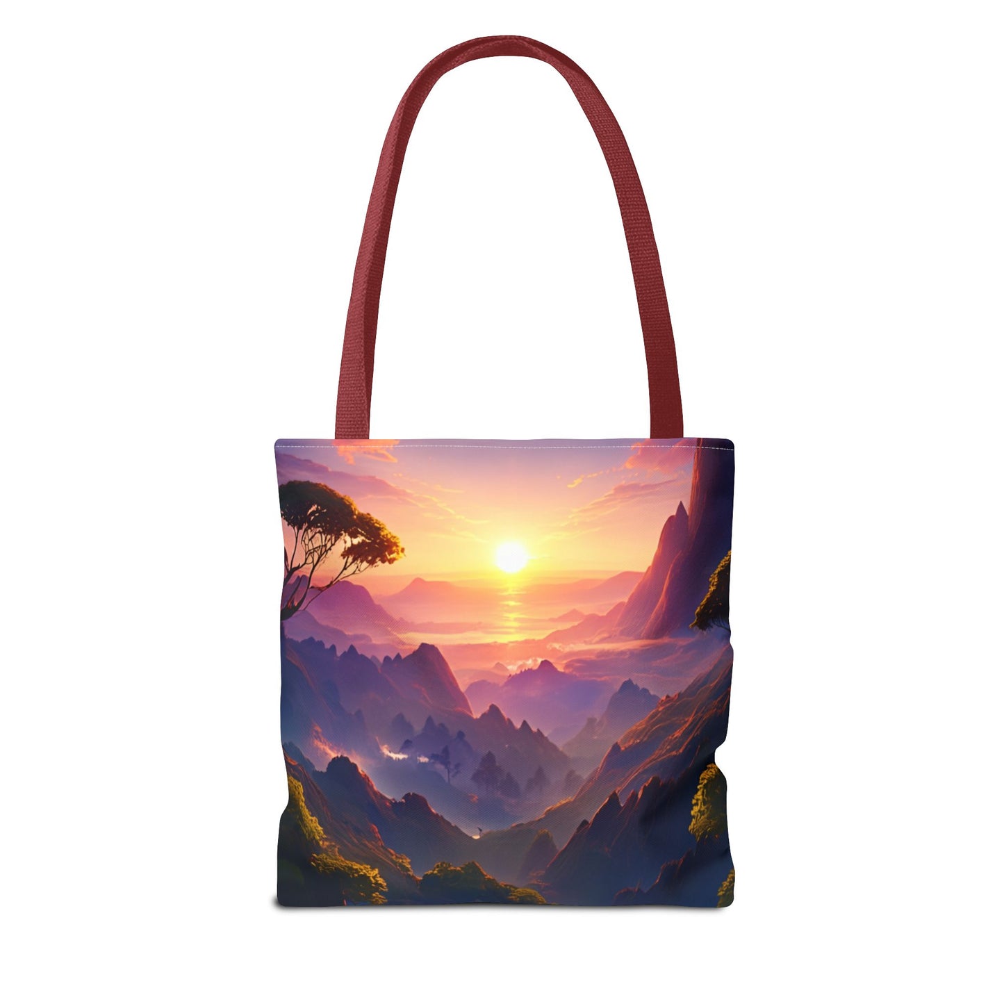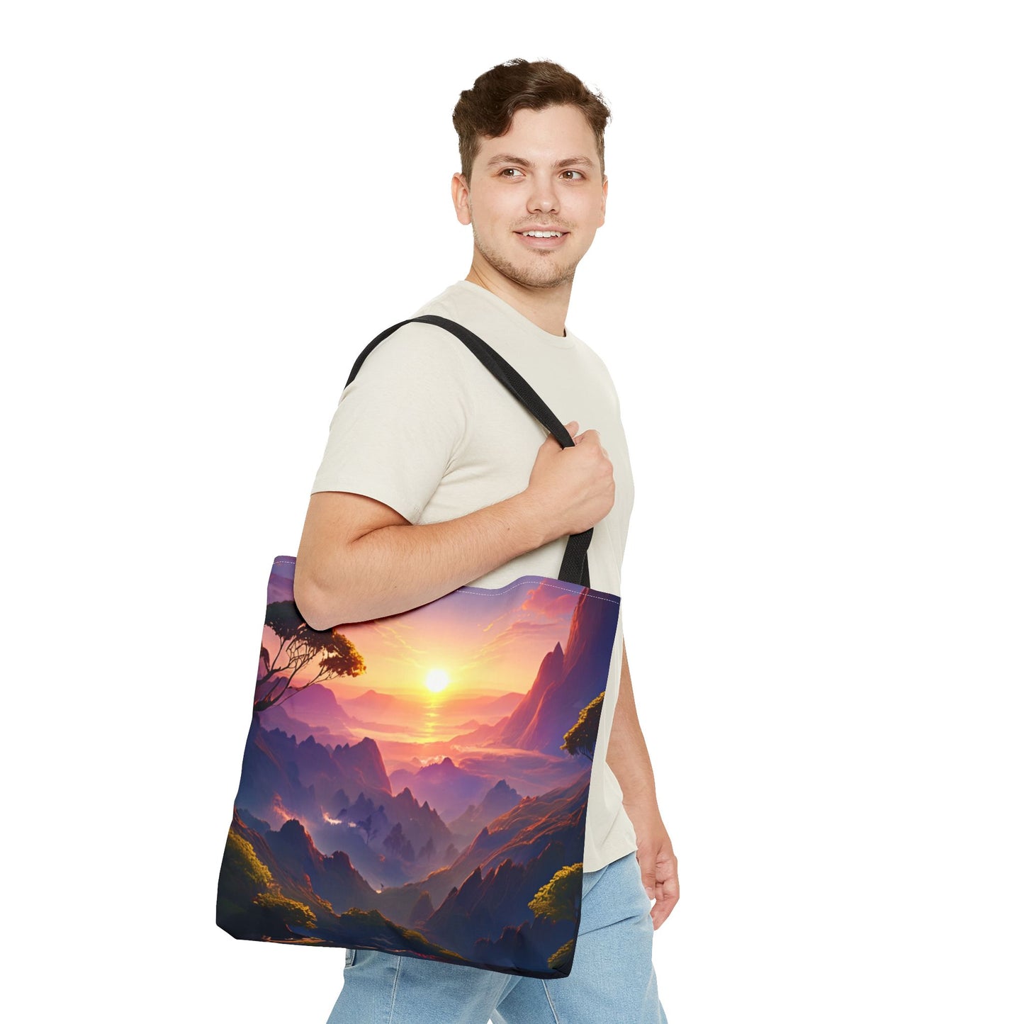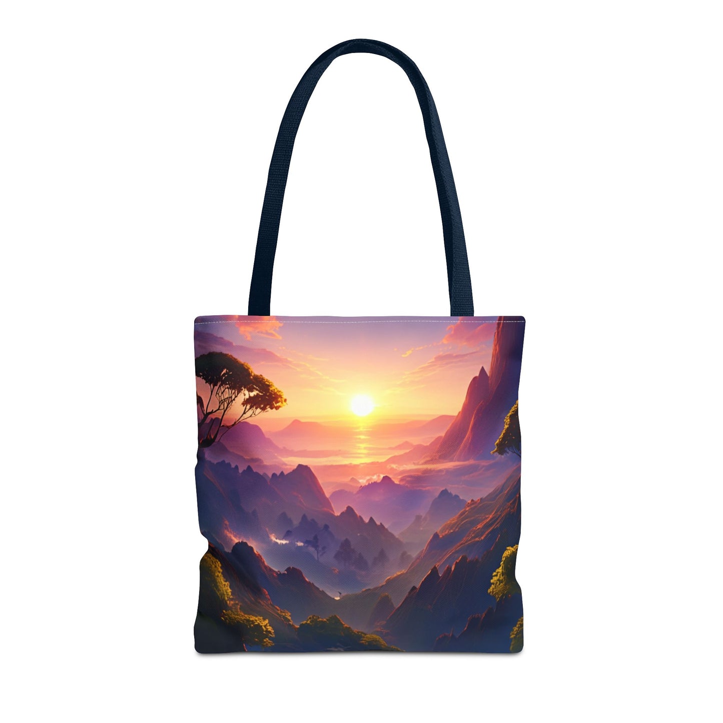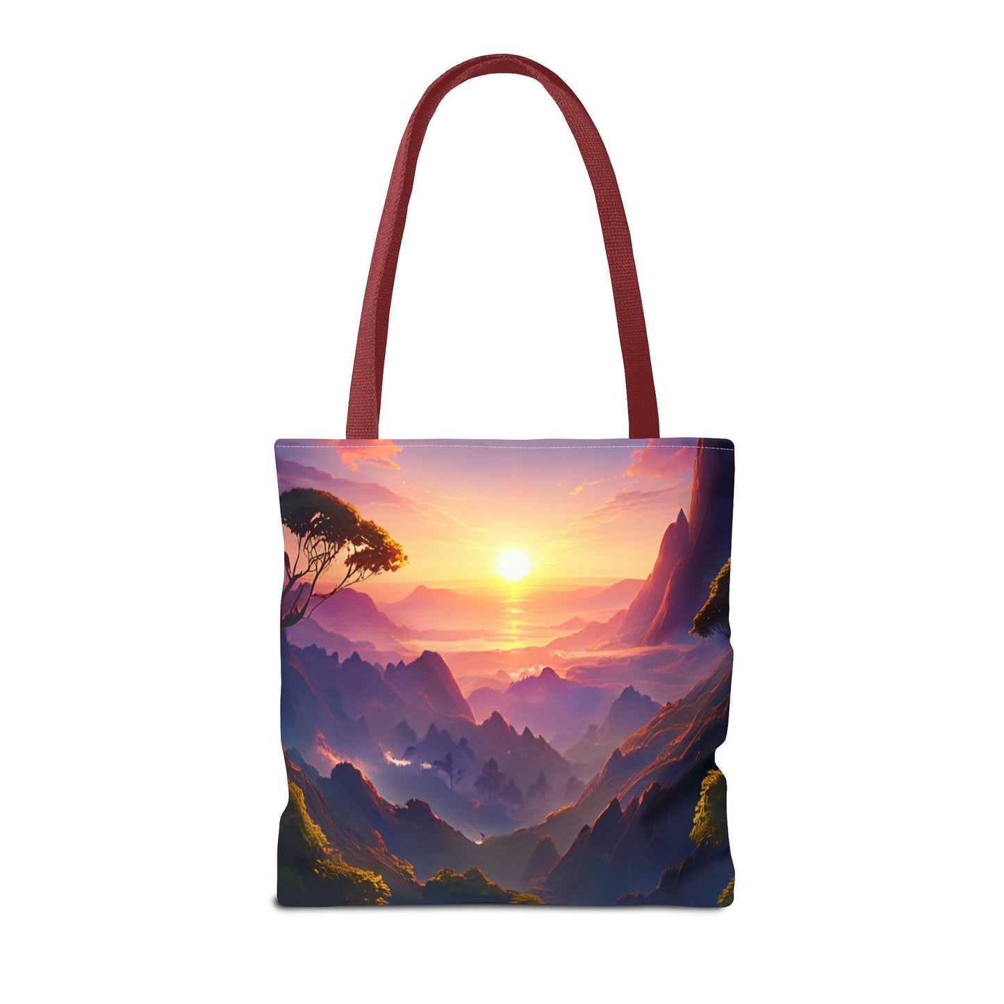 A fun scenic landscape at sunset tote bag that brings a relaxing and peaceful vibe. Perfect for nature lovers and those who enjoy serene views. Ideal for everyday use, outdoor activities, and trips to the beach or park. Relevant for summer holidays, picnics, and nature-themed celebrations.