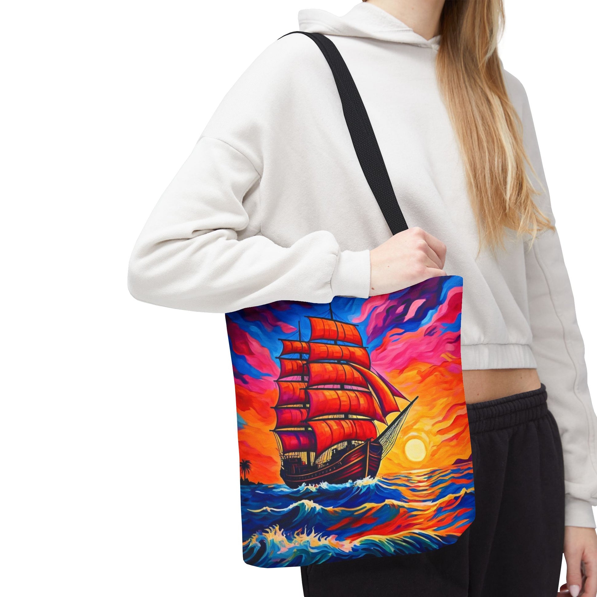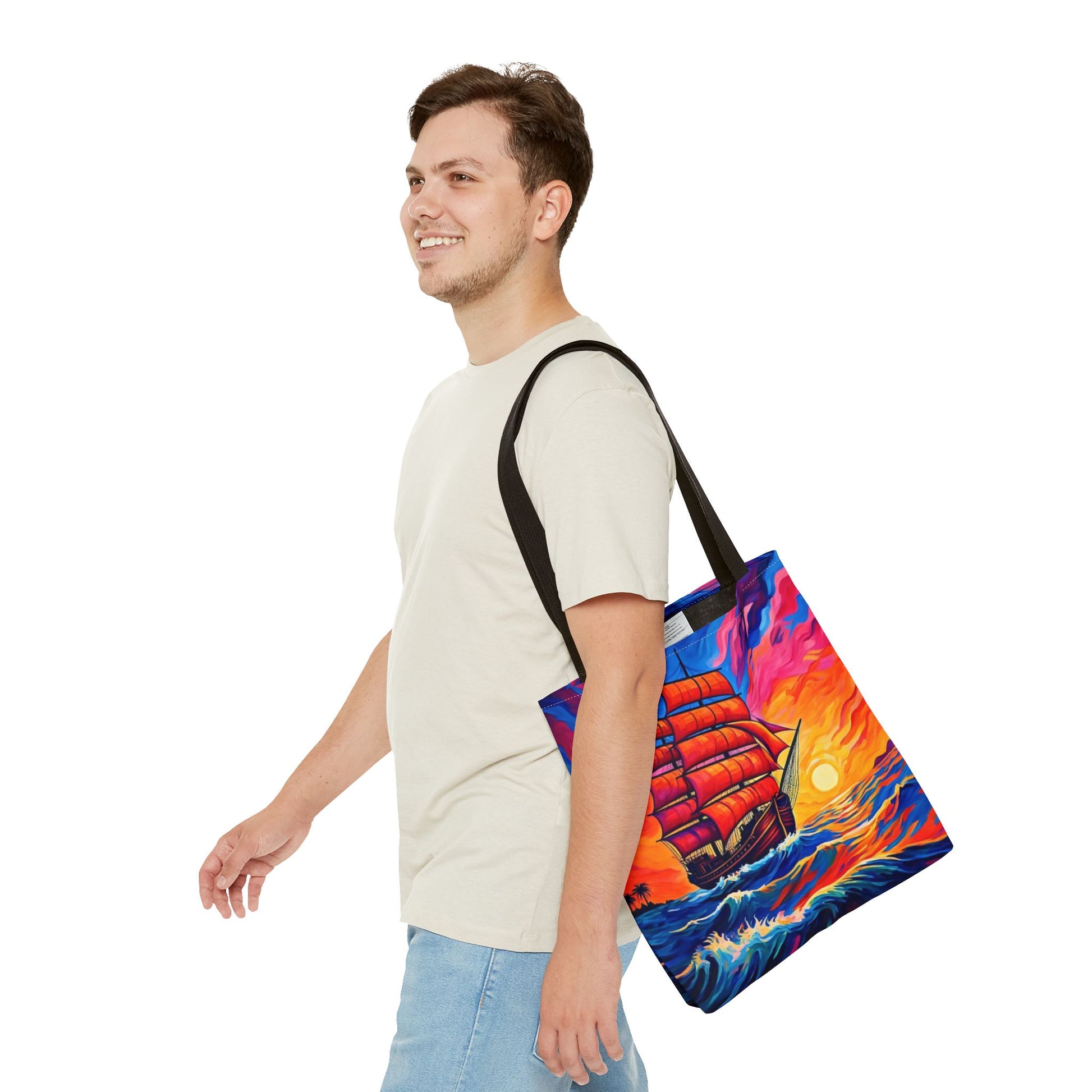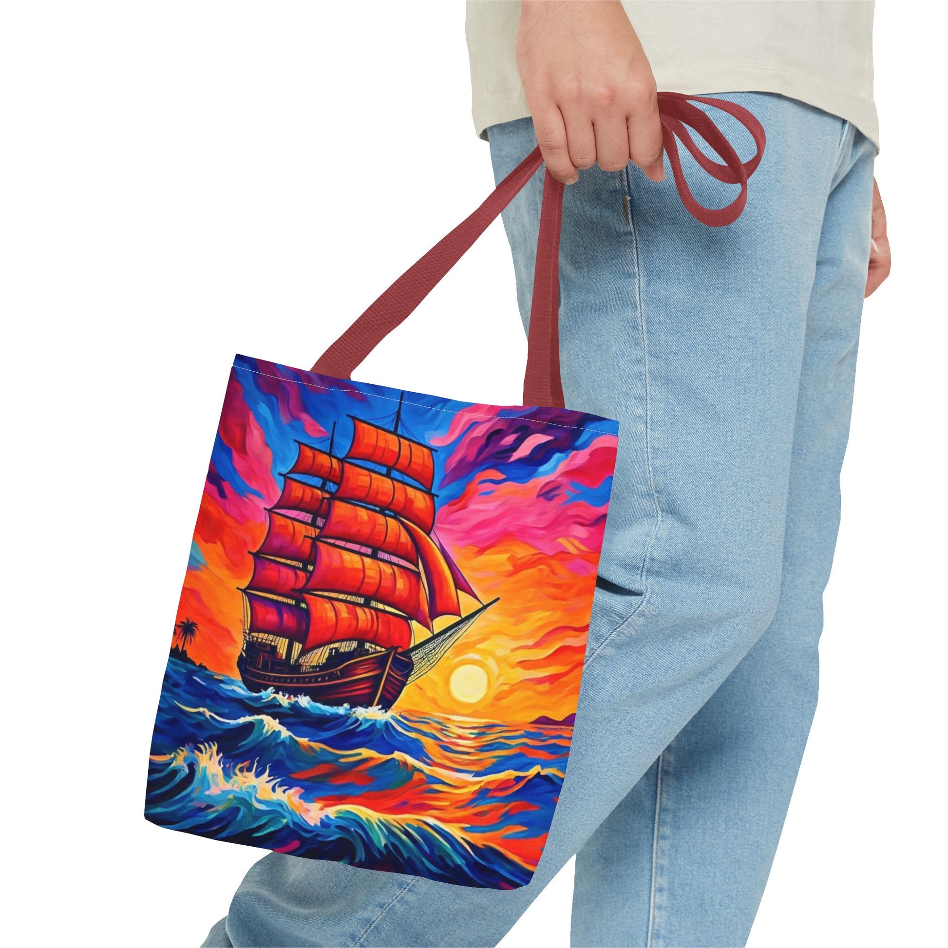 Set sail in style with this Crimson Voyage Tote Bag, featuring a bold red-sailed ship gliding across a vibrant sunset sea. The dynamic colors of orange, pink, and blue create an inspiring, adventure-filled scene that’s perfect for dreamers, travelers, and ocean lovers alike. Whether you’re hitting the beach, running errands, or heading to class, this tote is both artistic and practical — a statement piece for any day’s journey.