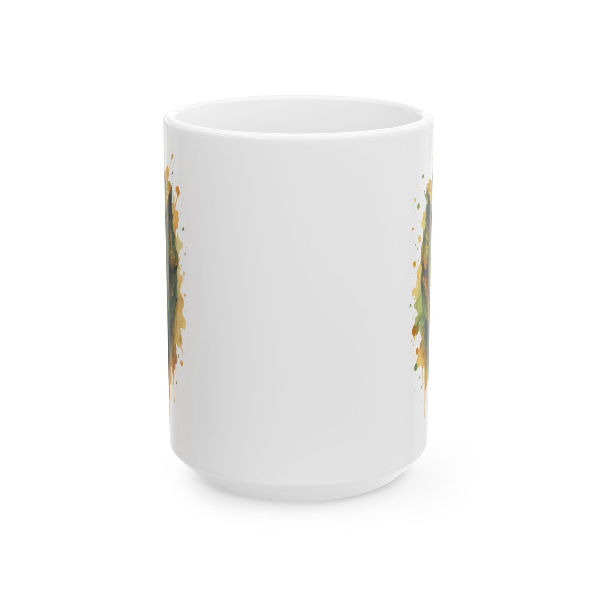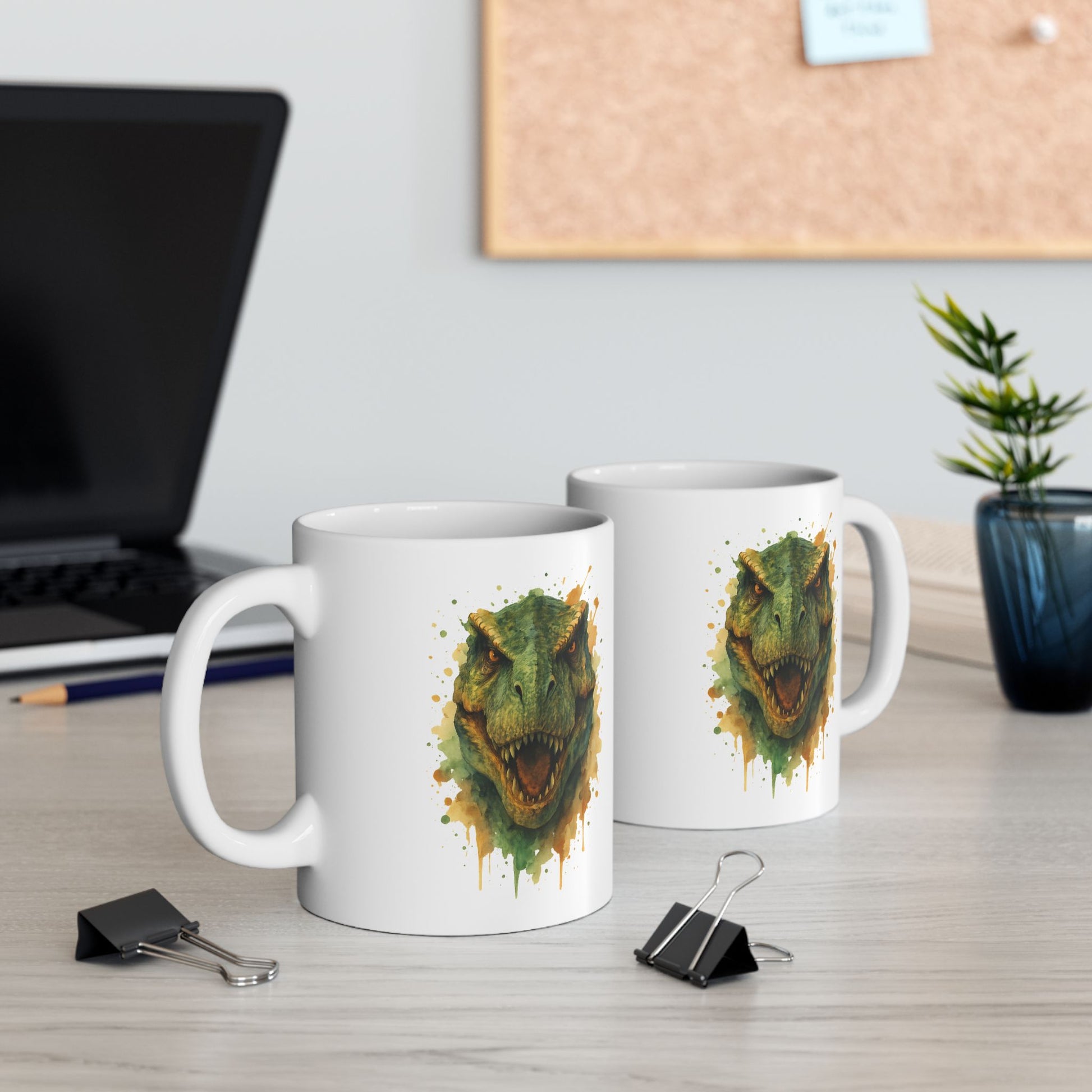 This mug features a bold, roaring T‑Rex bursting through a watercolor splash — perfect for dino fans, Jurassic junkies, and fearless sippers of morning brew.