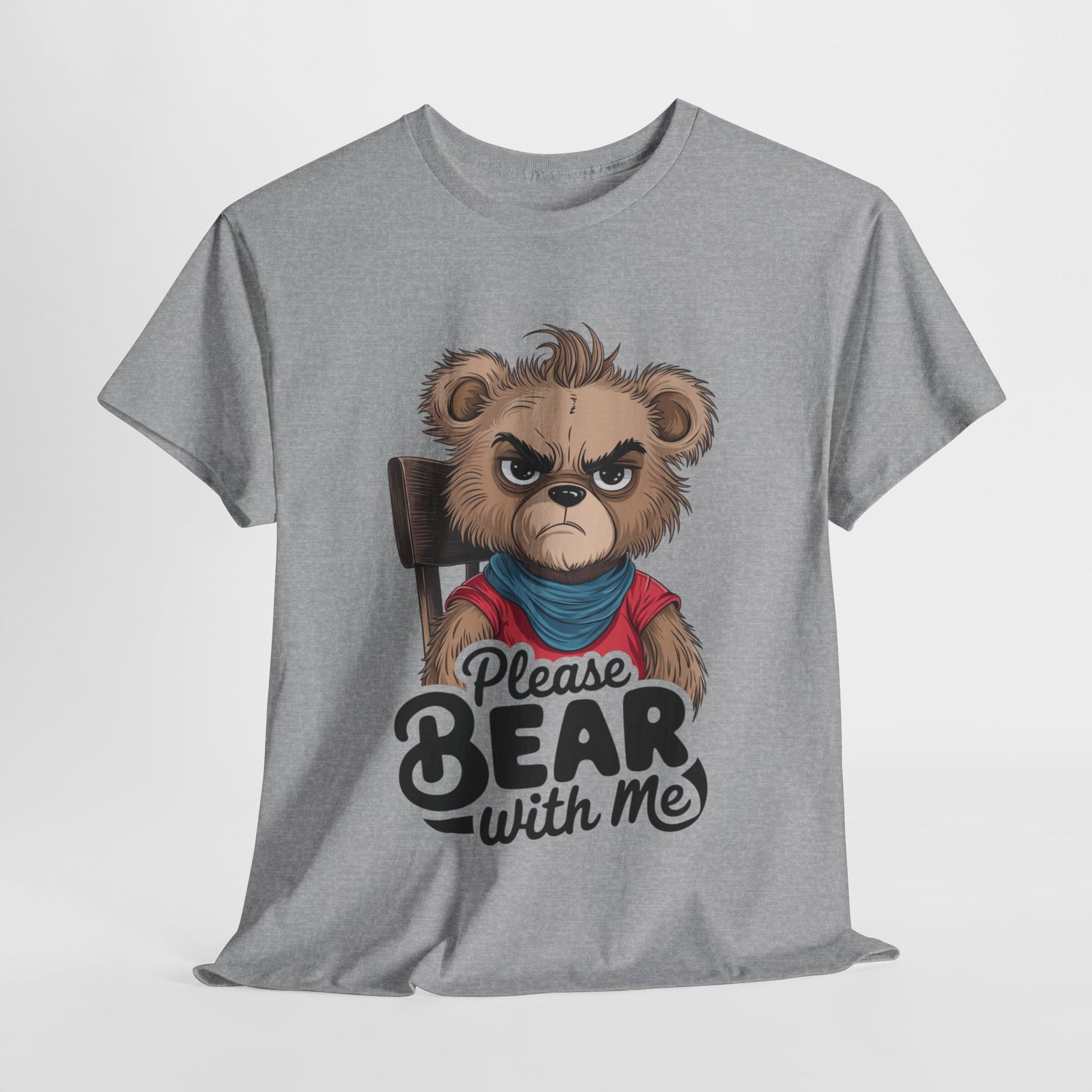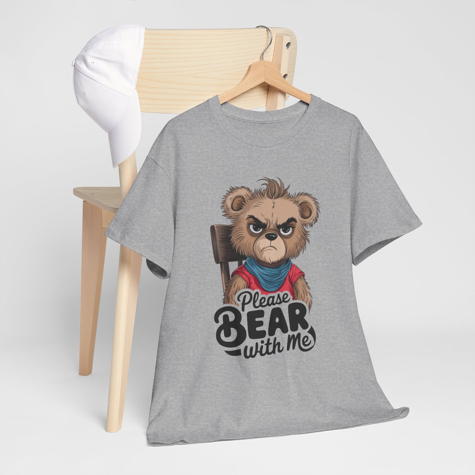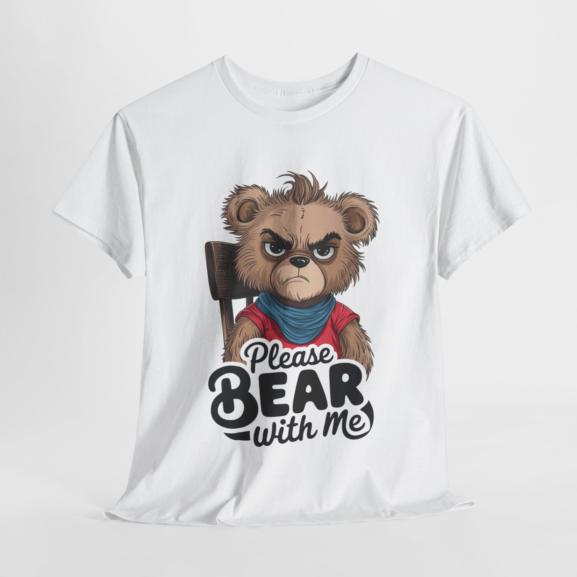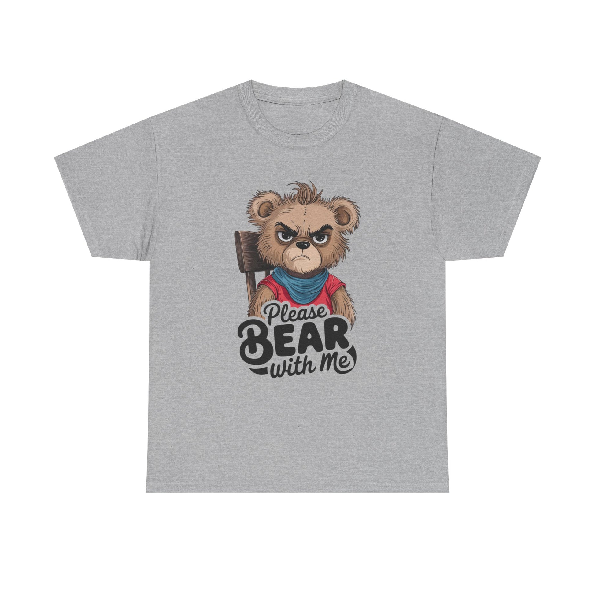 Bring home the grumpy bear who says it like it is—meet your new favorite sarcastic tee. This graphic T‑shirt features a hilariously grumpy teddy bear illustration with bold text “Please Bear With Me”—perfect gift for anyone with a sense of humor and attitude.