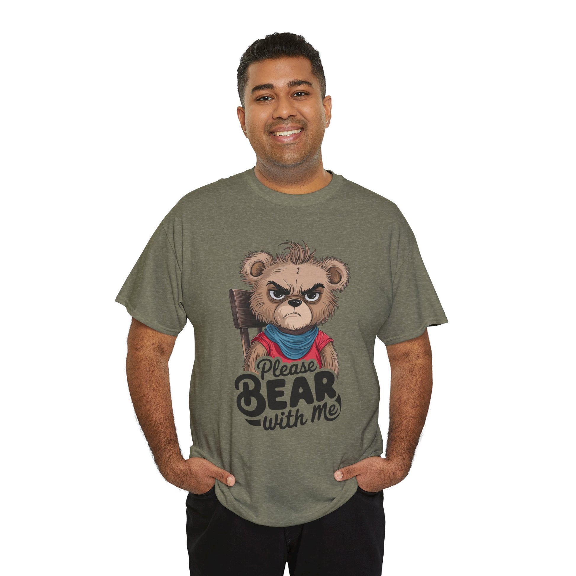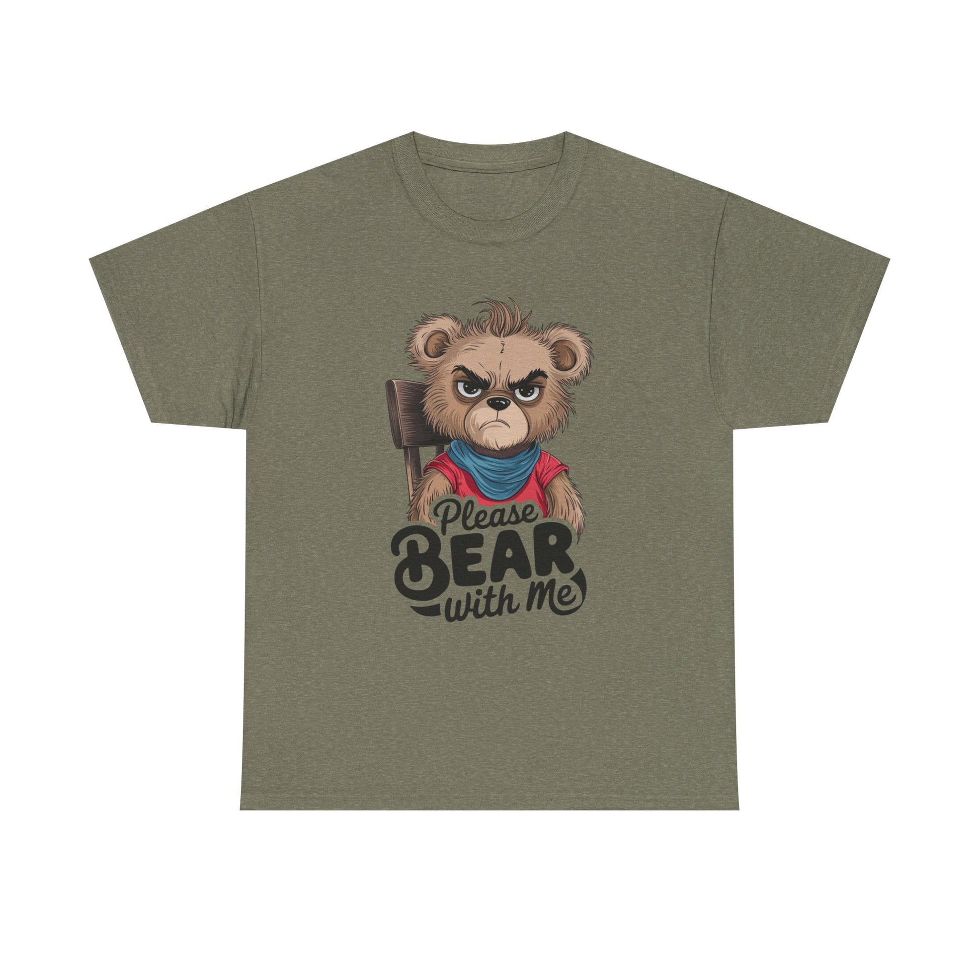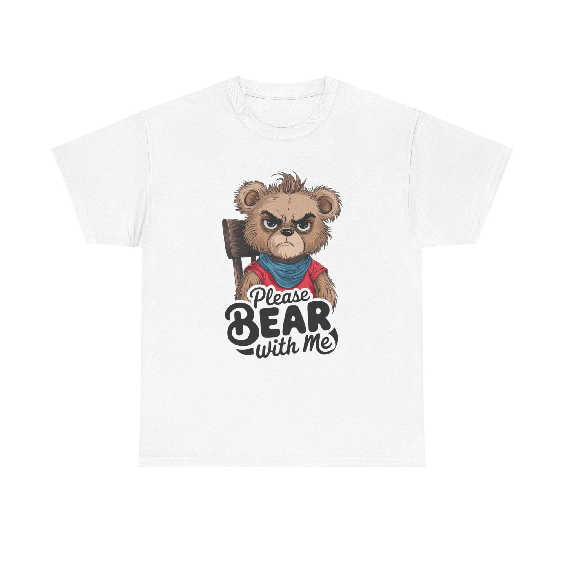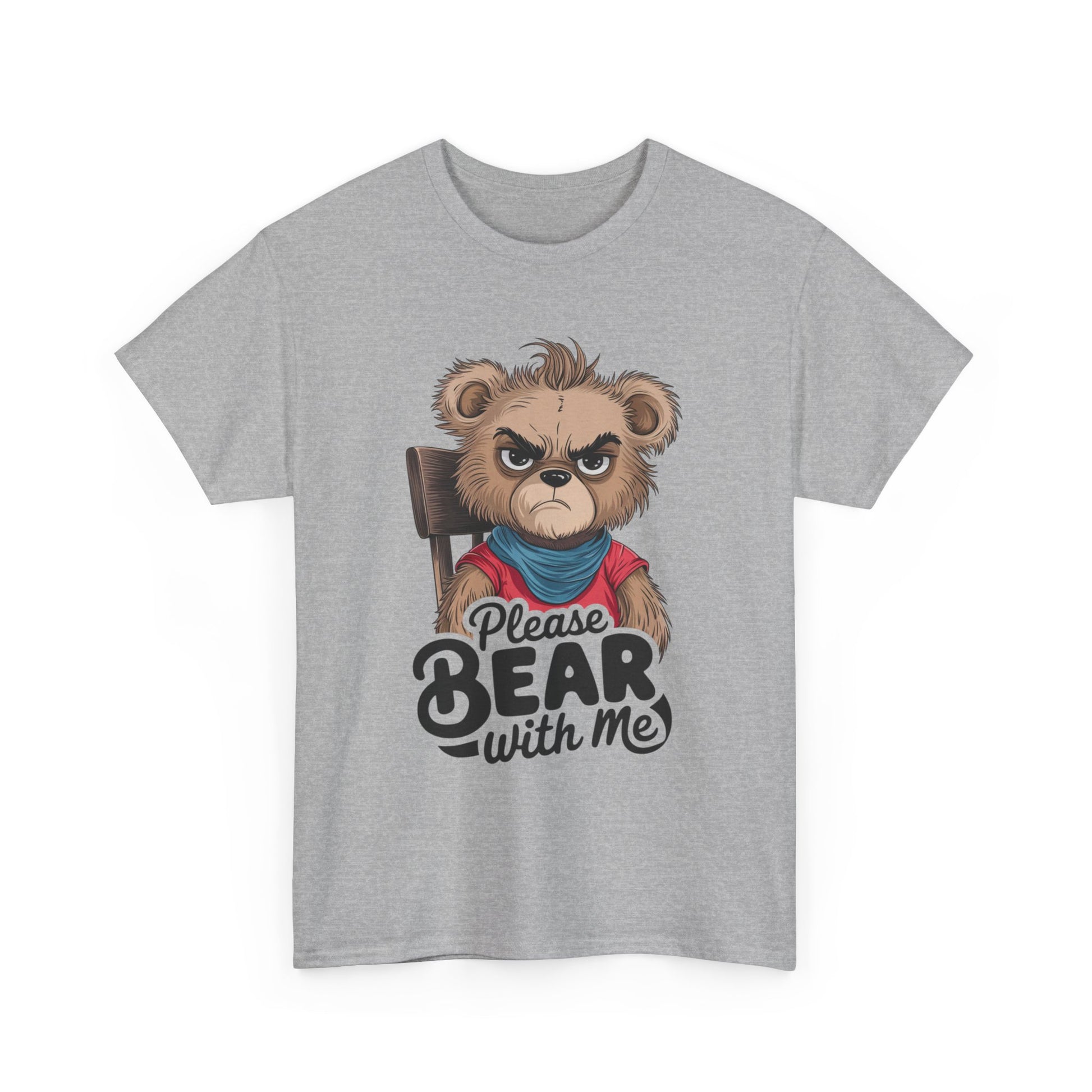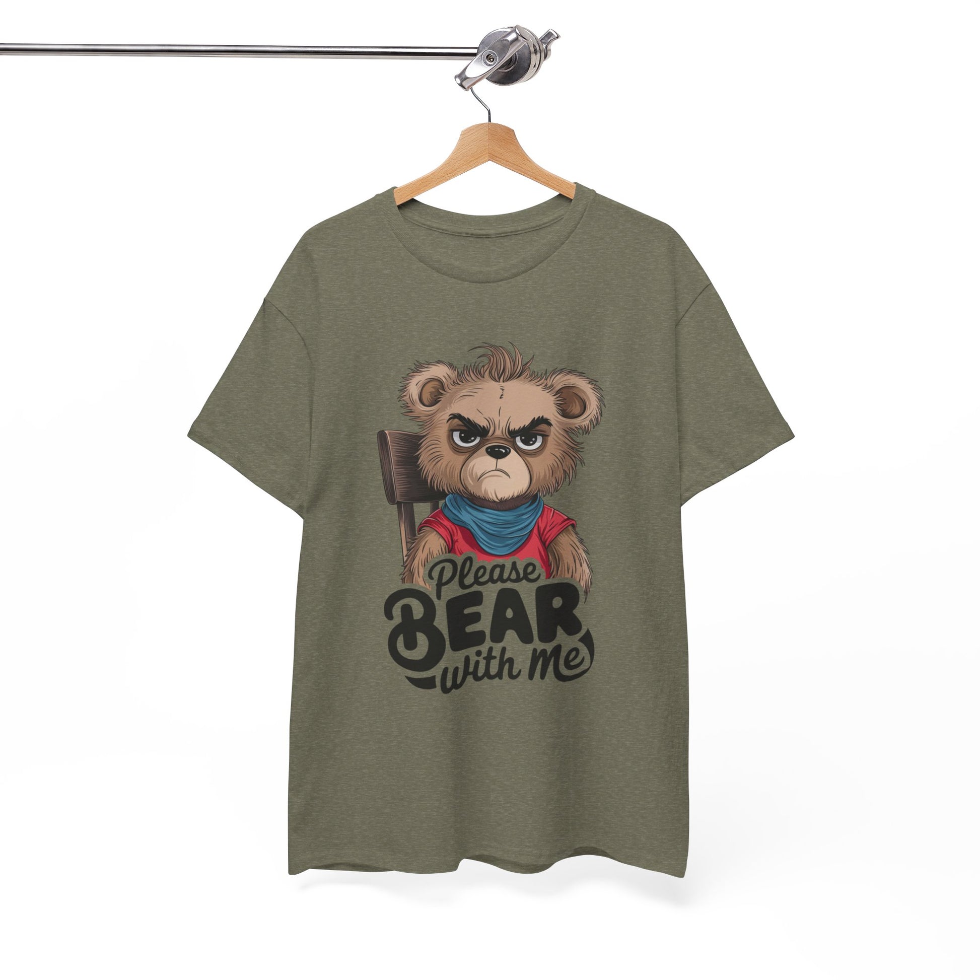 Bring home the grumpy bear who says it like it is—meet your new favorite sarcastic tee. This graphic T‑shirt features a hilariously grumpy teddy bear illustration with bold text “Please Bear With Me”—perfect gift for anyone with a sense of humor and attitude.