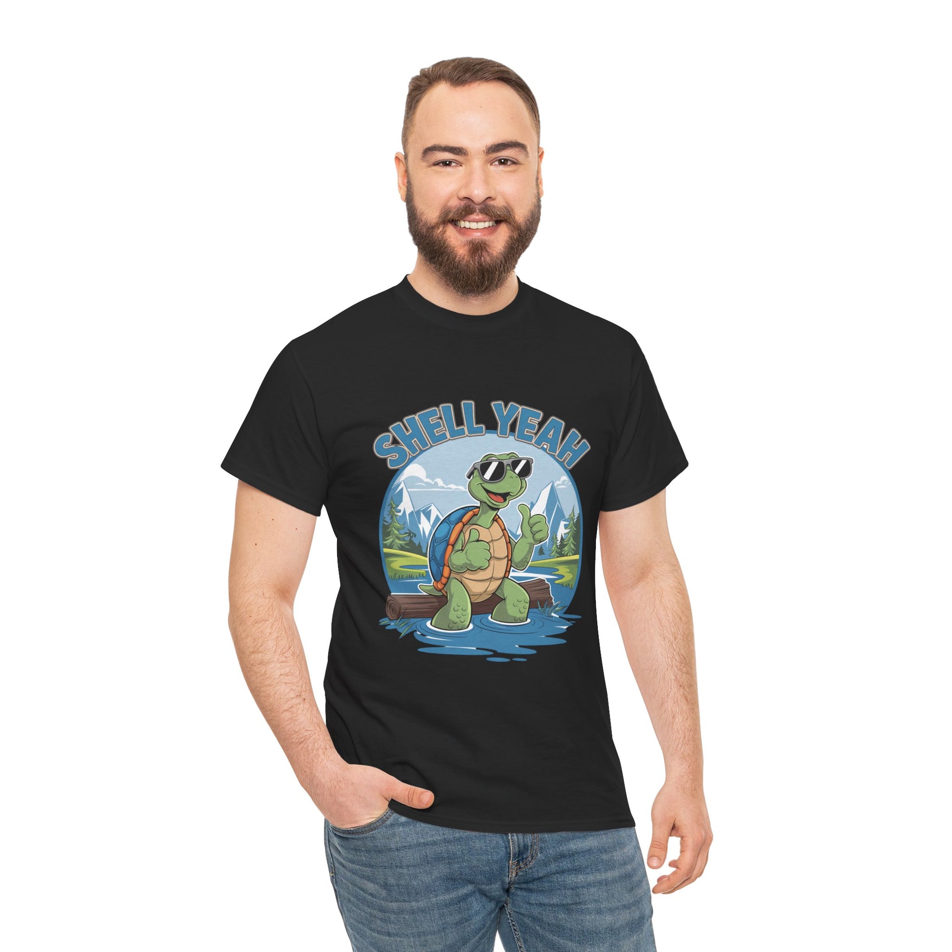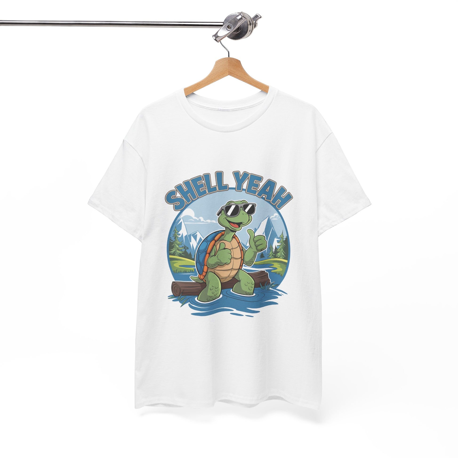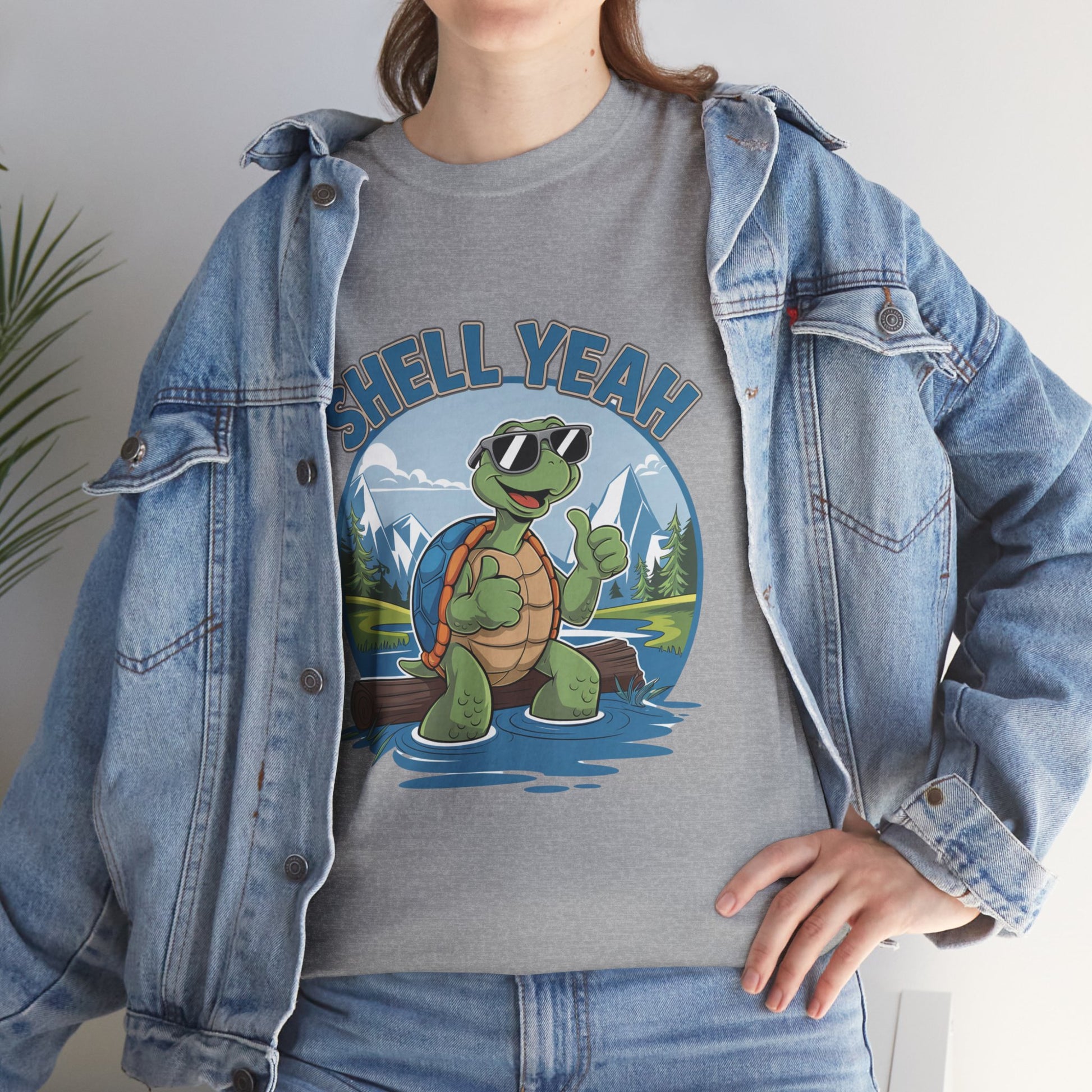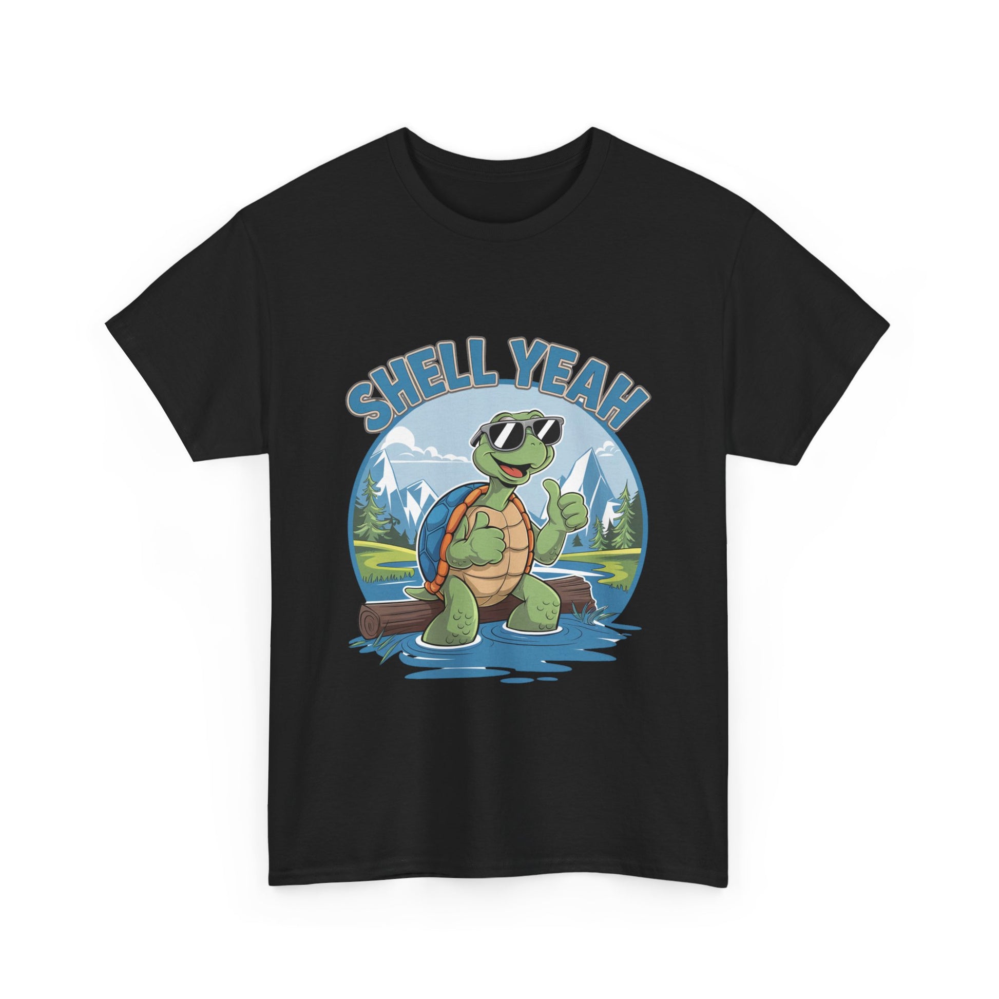 - Discover your new favorite tee with this “SHELL YEAH Turtle T‑Shirt”, a perfect blend of humor and nature-inspired fun. Featuring a laid-back turtle wearing sunglasses and giving a thumbs‑up—set against a scenic lake and mountain backdrop—this design brings joy and adventure vibes wherever you go.