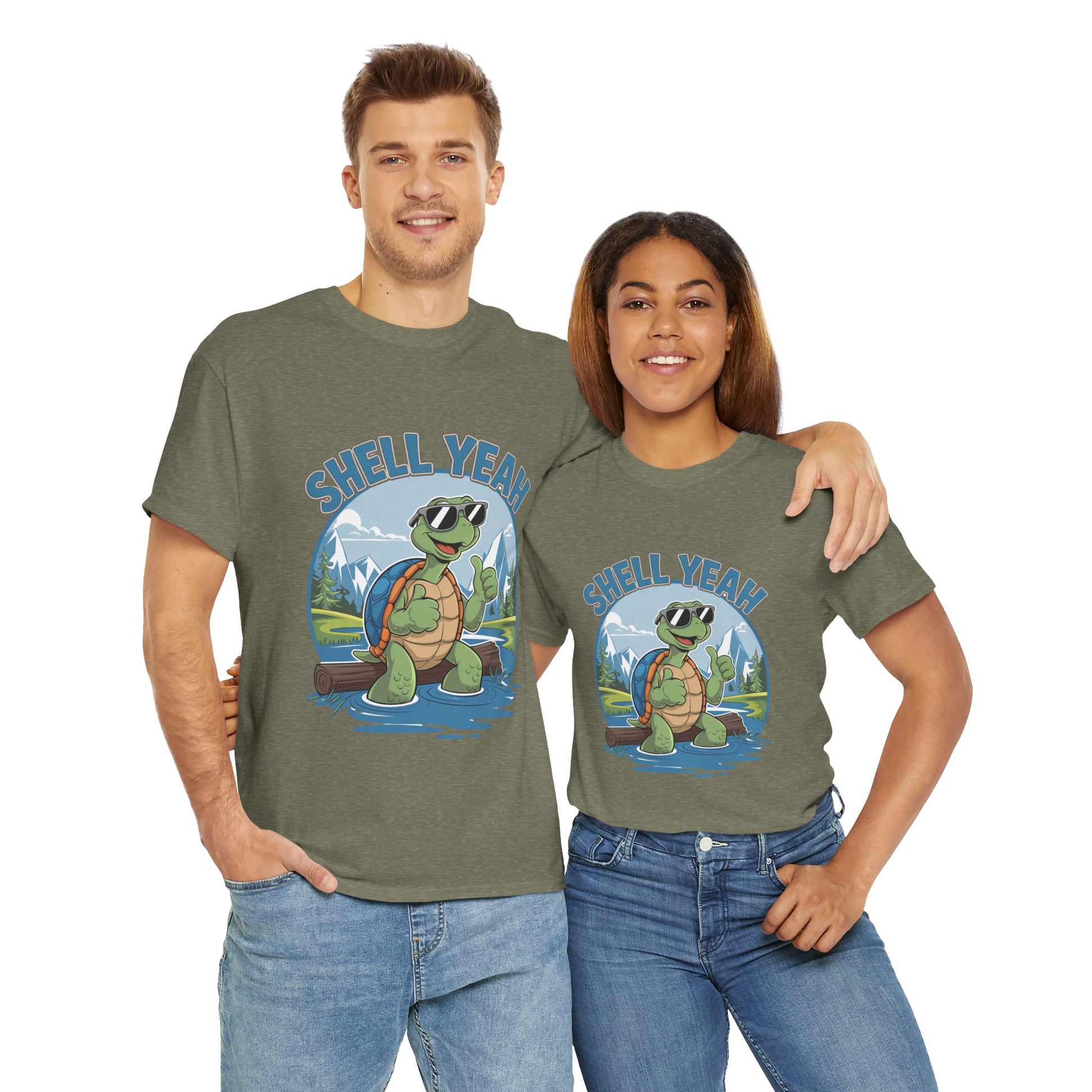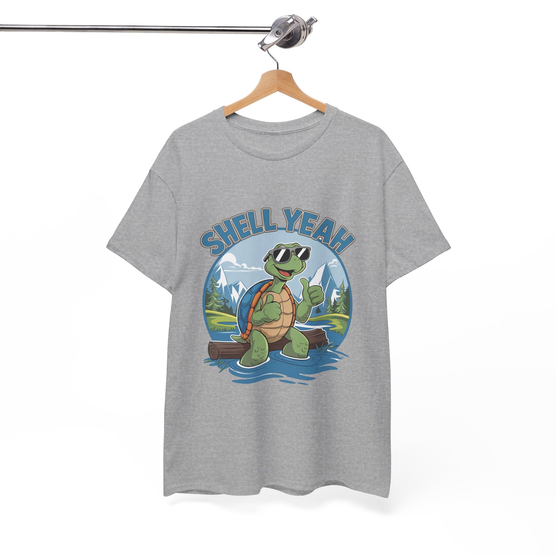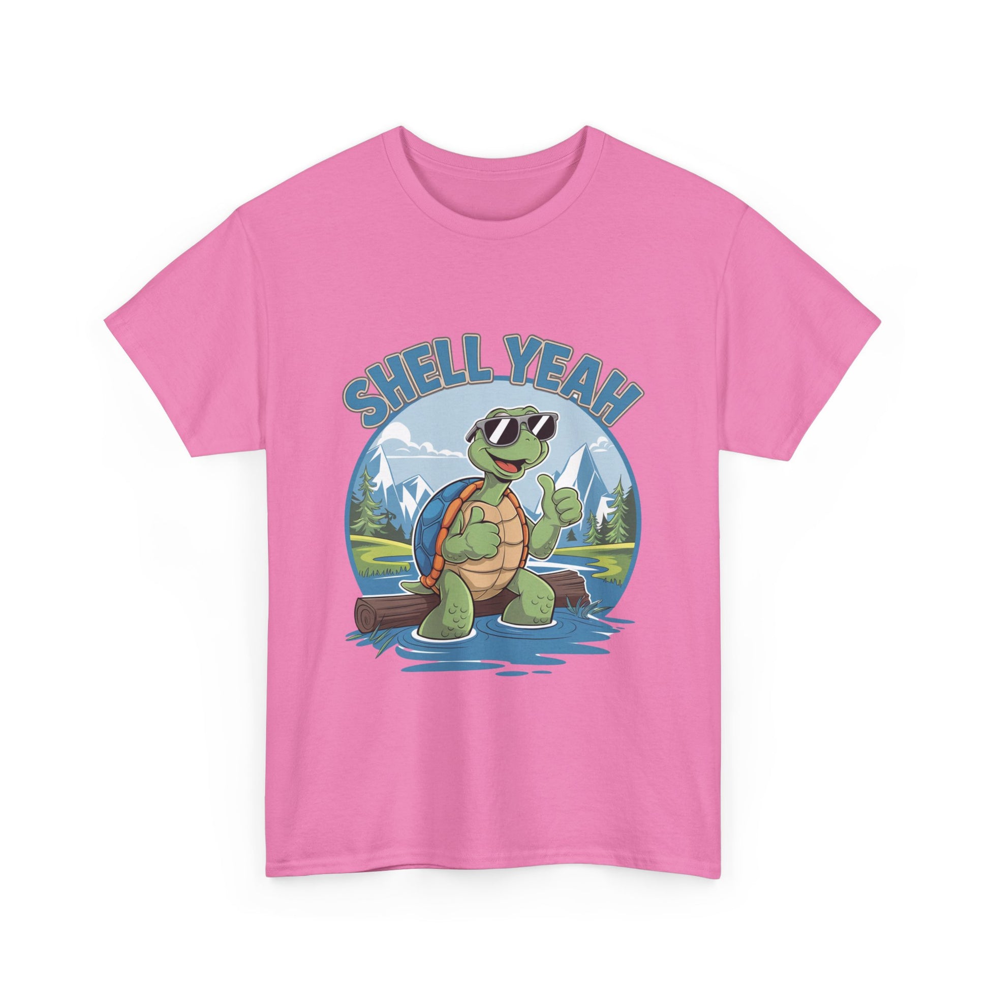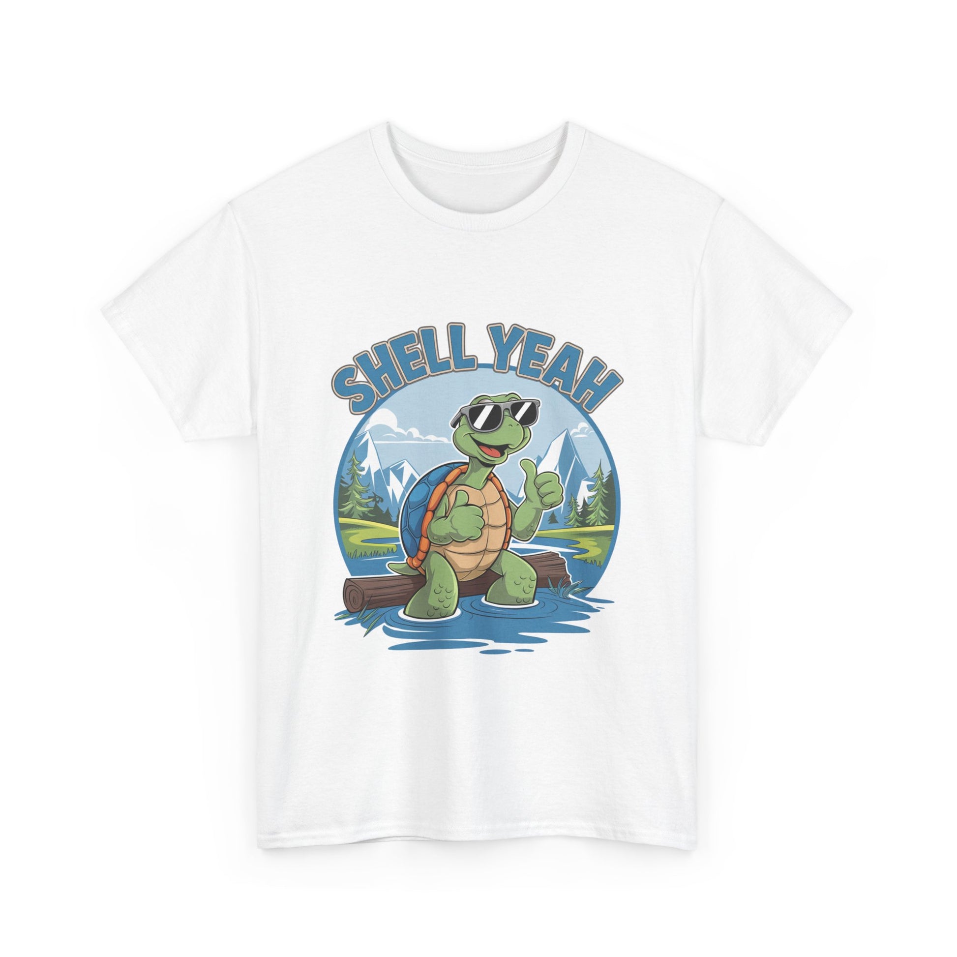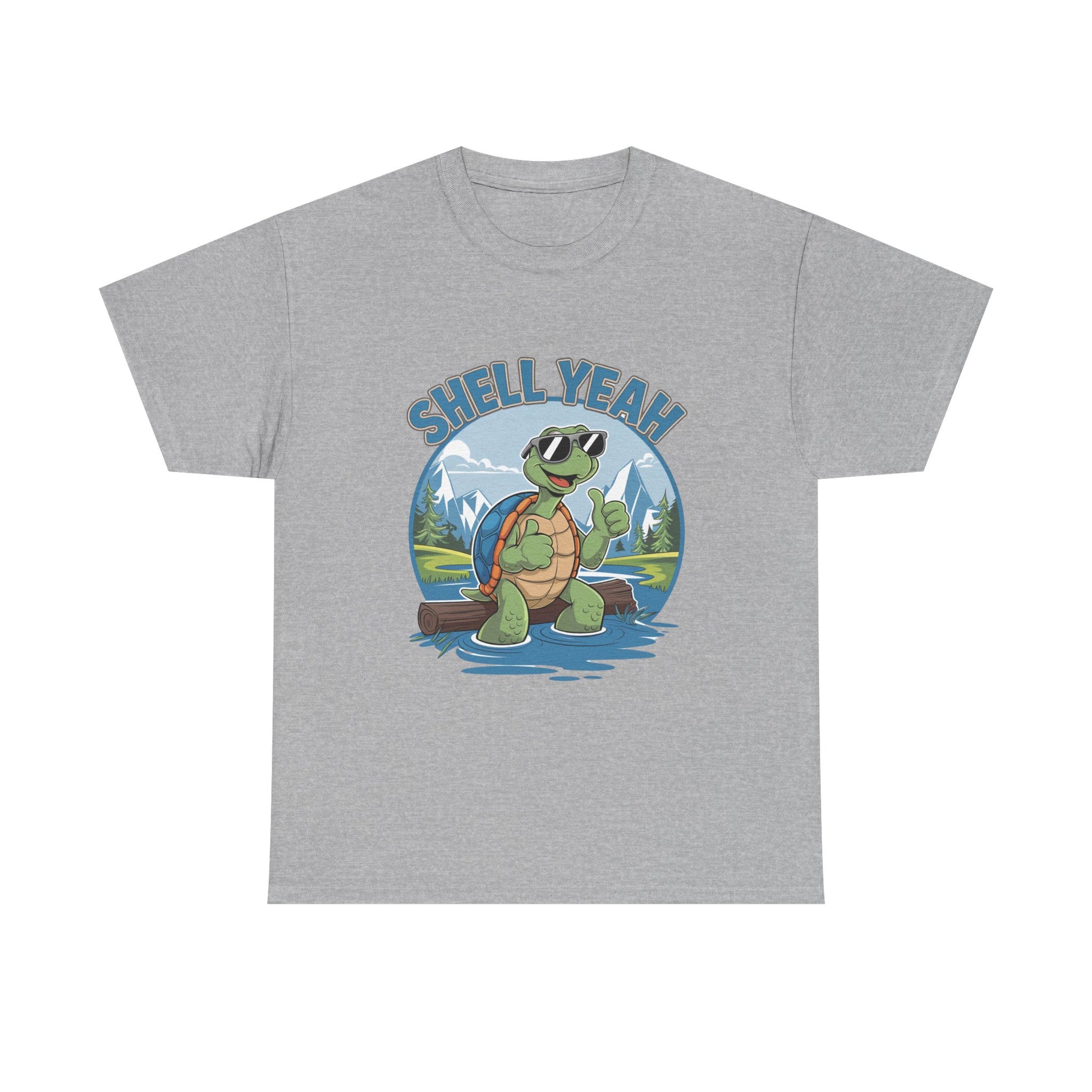 - Discover your new favorite tee with this “SHELL YEAH Turtle T‑Shirt”, a perfect blend of humor and nature-inspired fun. Featuring a laid-back turtle wearing sunglasses and giving a thumbs‑up—set against a scenic lake and mountain backdrop—this design brings joy and adventure vibes wherever you go.