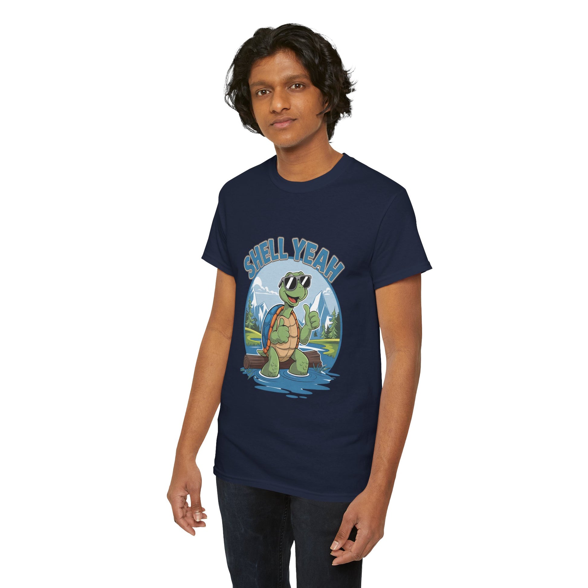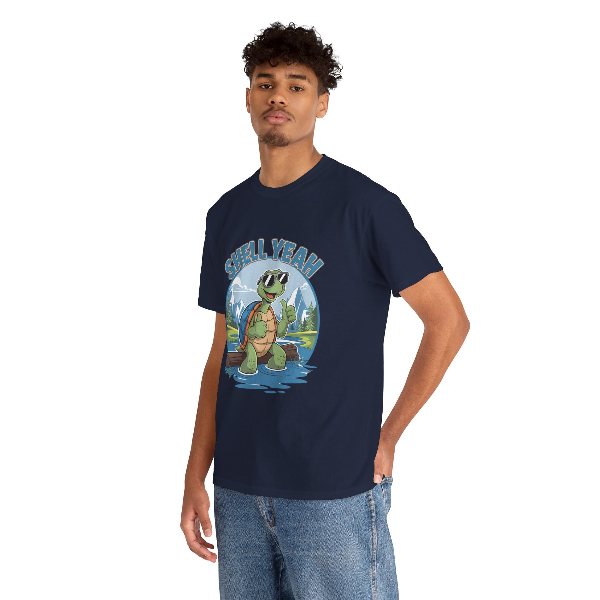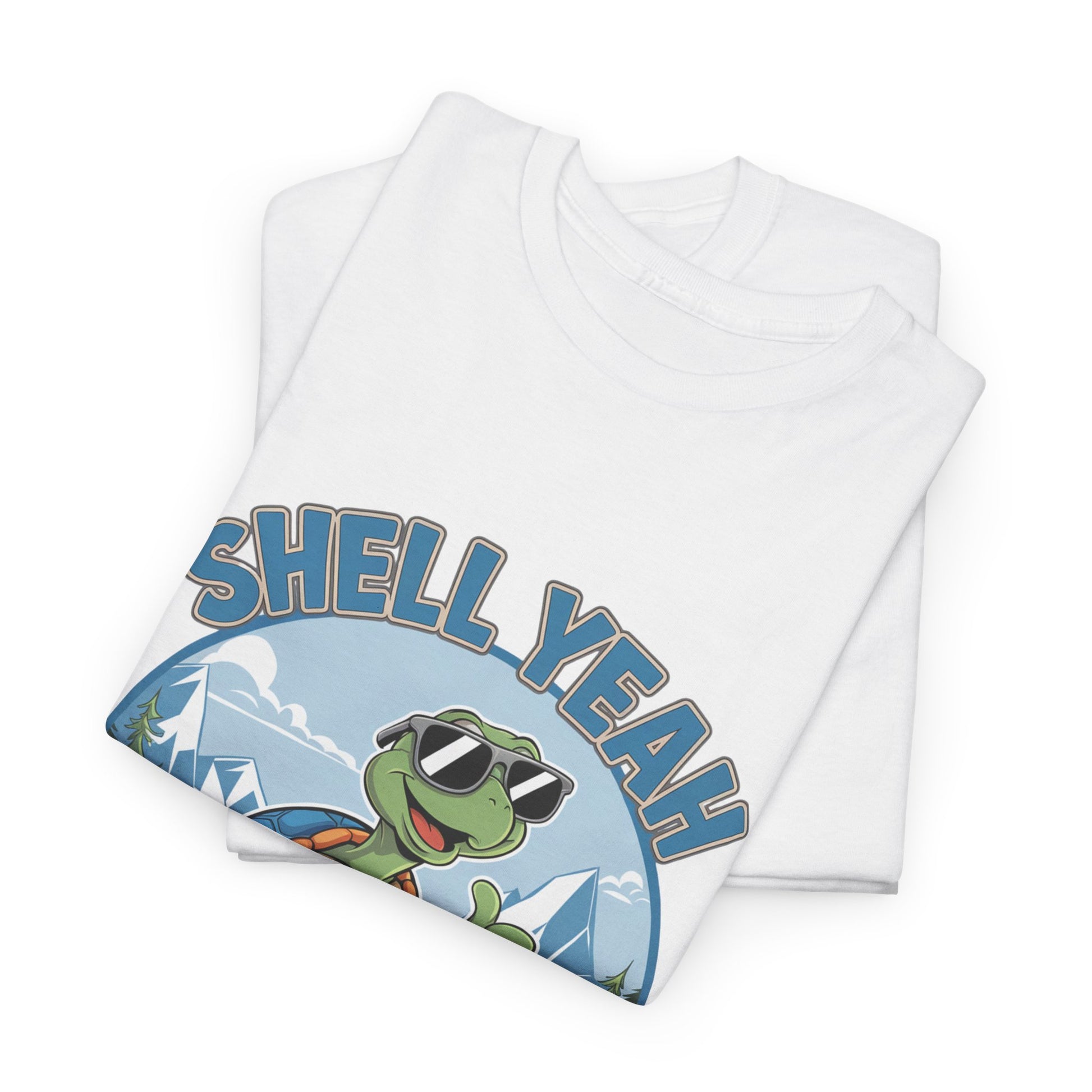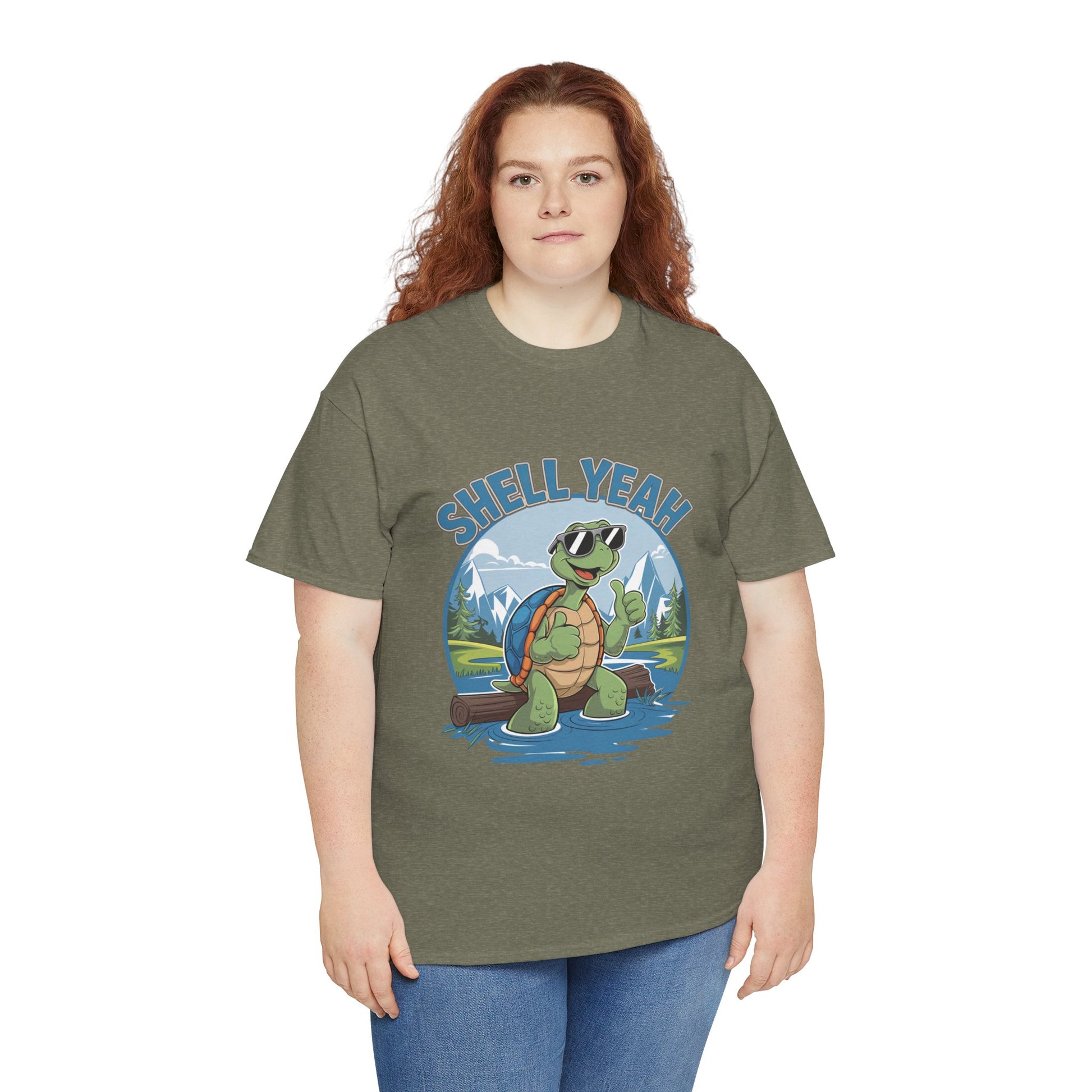 - Discover your new favorite tee with this “SHELL YEAH Turtle T‑Shirt”, a perfect blend of humor and nature-inspired fun. Featuring a laid-back turtle wearing sunglasses and giving a thumbs‑up—set against a scenic lake and mountain backdrop—this design brings joy and adventure vibes wherever you go.