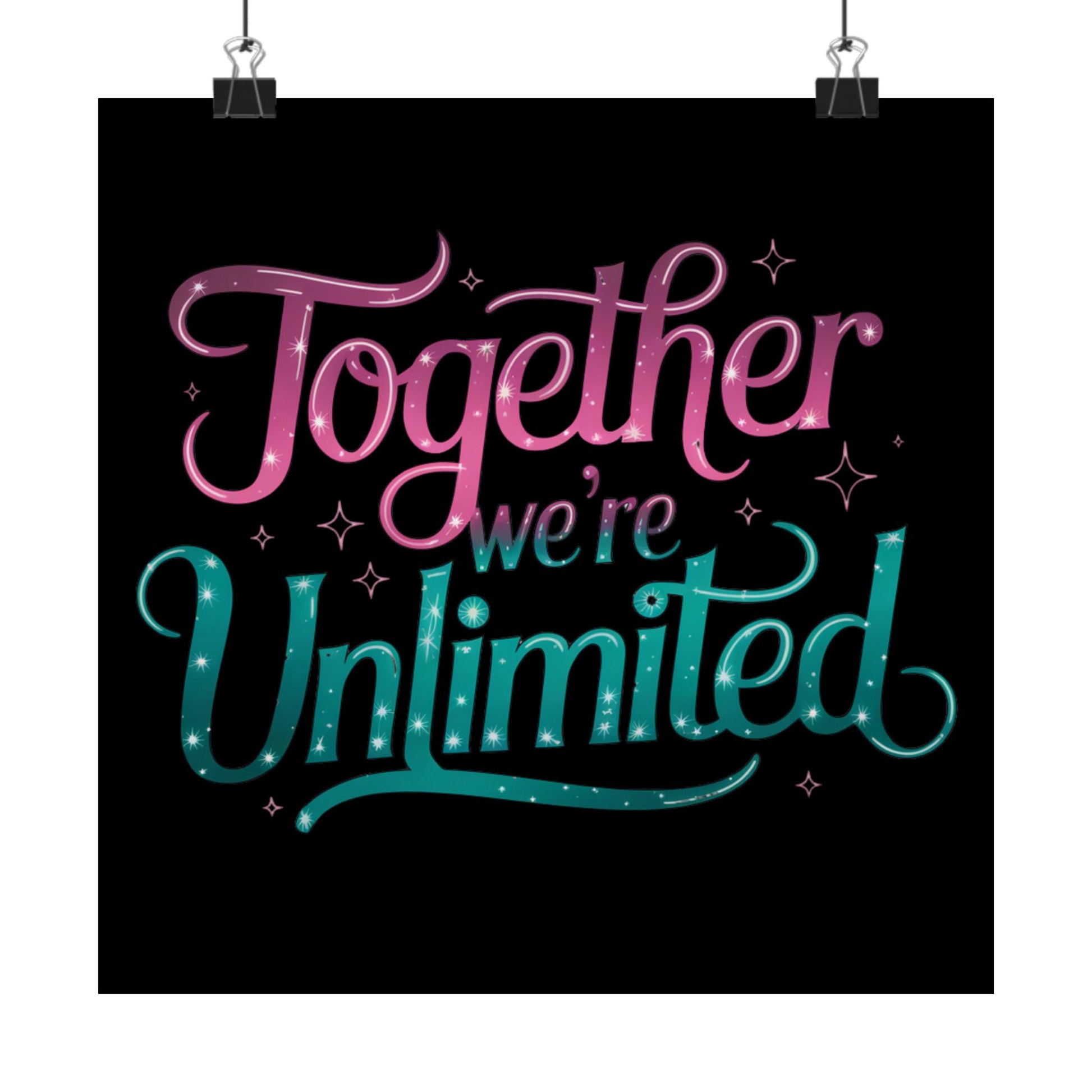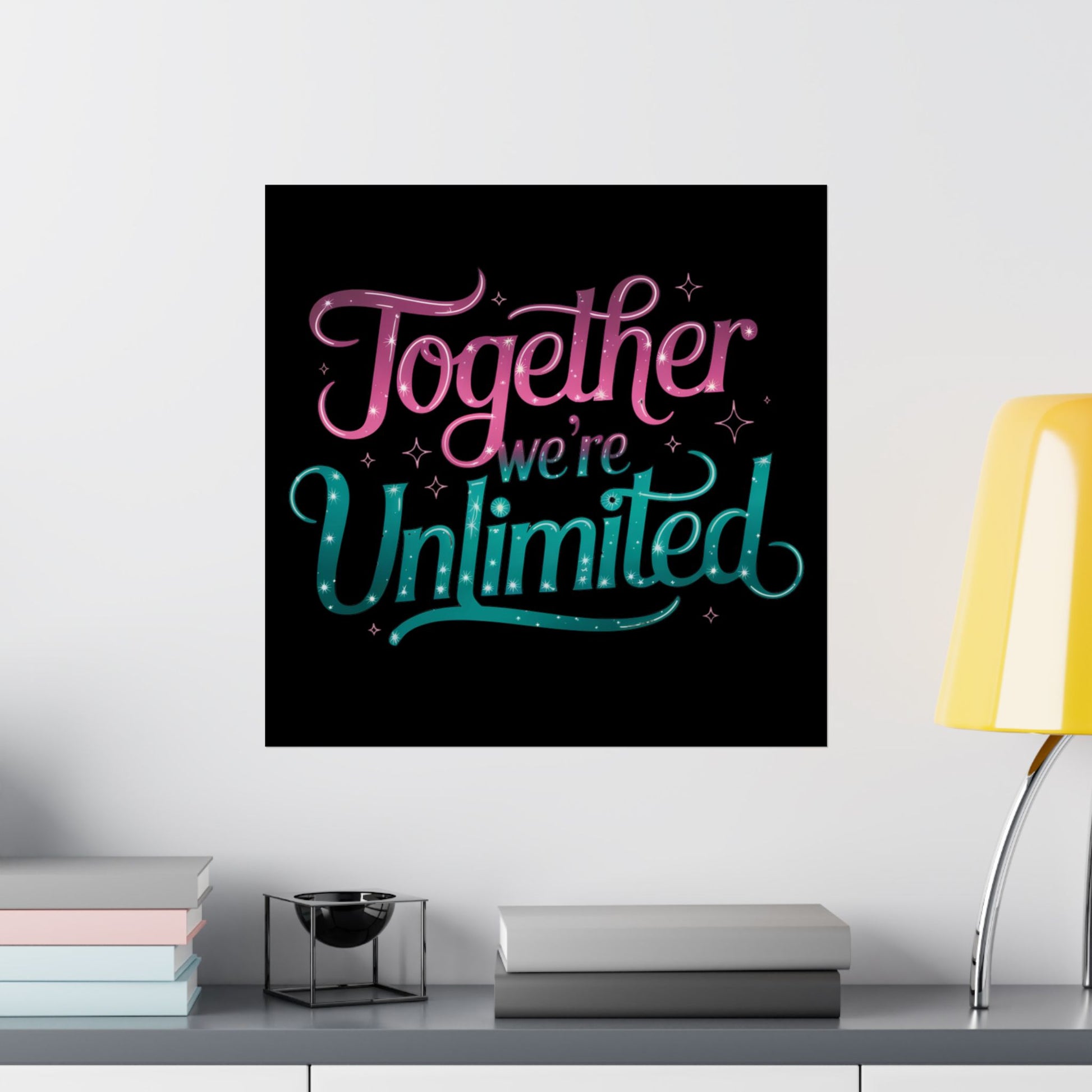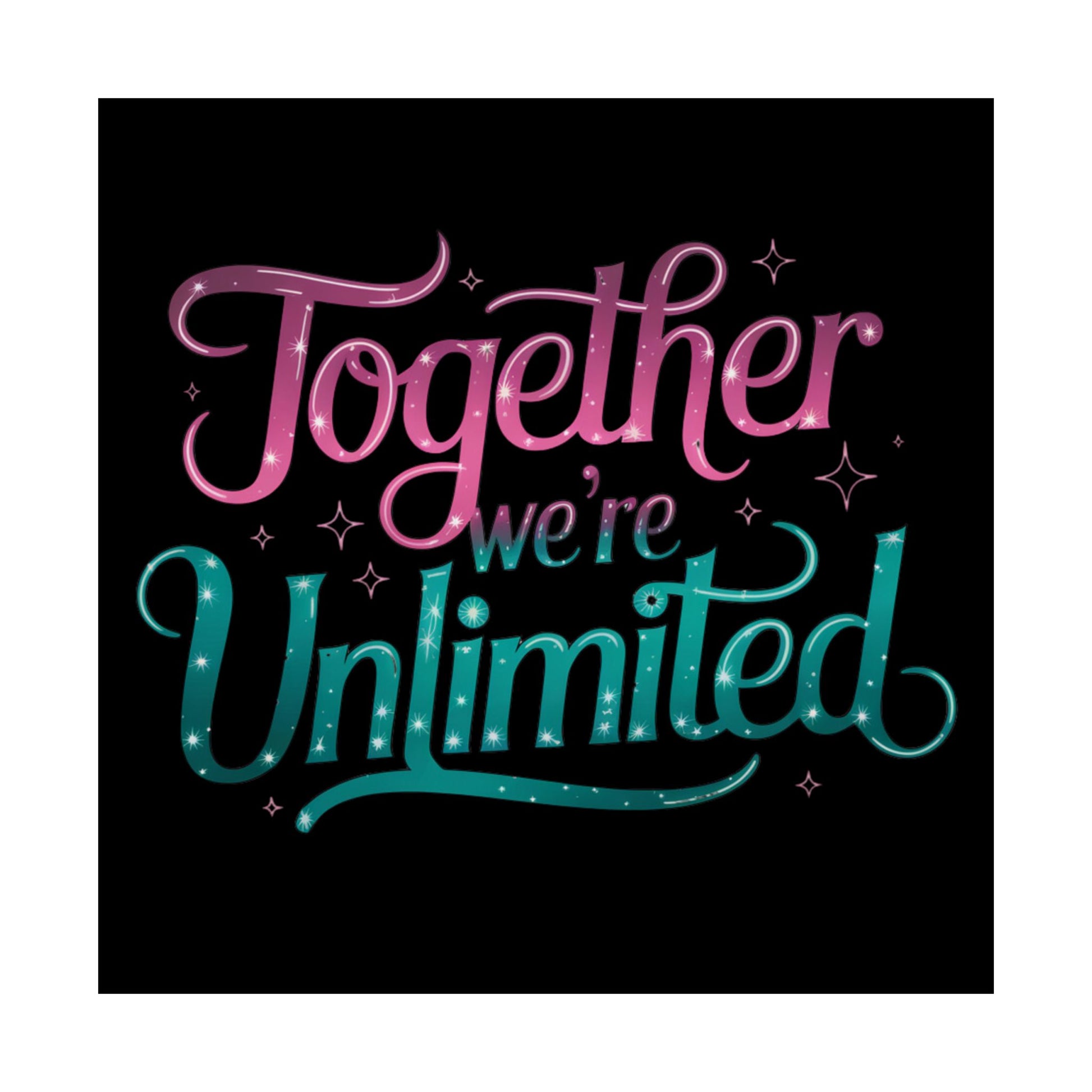 Celebrate the magic of connection with this "Together We're Unlimited" poster, inspired by the powerful friendship anthem from the beloved musical Wicked. Featuring whimsical pink and teal typography set against a bold black background, this enchanting design brings Broadway vibes and inspirational energy to any room.