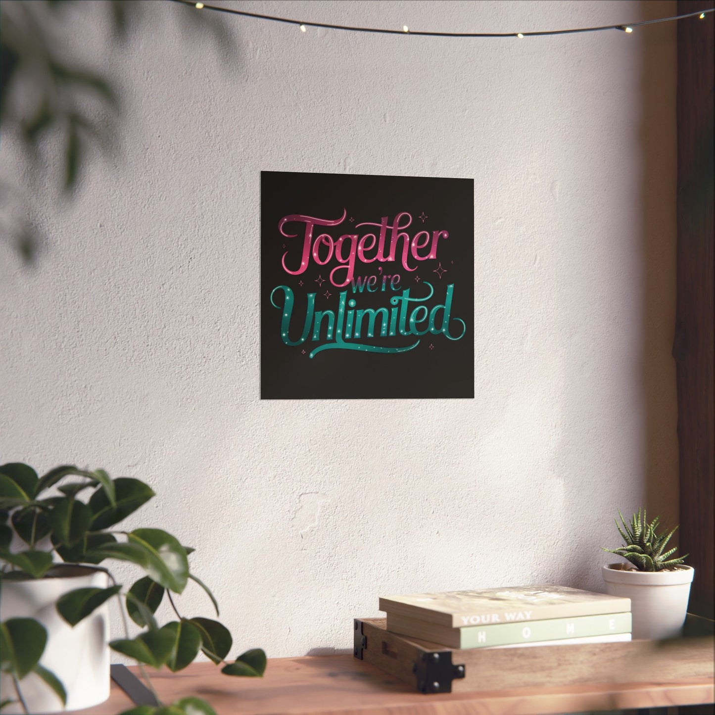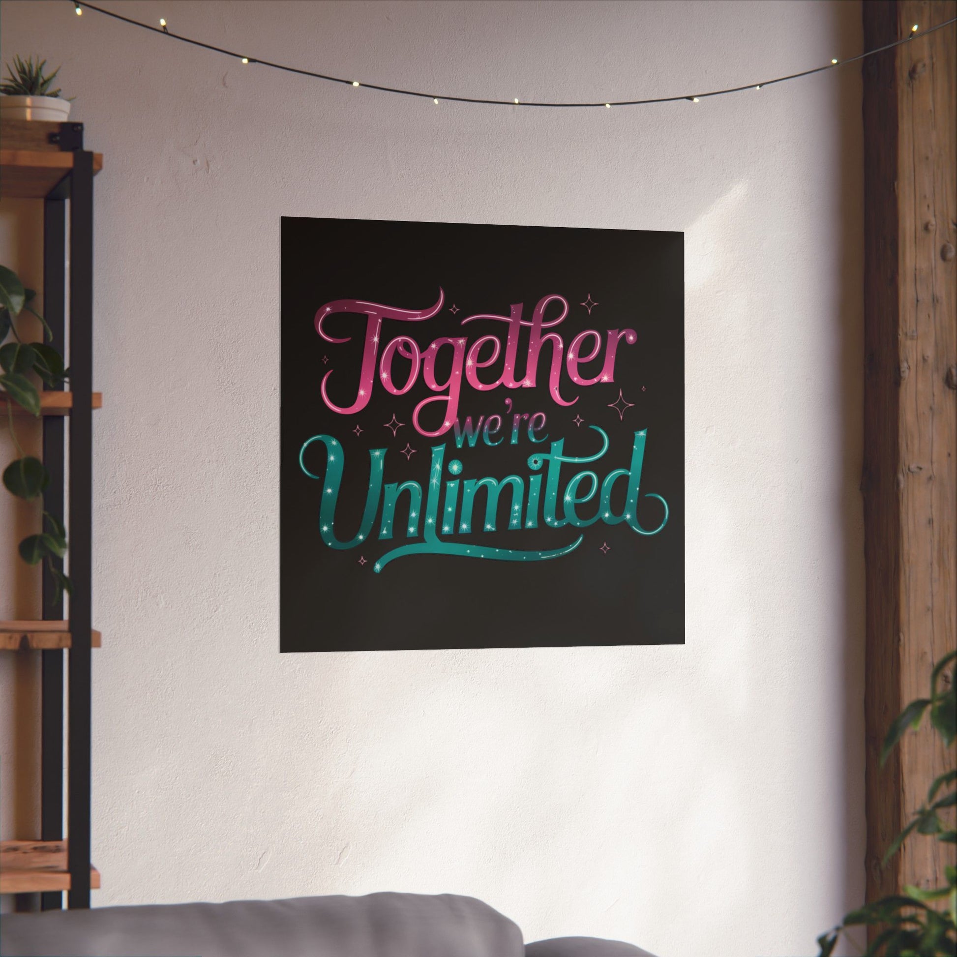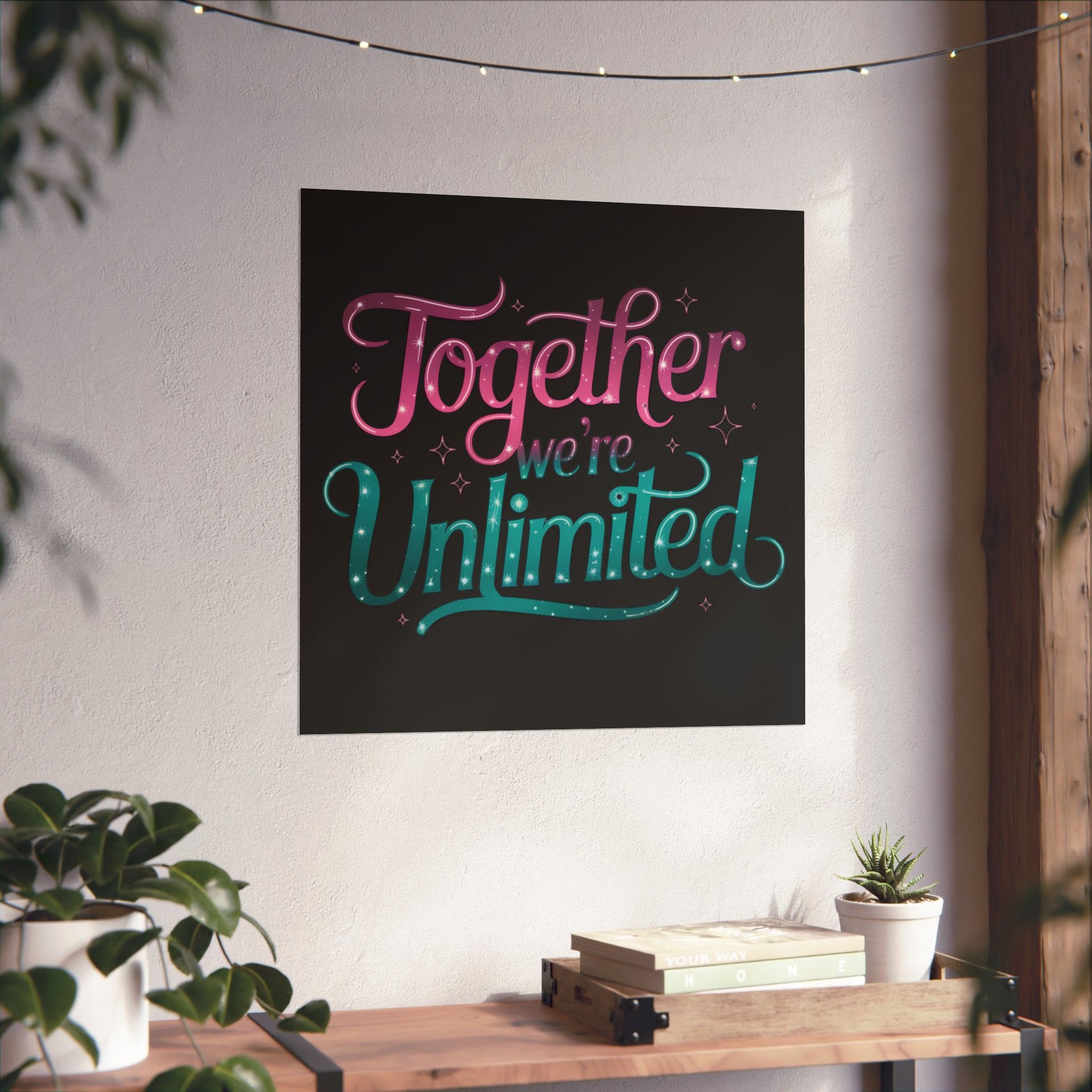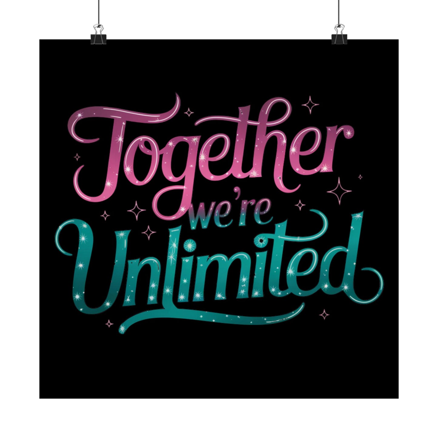 Celebrate the magic of connection with this "Together We're Unlimited" poster, inspired by the powerful friendship anthem from the beloved musical Wicked. Featuring whimsical pink and teal typography set against a bold black background, this enchanting design brings Broadway vibes and inspirational energy to any room.