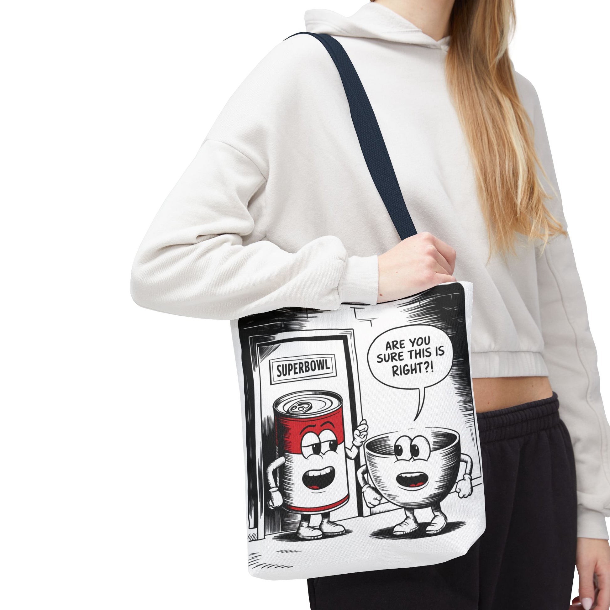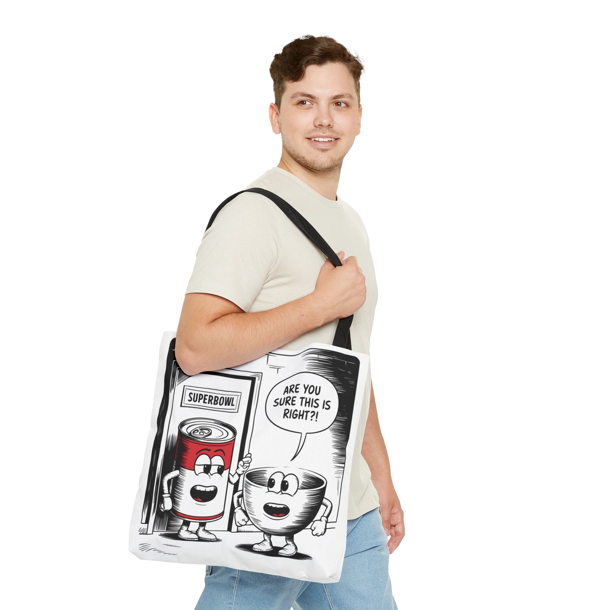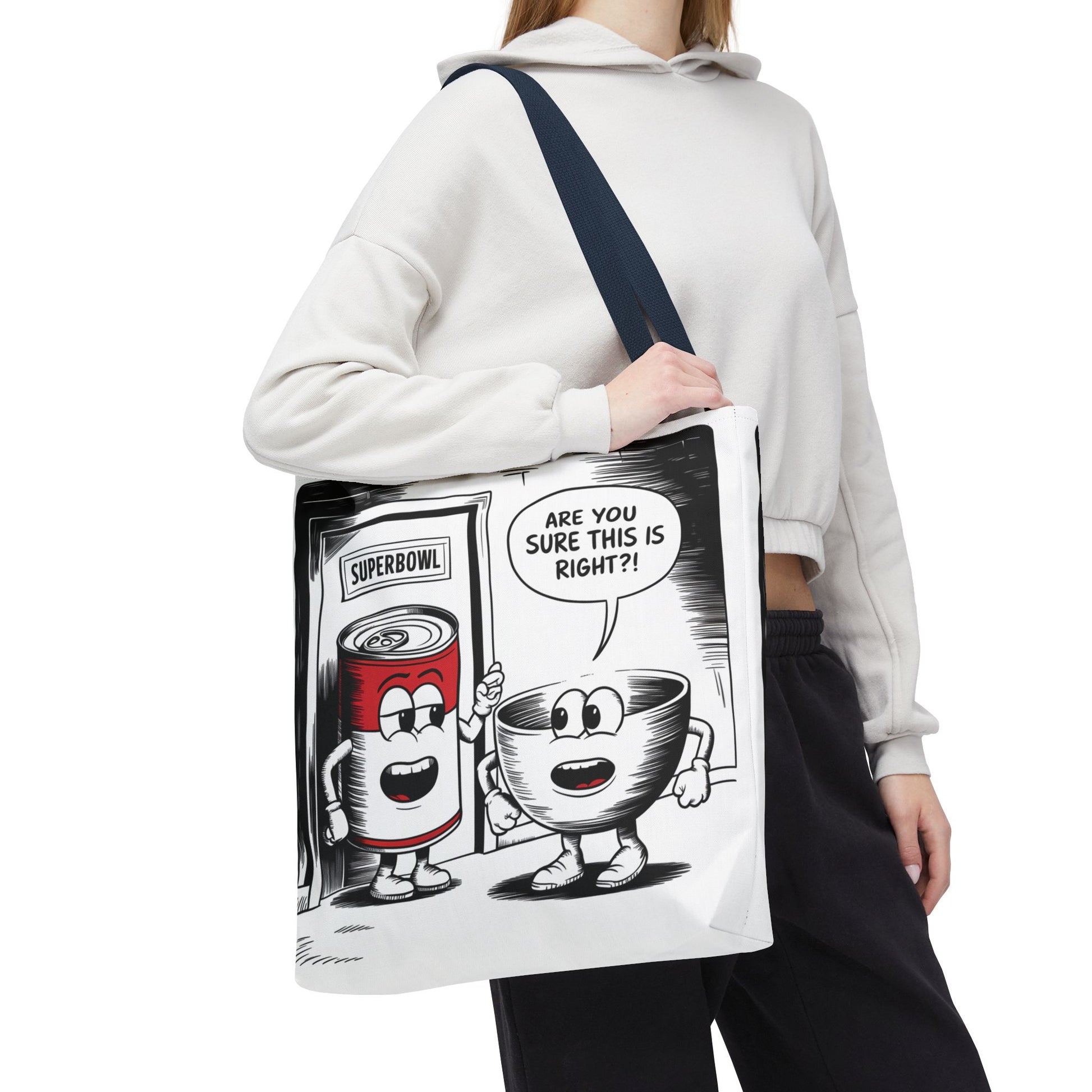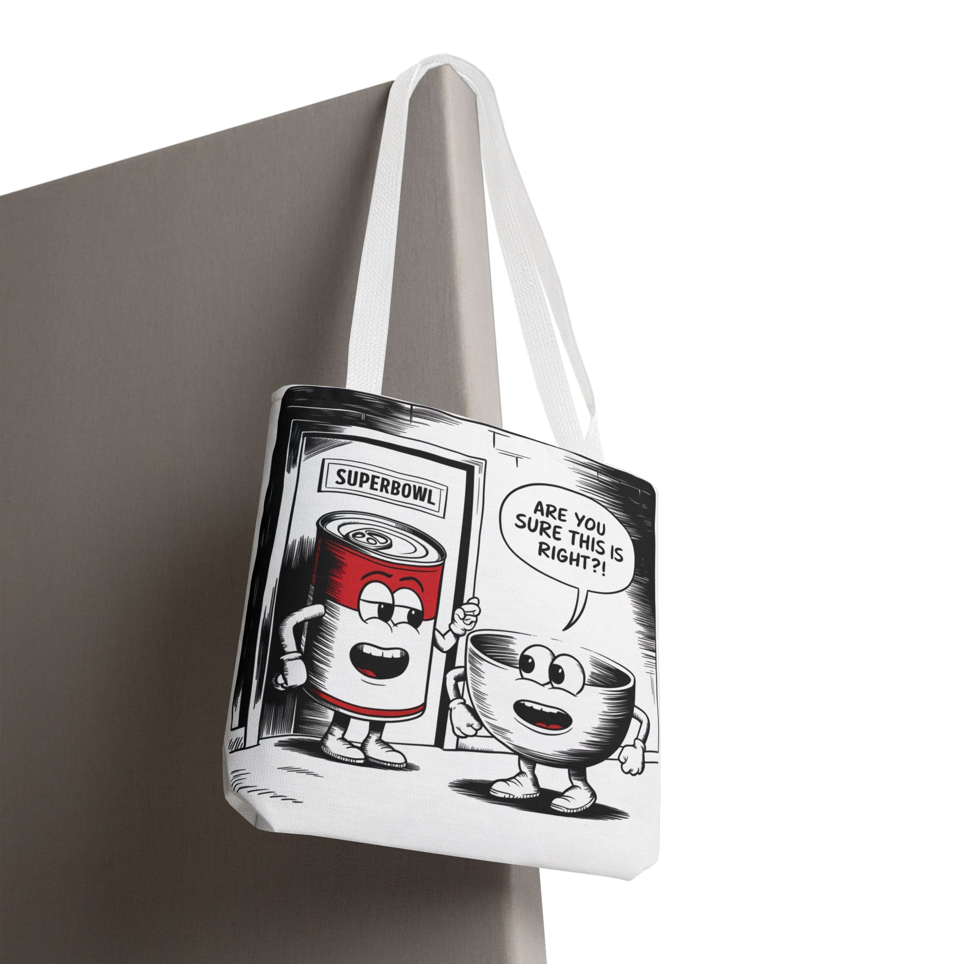This Tote Bag features a fun comic design with a can of soup and a bowl about to enter a door labeled 'Superbowl'. It gives off a playful and humorous vibe, perfect for those who enjoy quirky and unique accessories. It is relevant for Superbowl parties, football fans, soup lovers, and anyone looking to add a touch of fun to their everyday essentials.