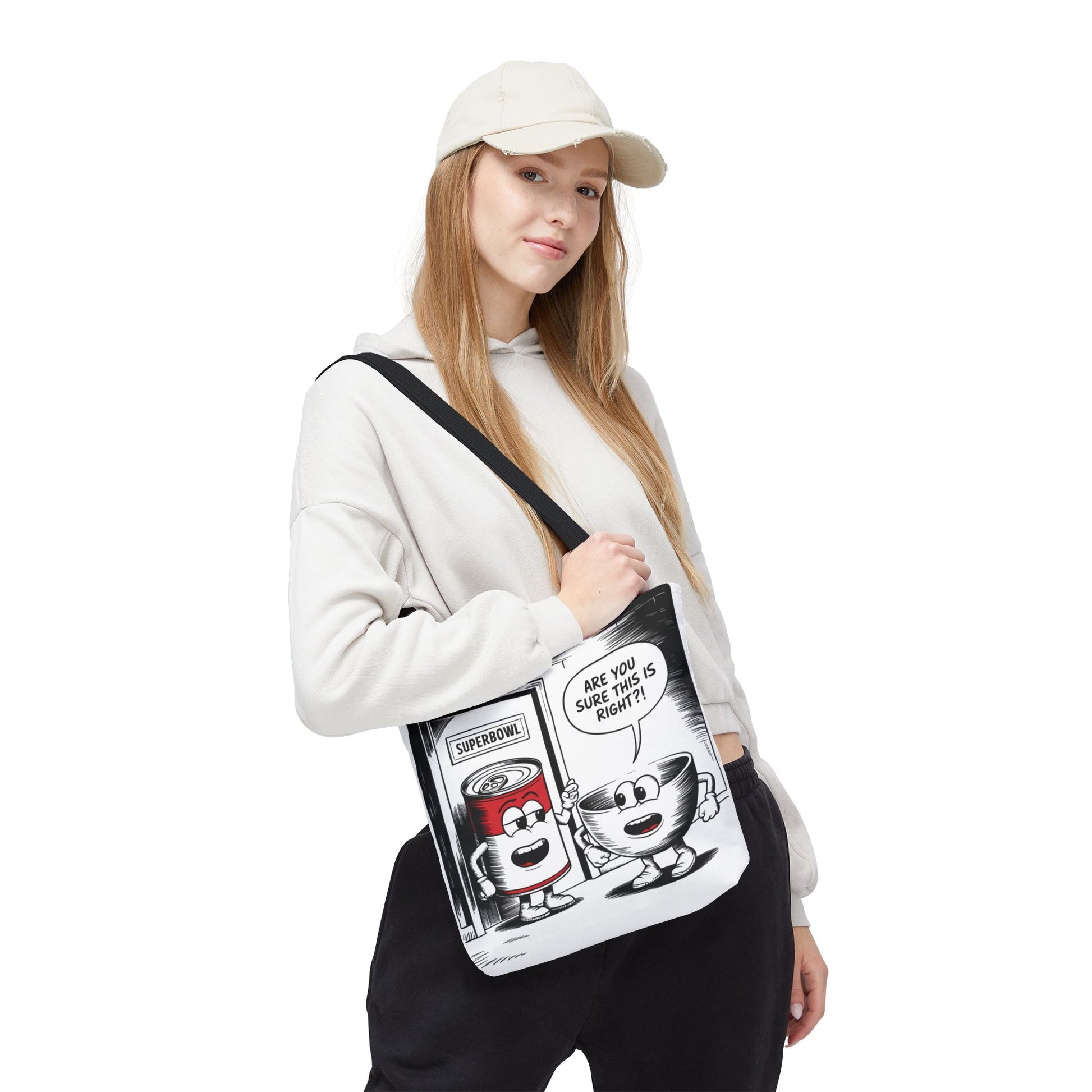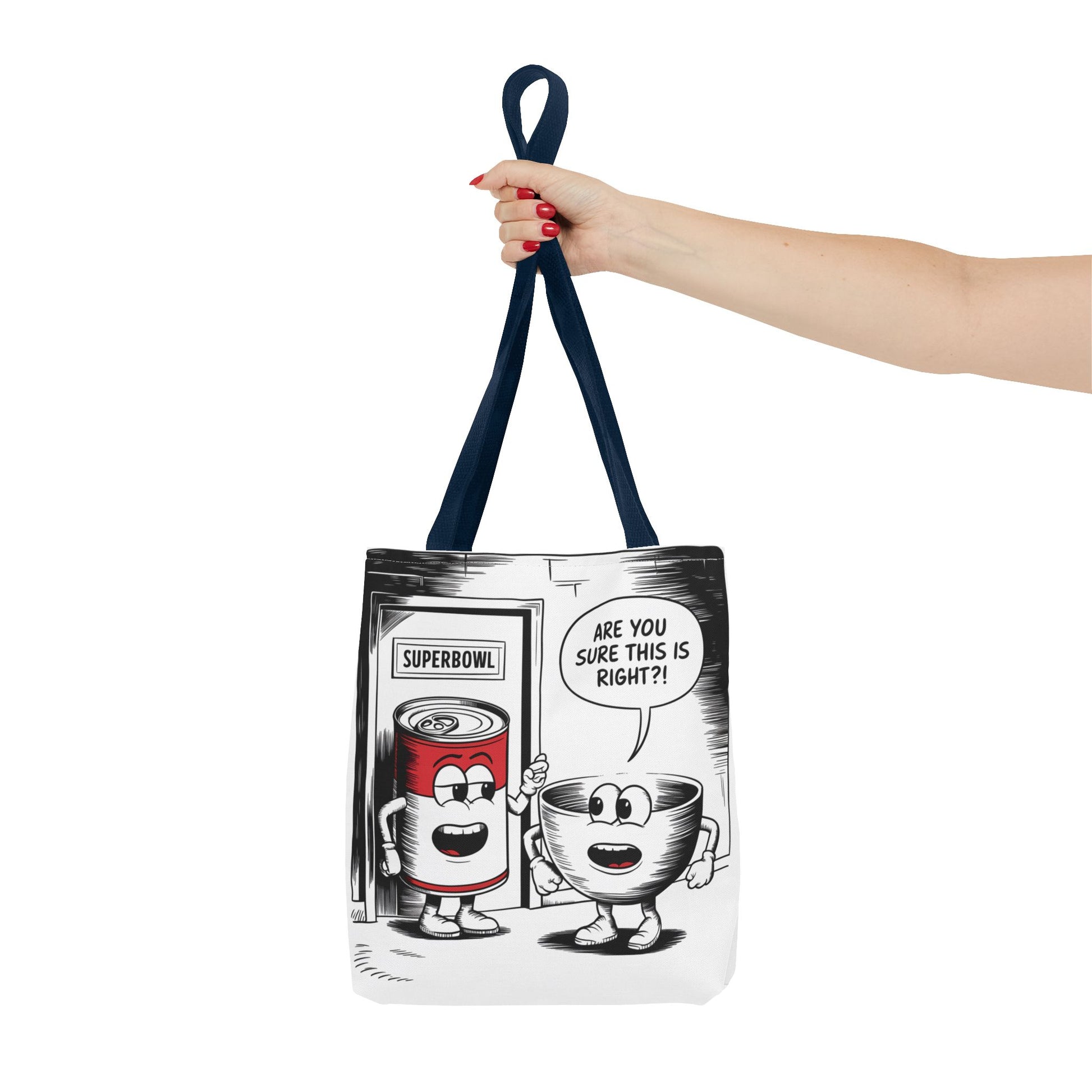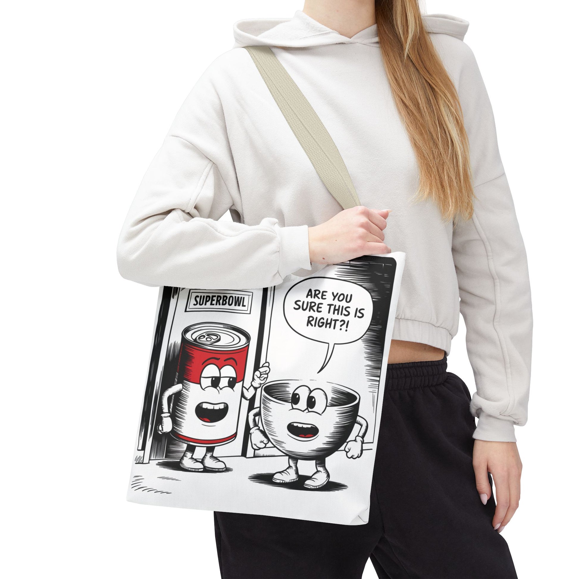 This Tote Bag features a fun comic design with a can of soup and a bowl about to enter a door labeled 'Superbowl'. It gives off a playful and humorous vibe, perfect for those who enjoy quirky and unique accessories. It is relevant for Superbowl parties, football fans, soup lovers, and anyone looking to add a touch of fun to their everyday essentials.