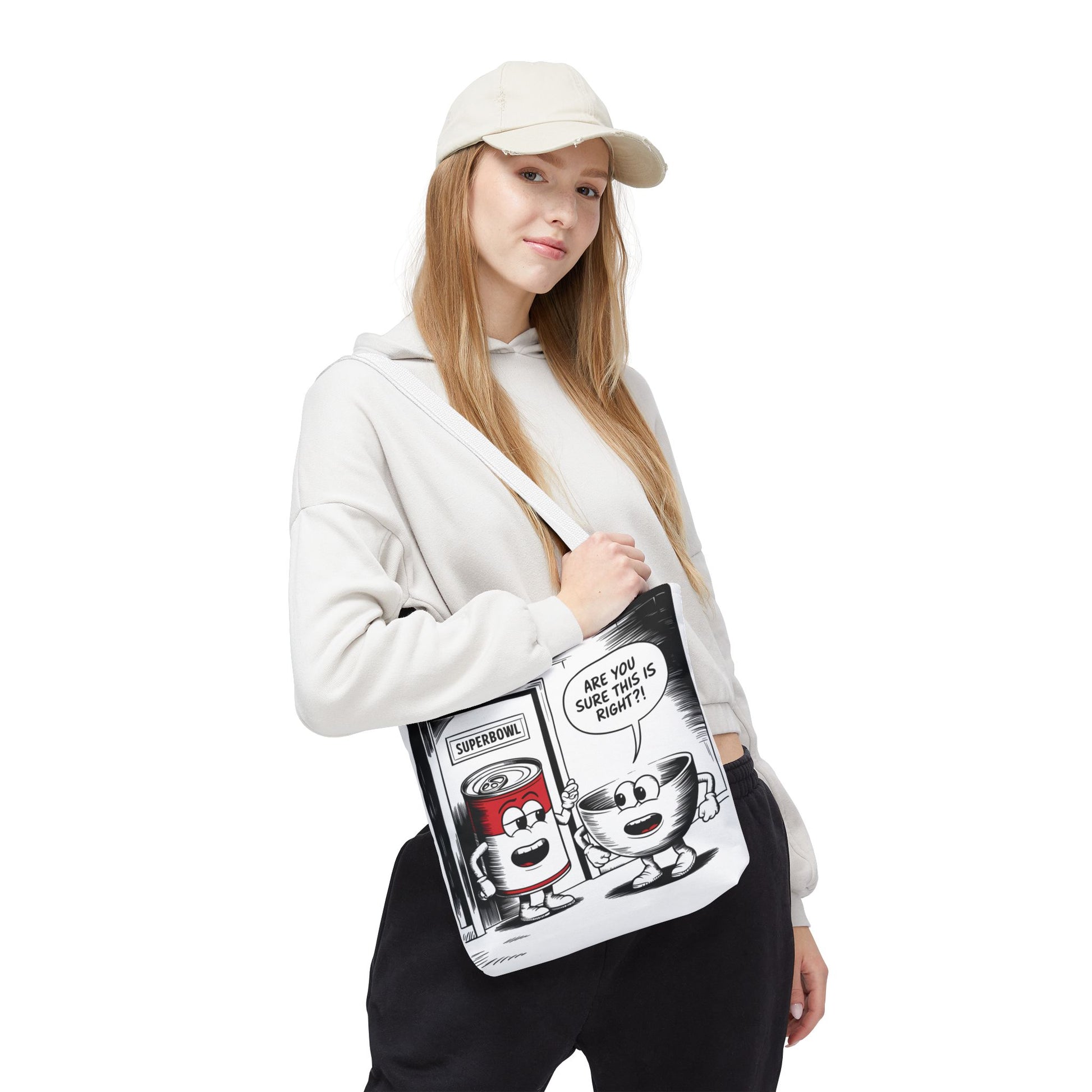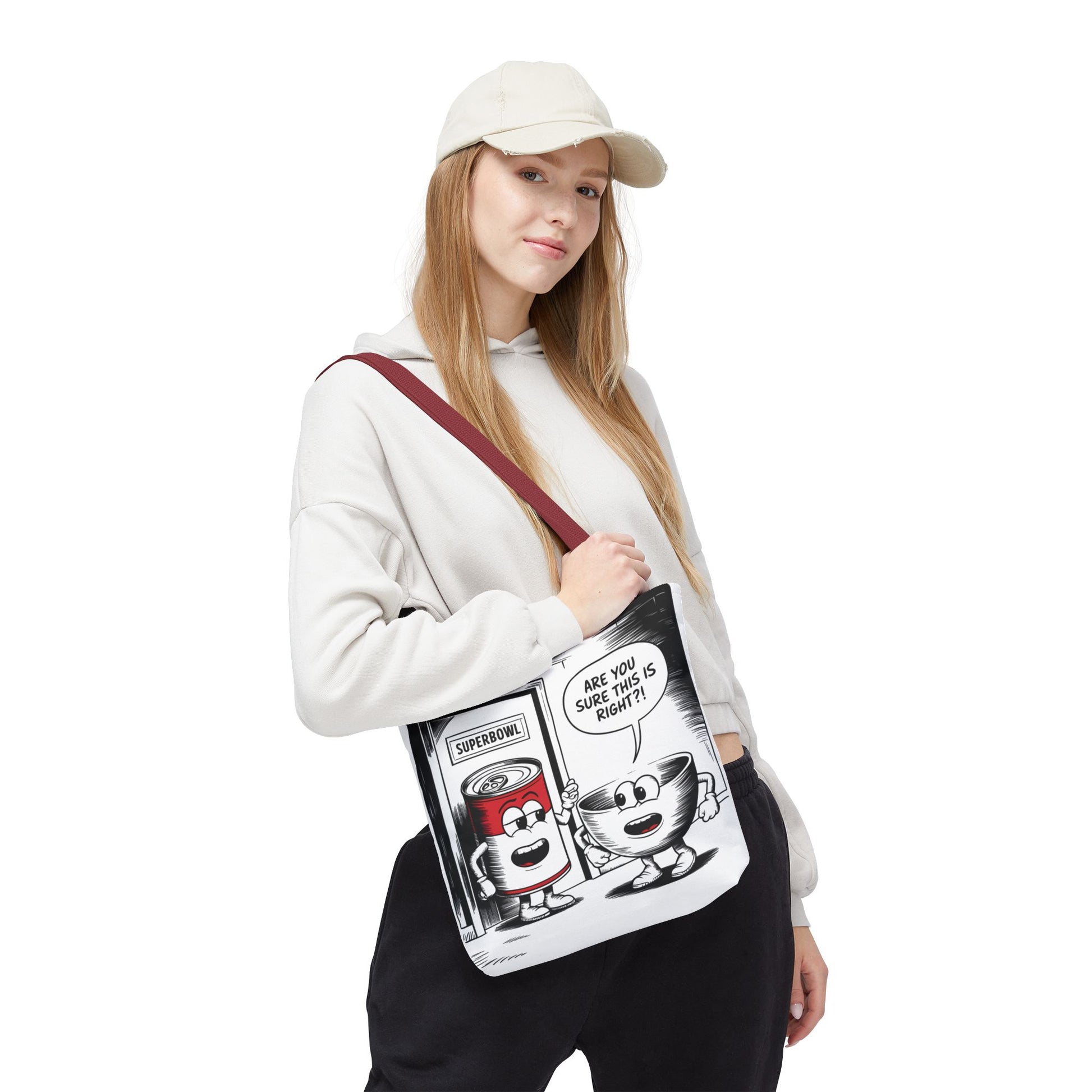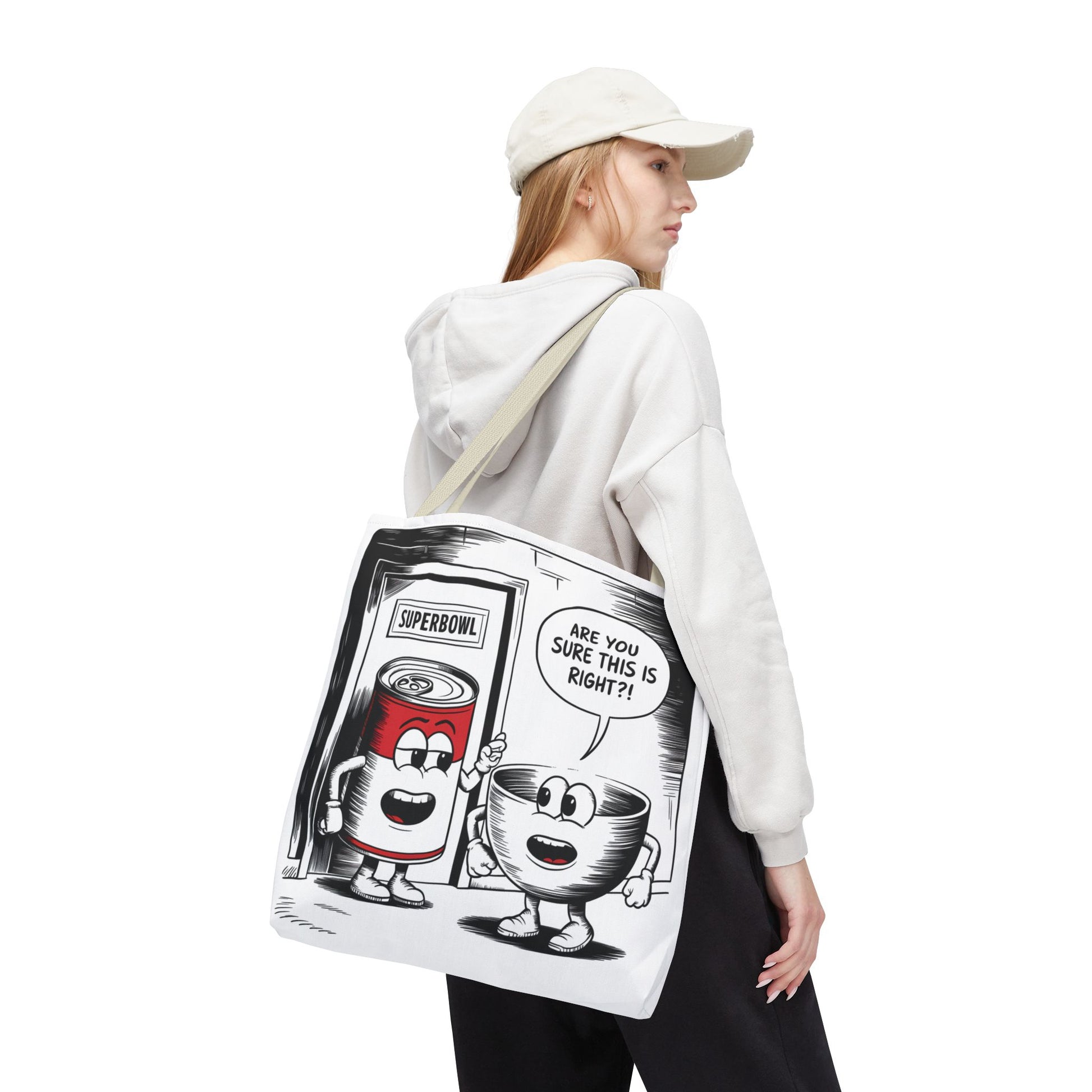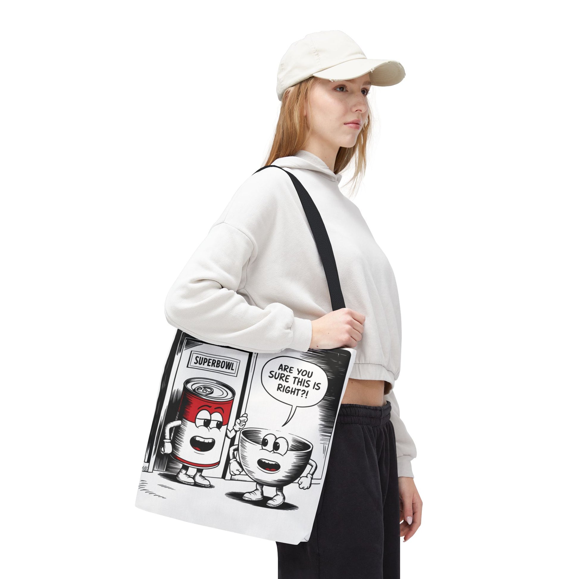 This Tote Bag features a fun comic design with a can of soup and a bowl about to enter a door labeled 'Superbowl'. It gives off a playful and humorous vibe, perfect for those who enjoy quirky and unique accessories. It is relevant for Superbowl parties, football fans, soup lovers, and anyone looking to add a touch of fun to their everyday essentials.