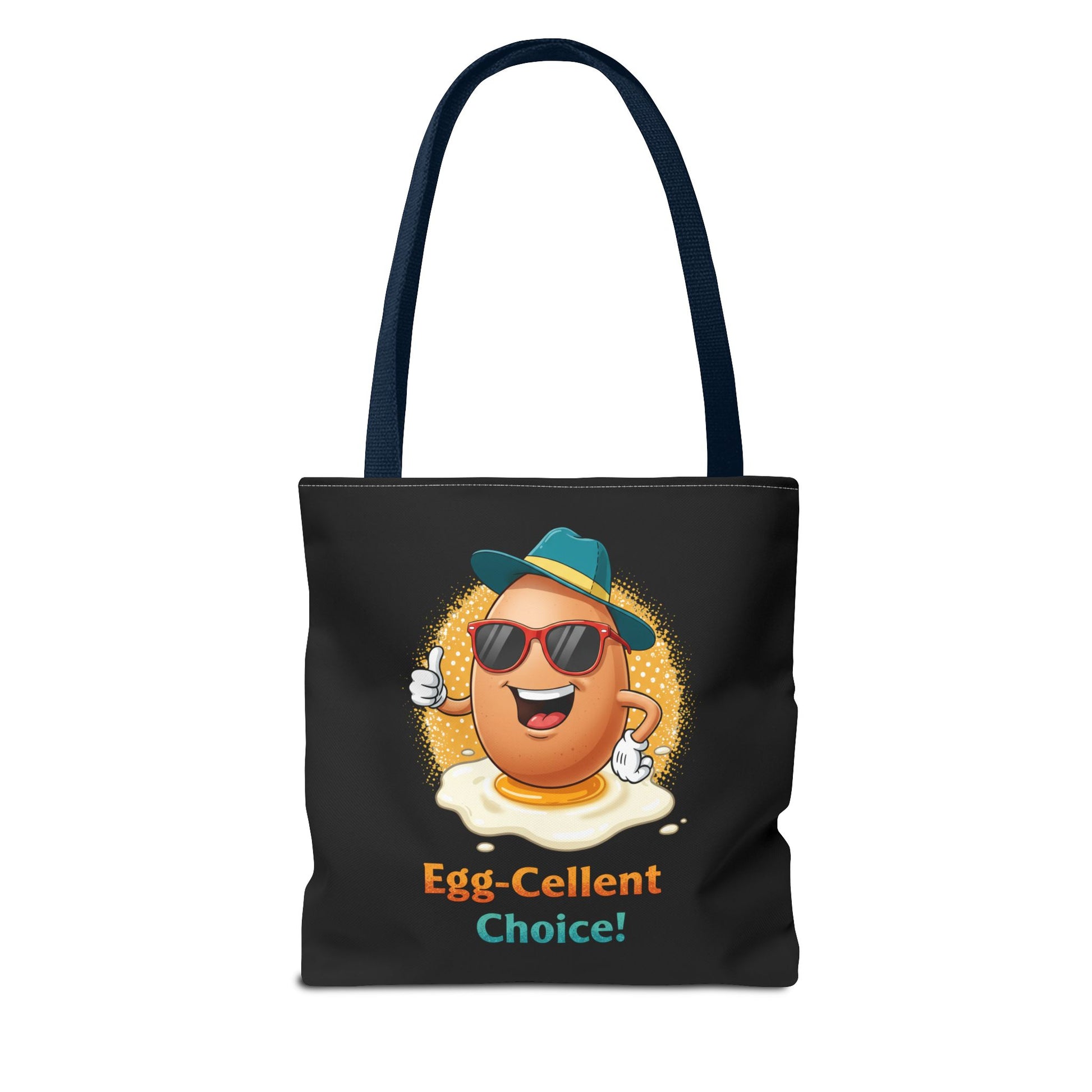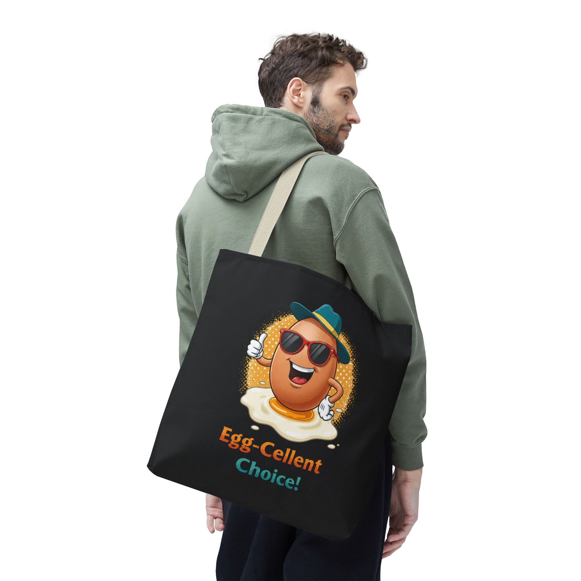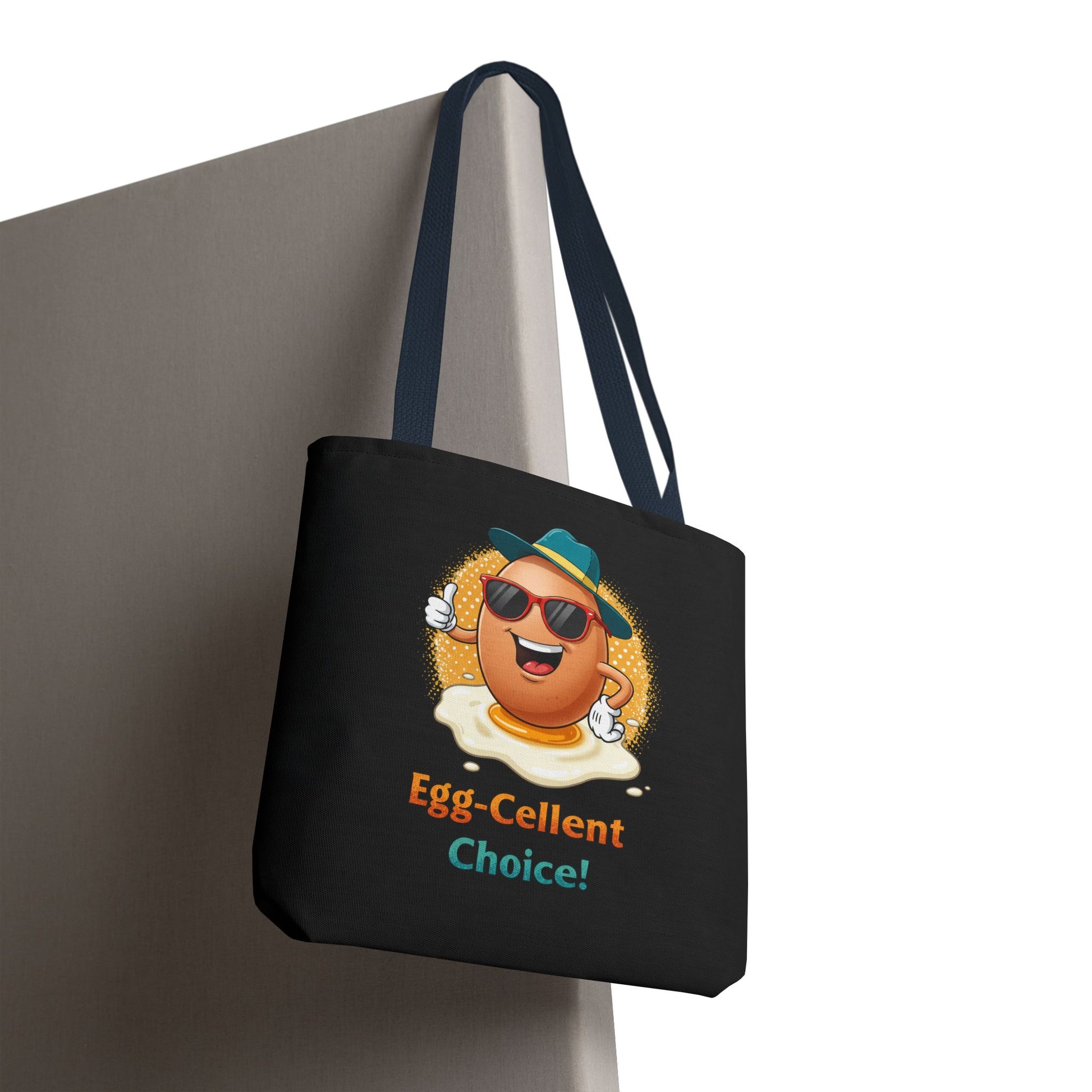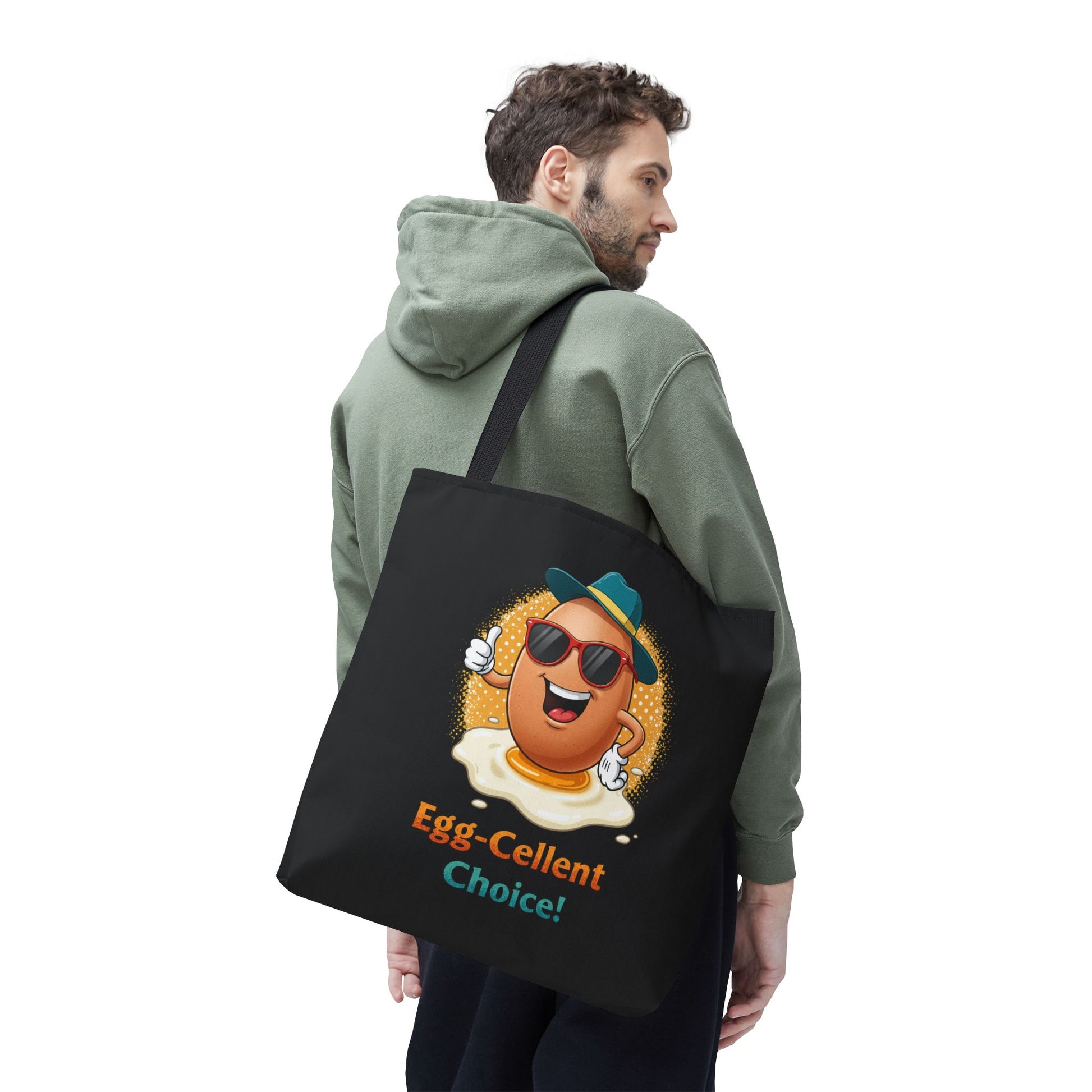 This fun tote bag features a pun of an egg giving a thumbs up and saying 'Egg-Cellent Choice'. It is perfect for those who appreciate a touch of humor in their everyday life. This tote bag is relevant for Easter, birthdays, and casual outings.