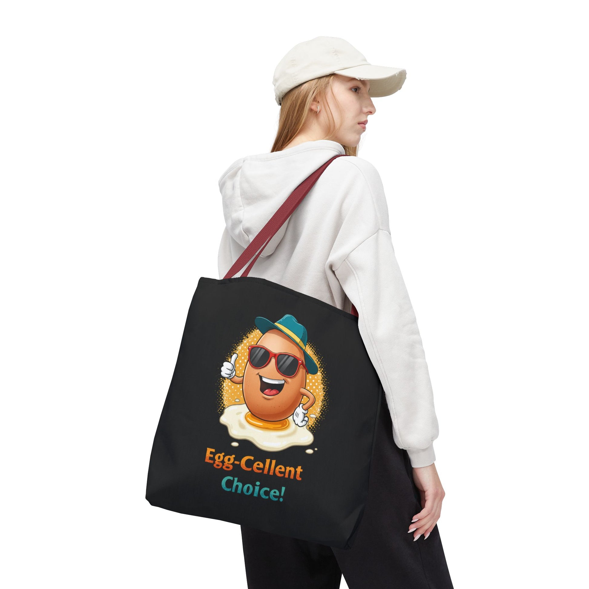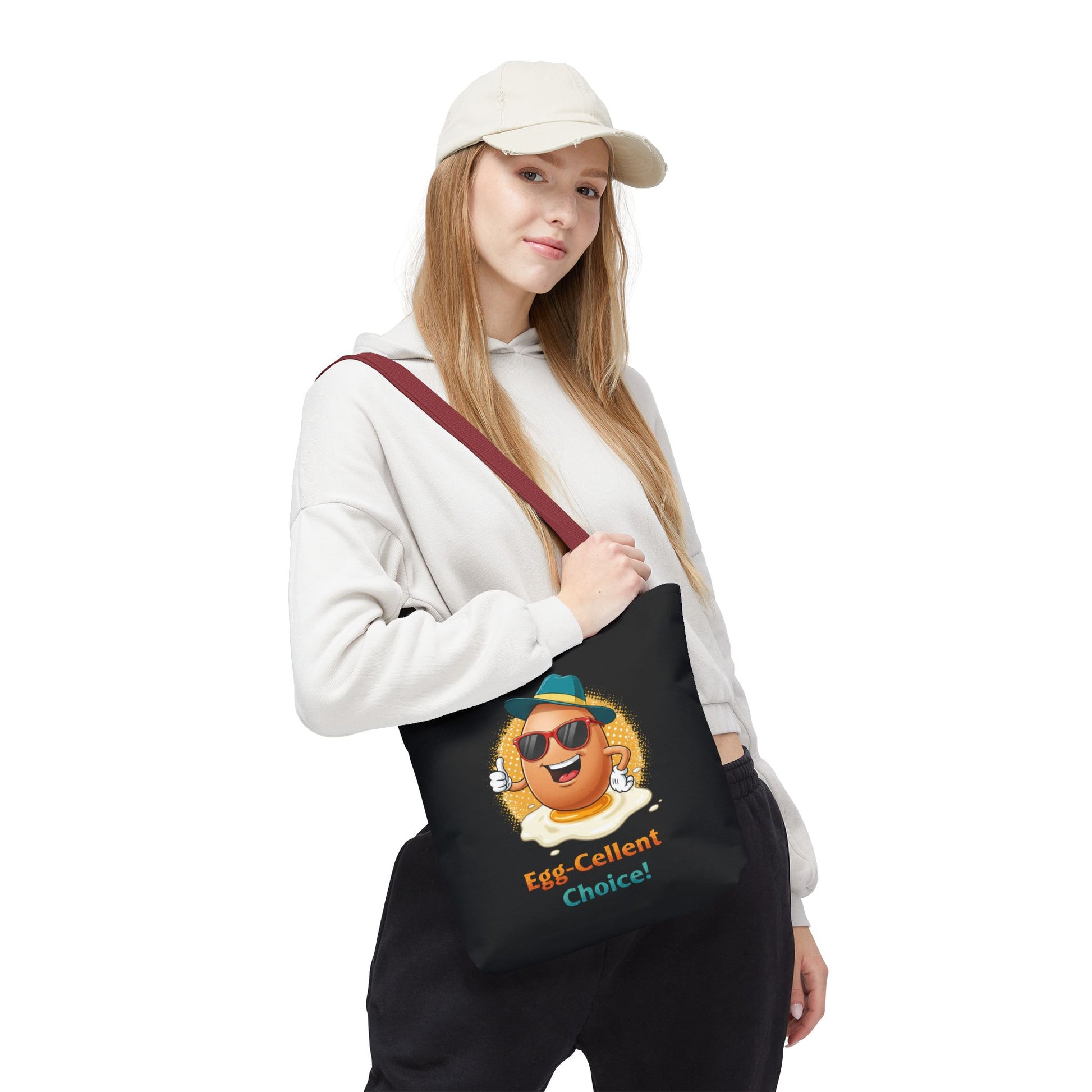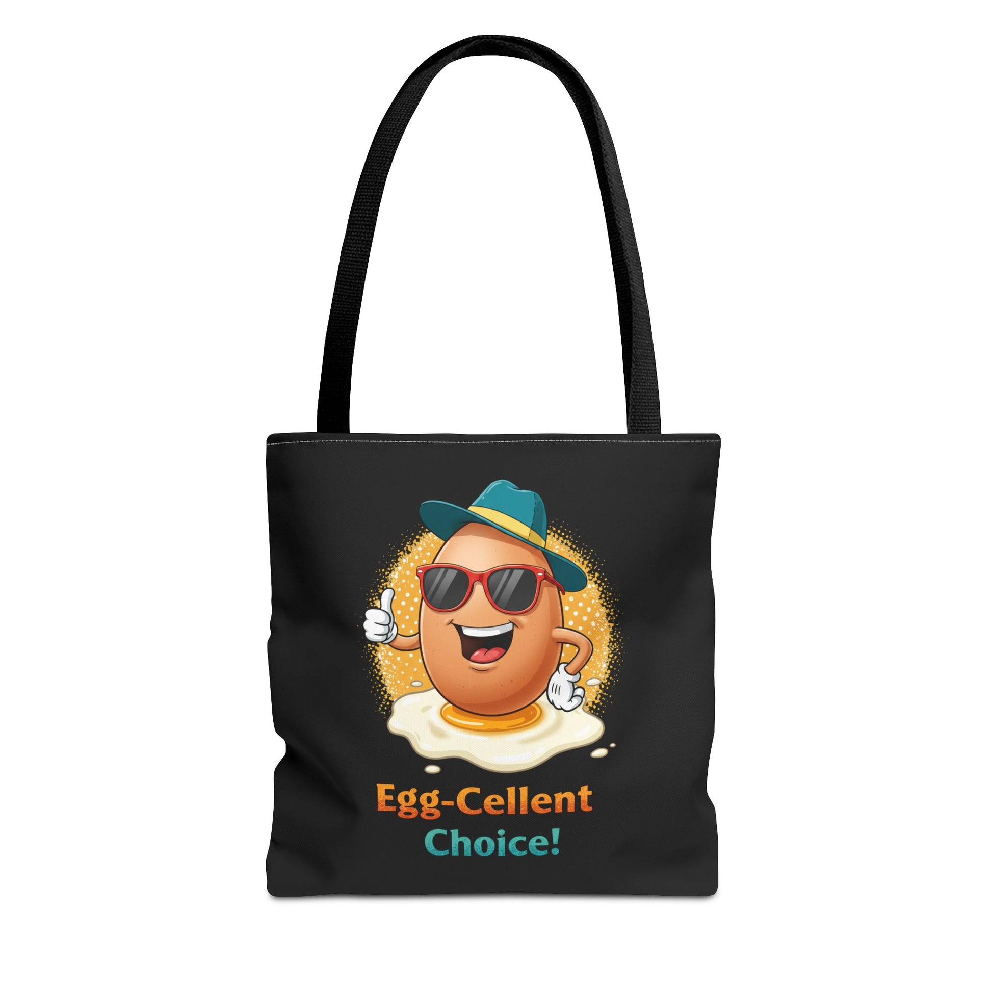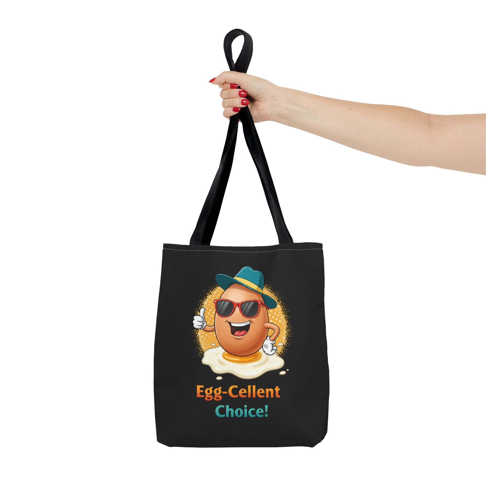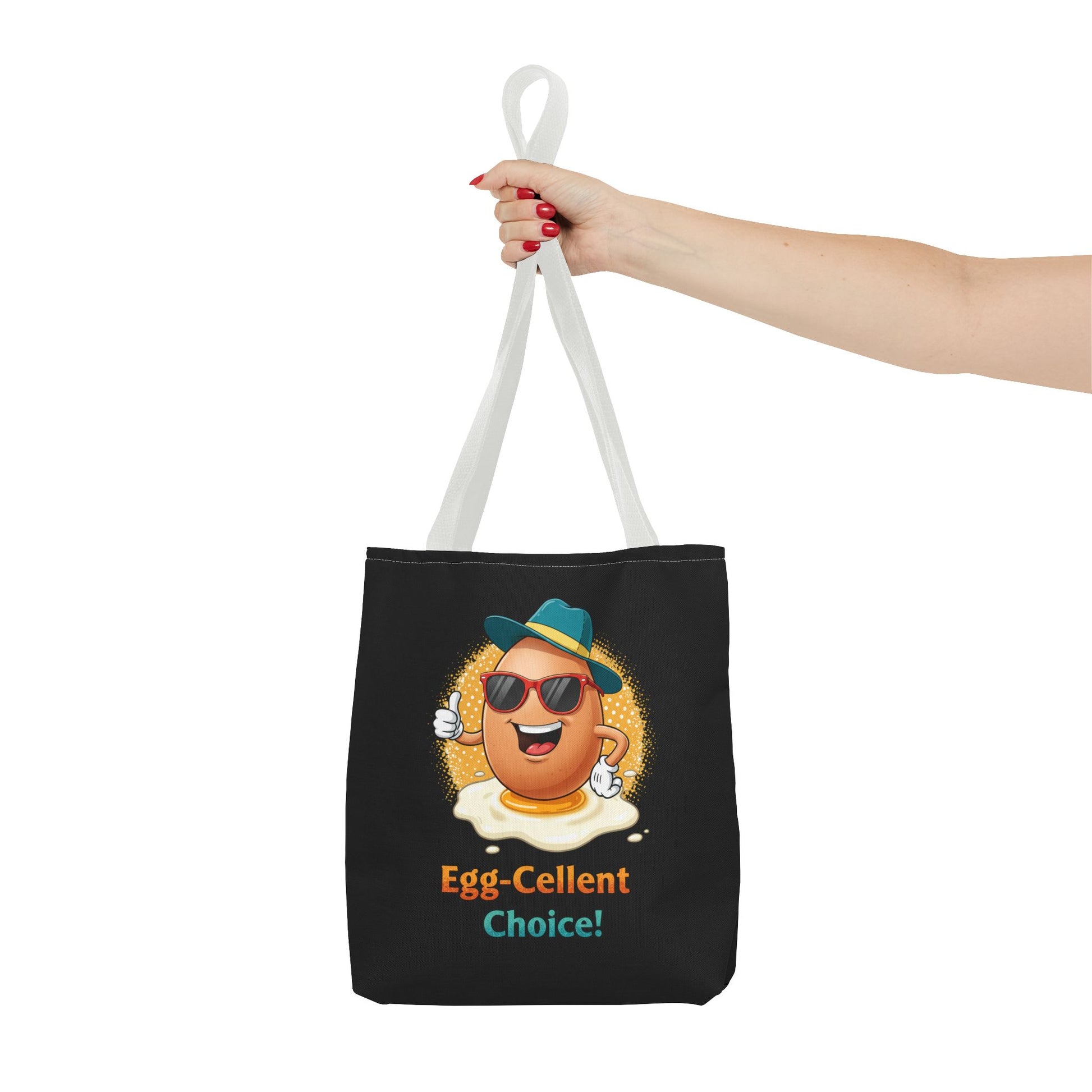 This fun tote bag features a pun of an egg giving a thumbs up and saying 'Egg-Cellent Choice'. It is perfect for those who appreciate a touch of humor in their everyday life. This tote bag is relevant for Easter, birthdays, and casual outings.