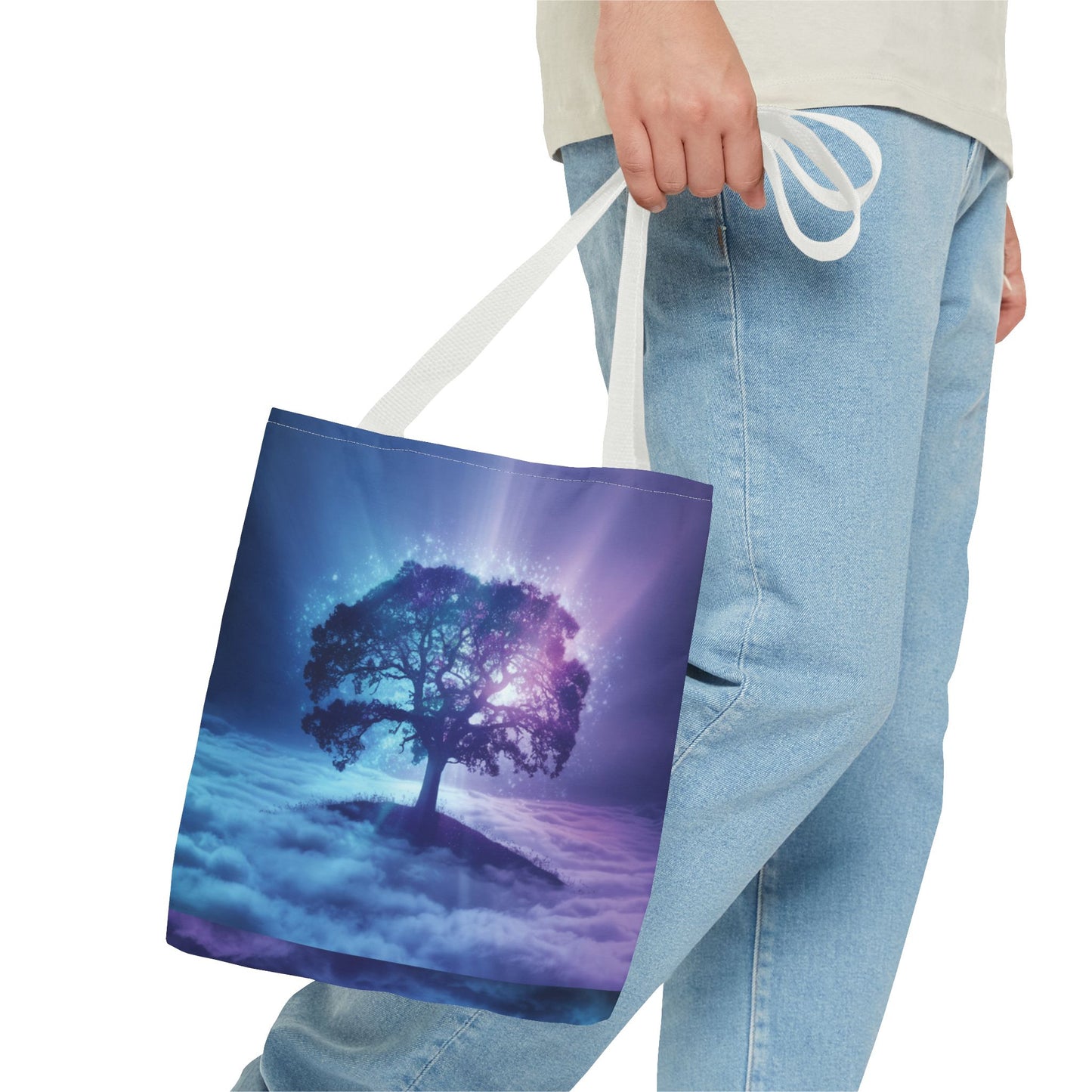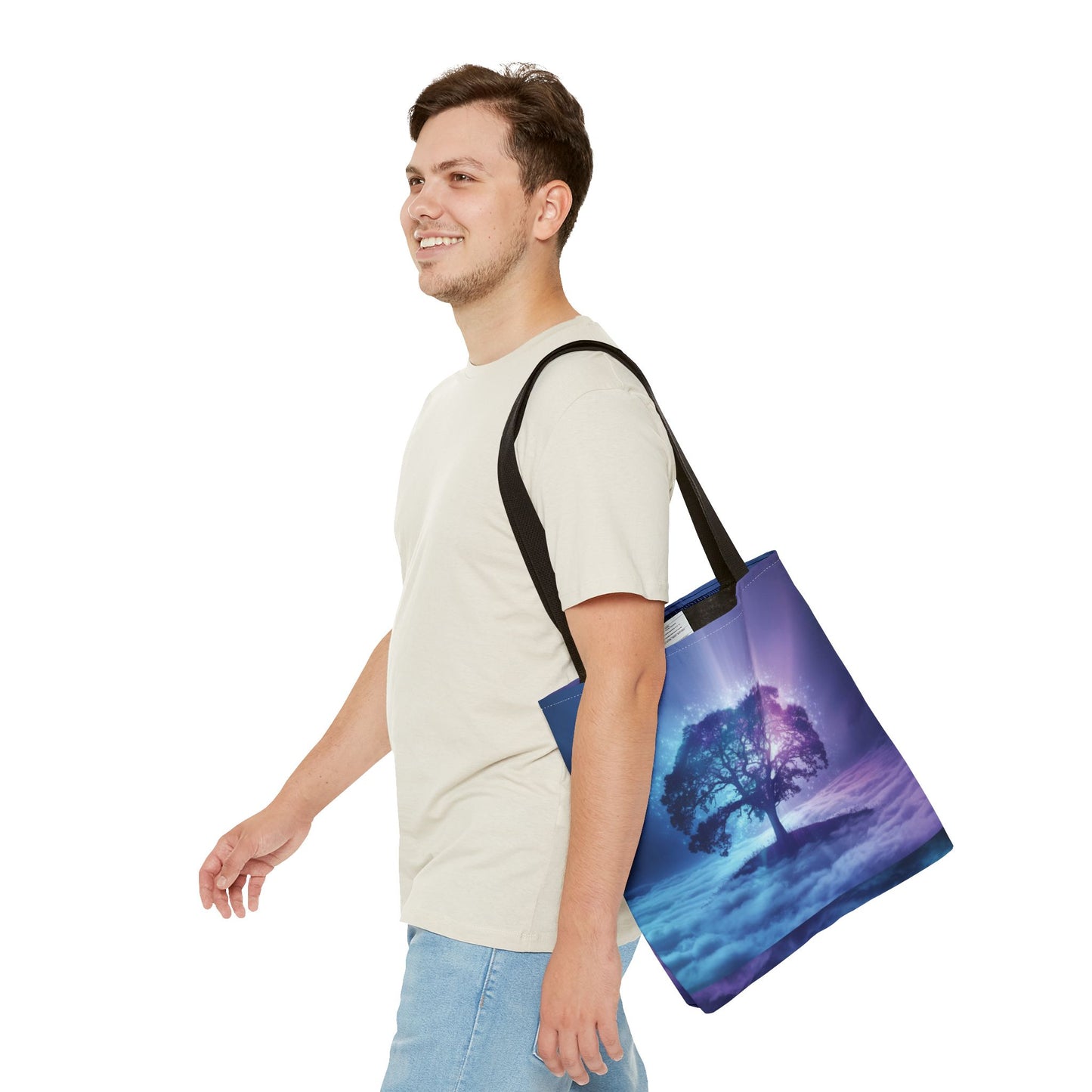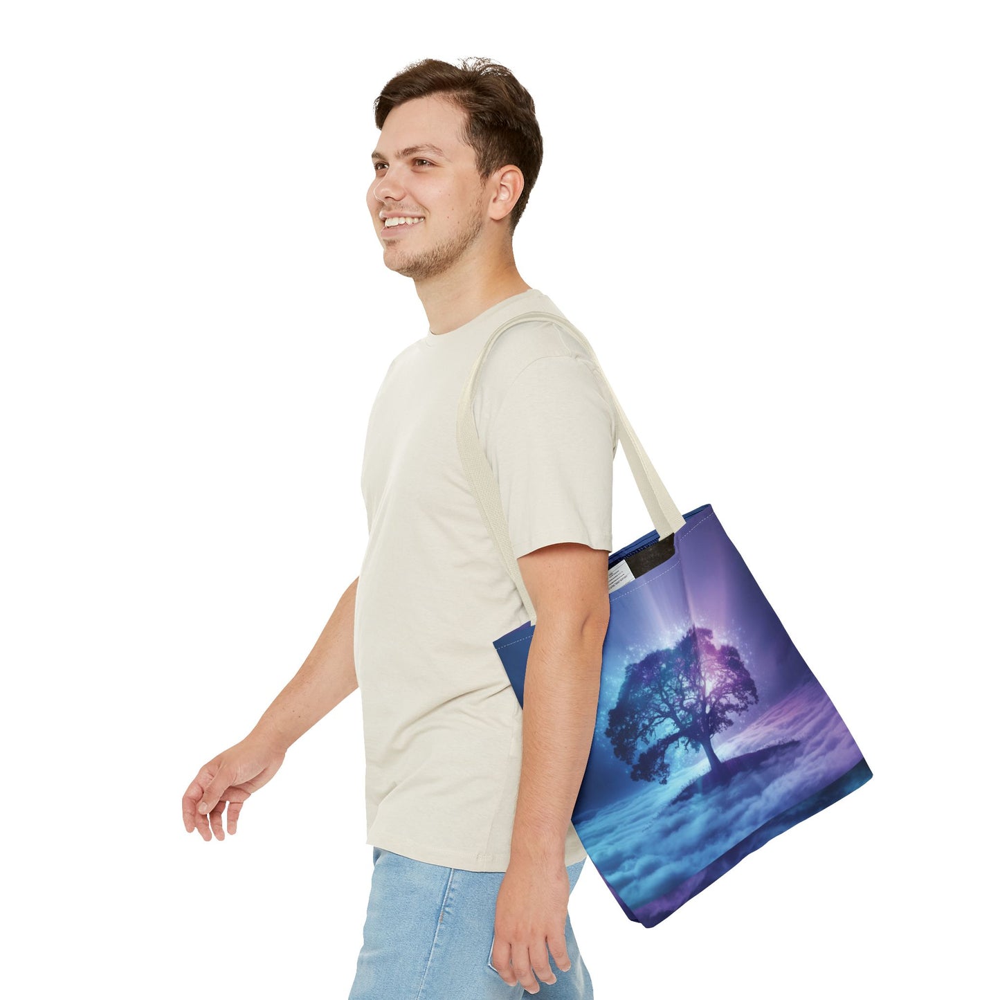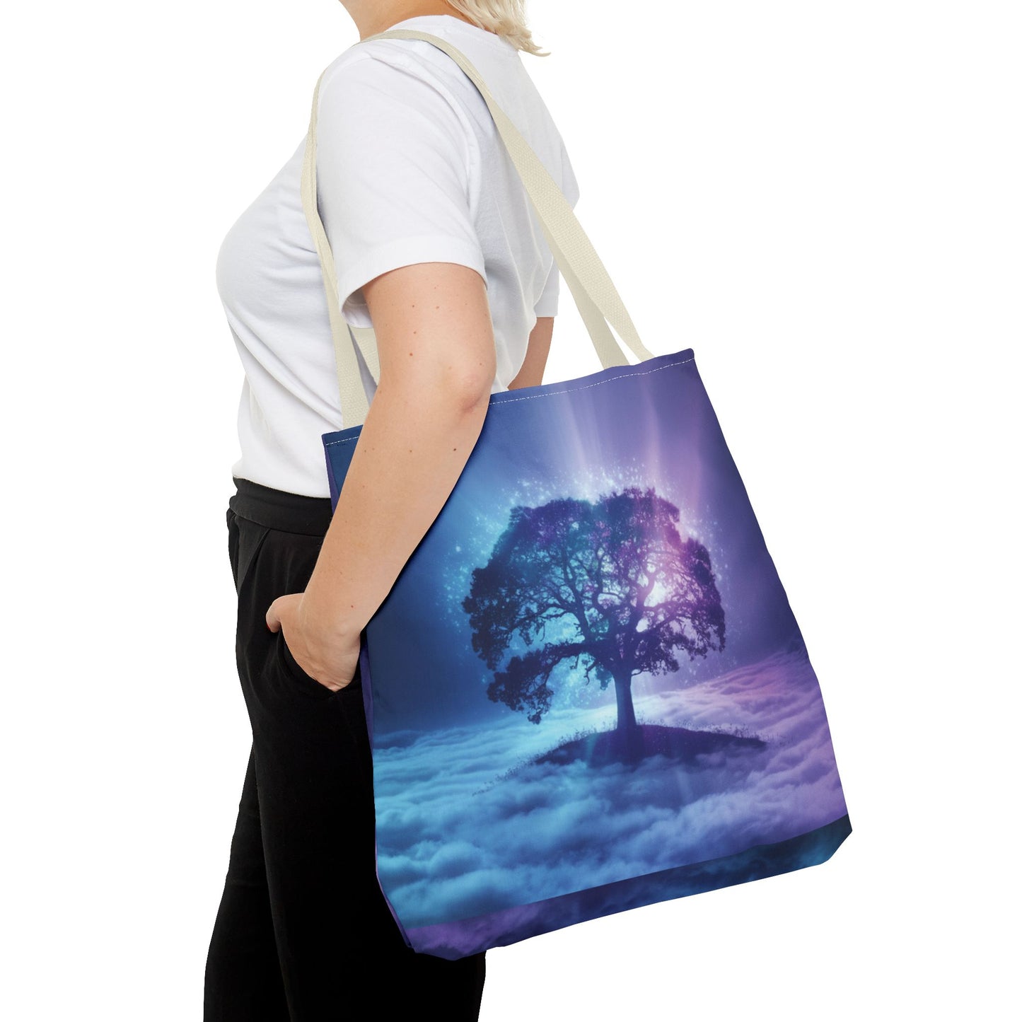 A fun tote bag with a serene and dreamy illustration of a tree among the clouds at night. Perfect for those who appreciate nature-inspired designs and enjoy carrying unique accessories. Ideal for anyone looking to add a touch of whimsy to their everyday essentials. Relevant for Earth Day, Arbor Day, or any nature-themed celebrations.
