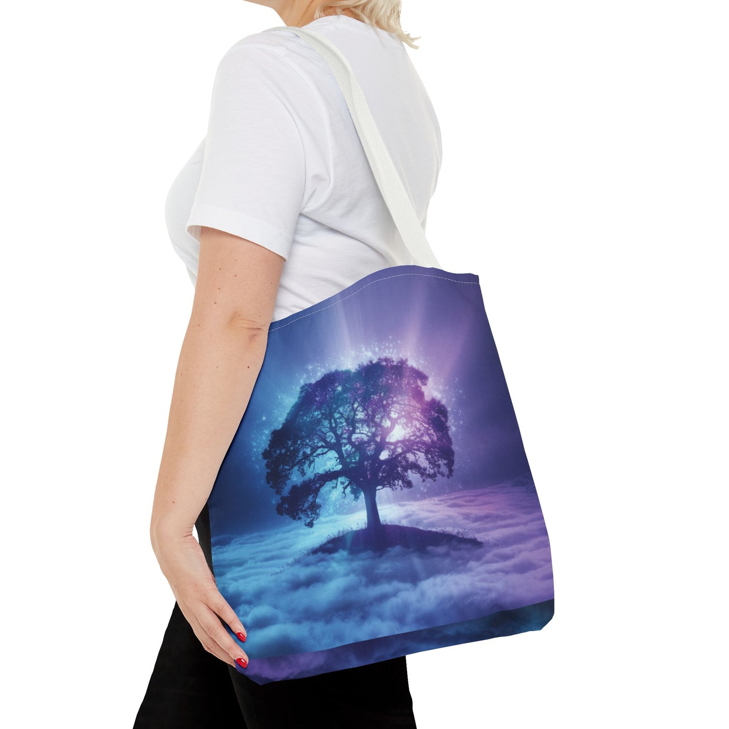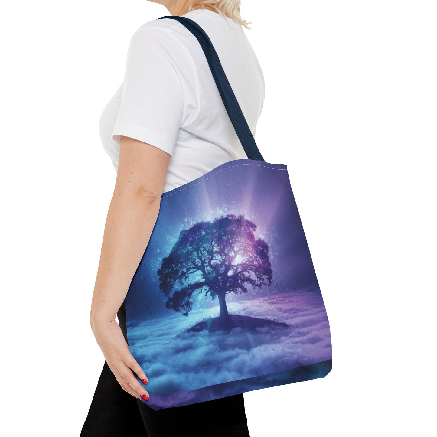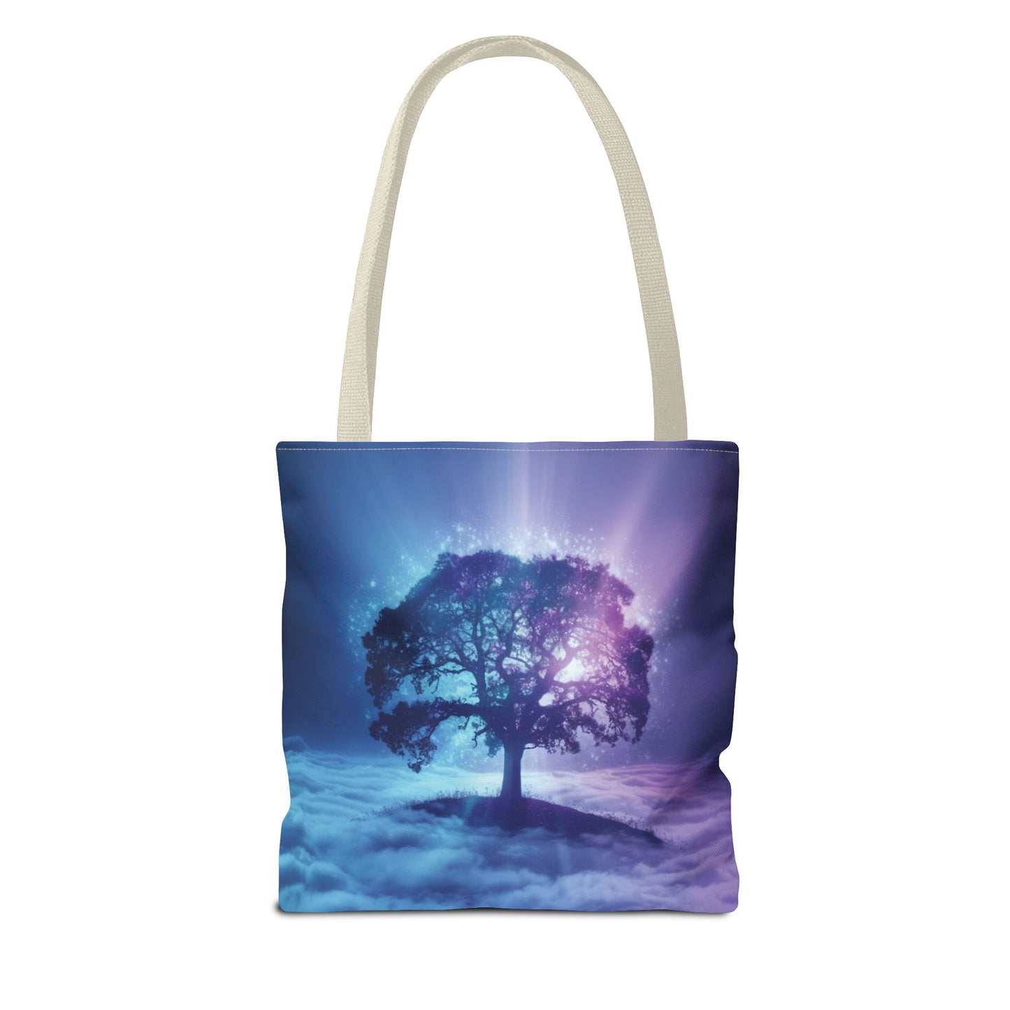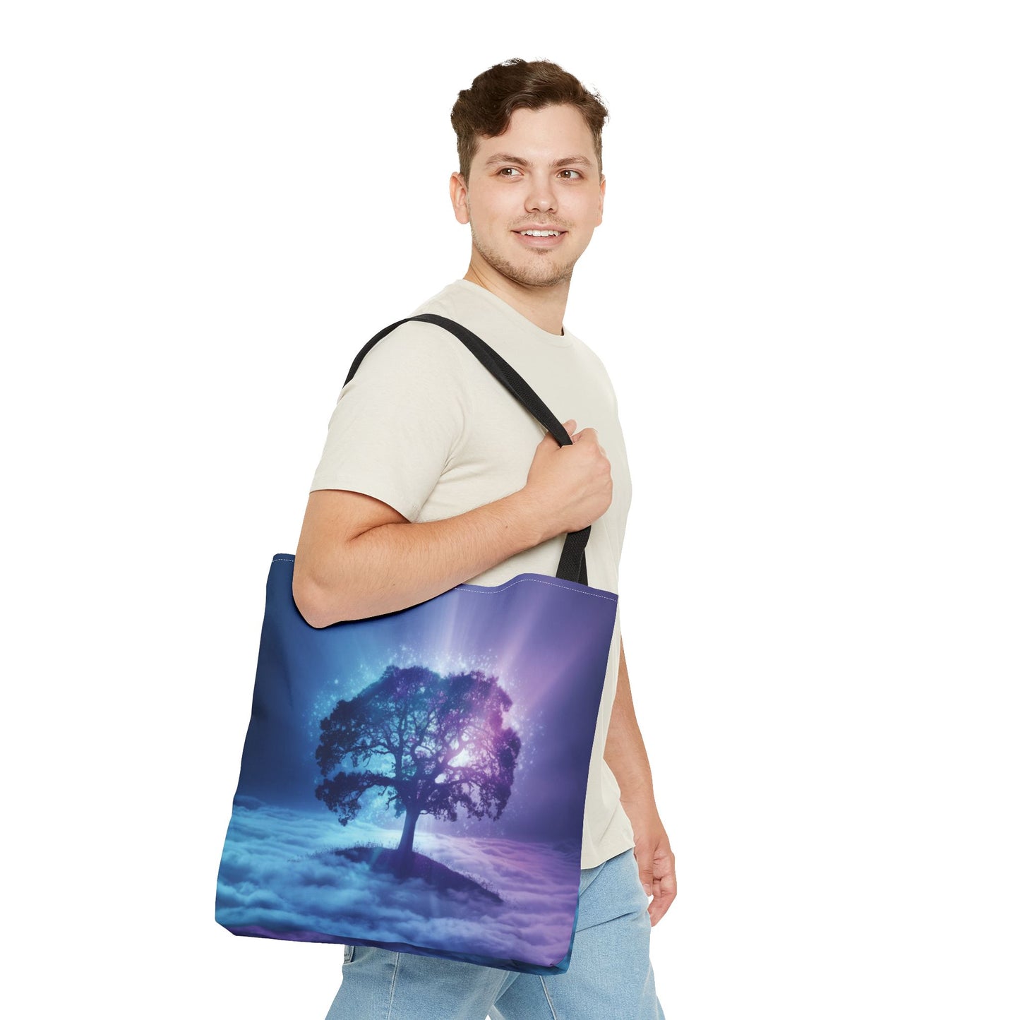 A fun tote bag with a serene and dreamy illustration of a tree among the clouds at night. Perfect for those who appreciate nature-inspired designs and enjoy carrying unique accessories. Ideal for anyone looking to add a touch of whimsy to their everyday essentials. Relevant for Earth Day, Arbor Day, or any nature-themed celebrations.