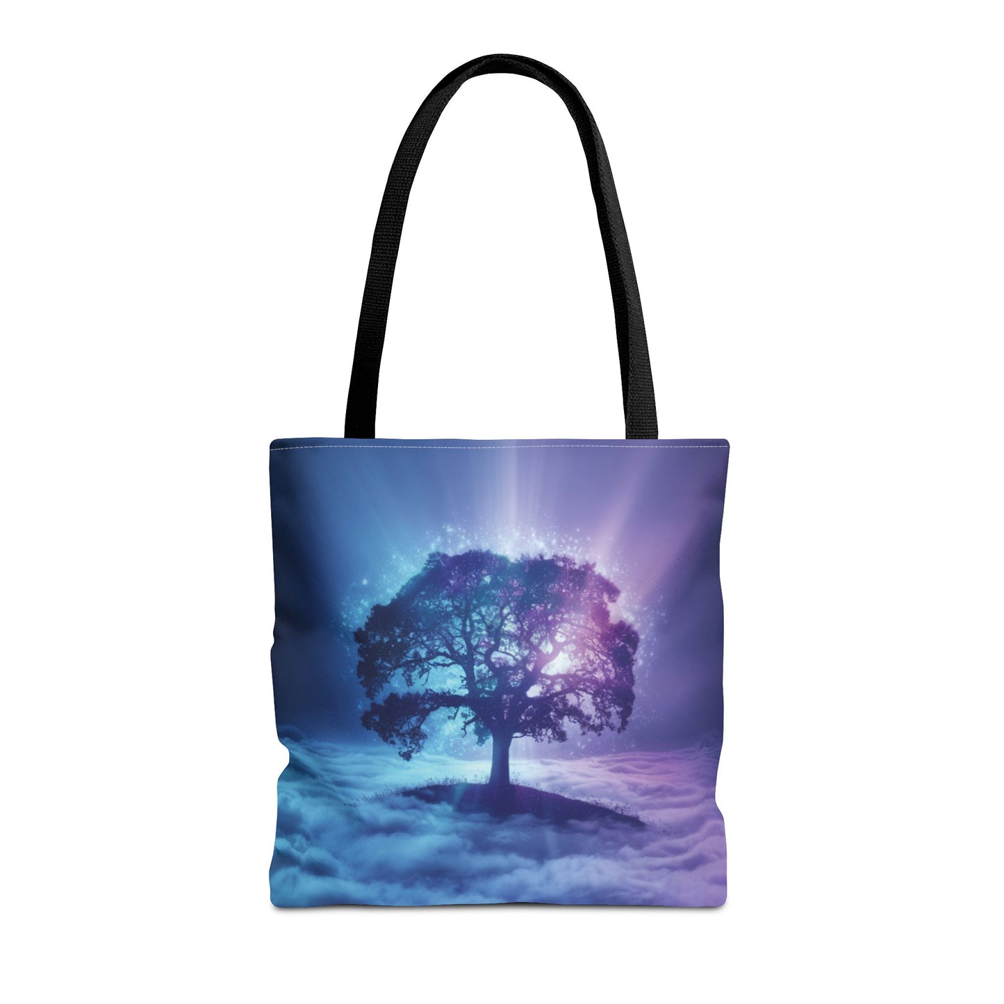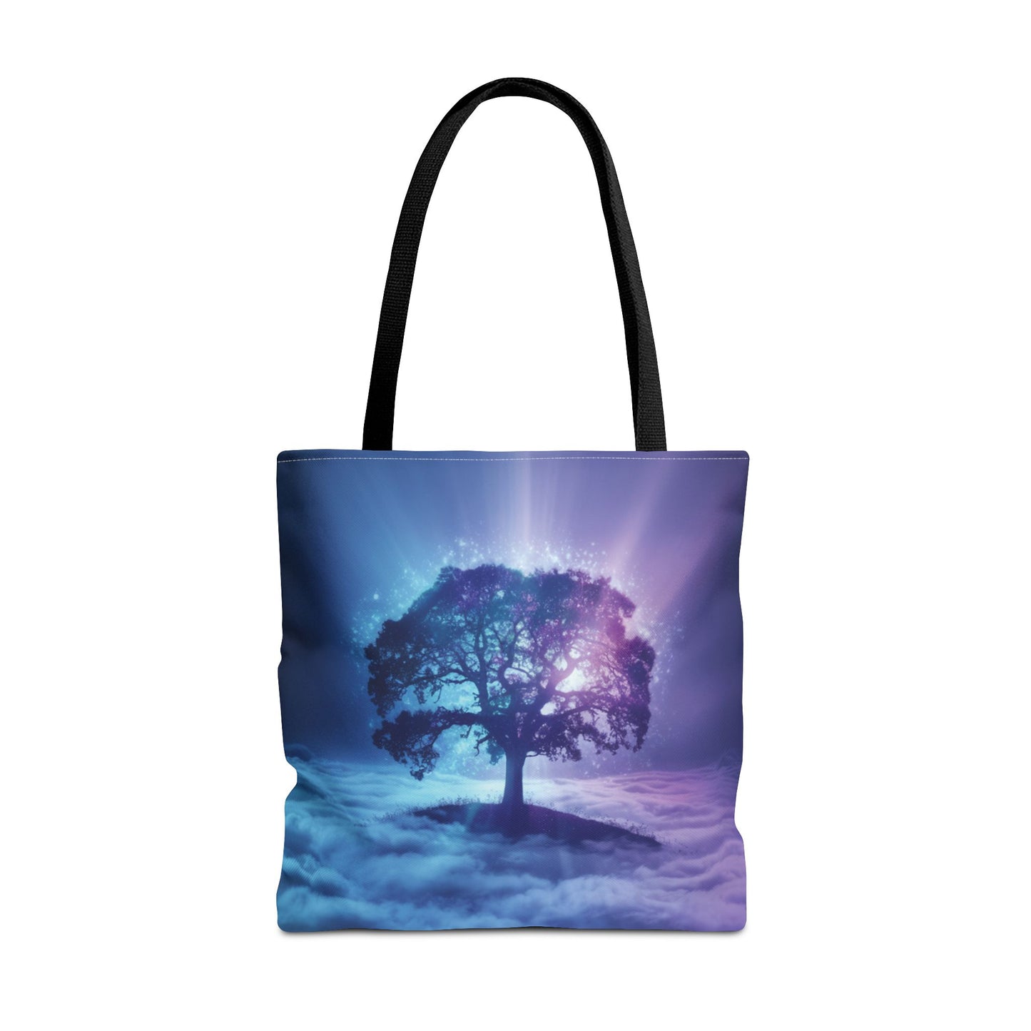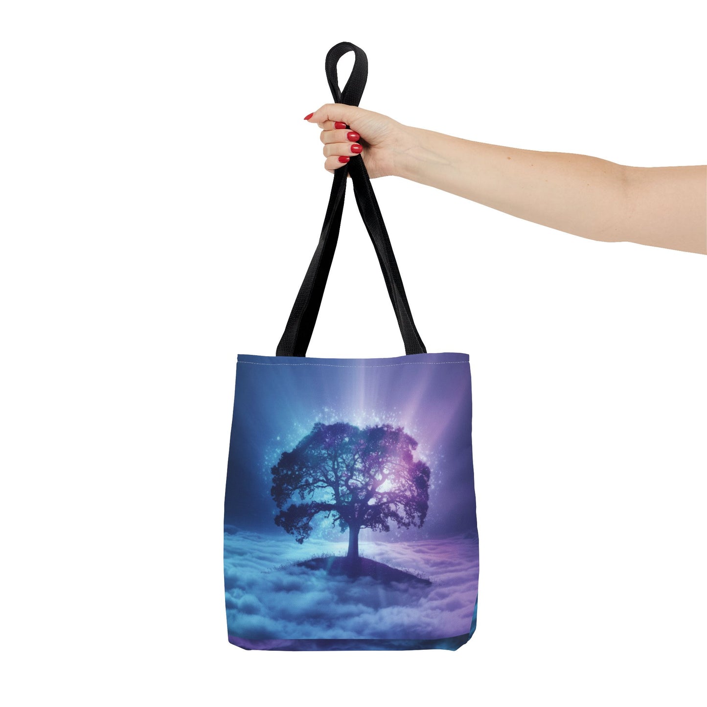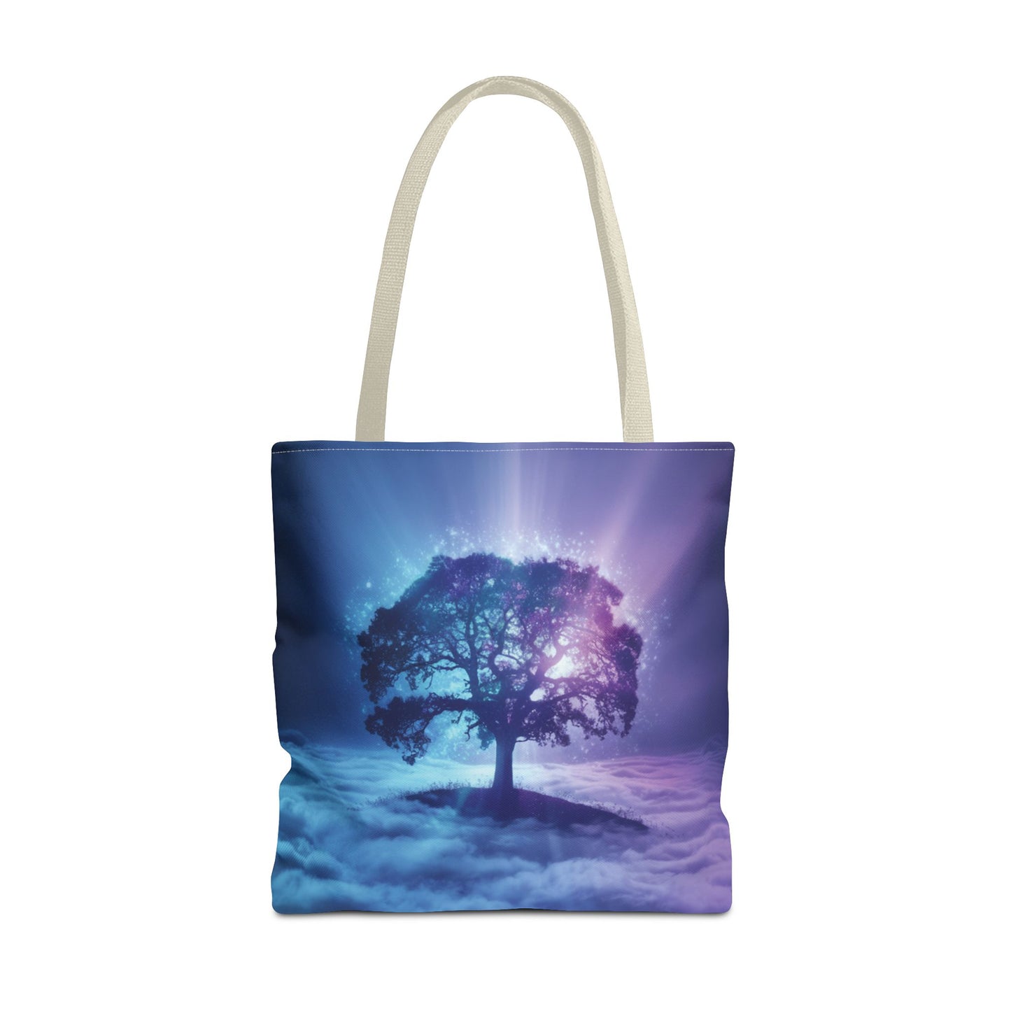 A fun tote bag with a serene and dreamy illustration of a tree among the clouds at night. Perfect for those who appreciate nature-inspired designs and enjoy carrying unique accessories. Ideal for anyone looking to add a touch of whimsy to their everyday essentials. Relevant for Earth Day, Arbor Day, or any nature-themed celebrations.