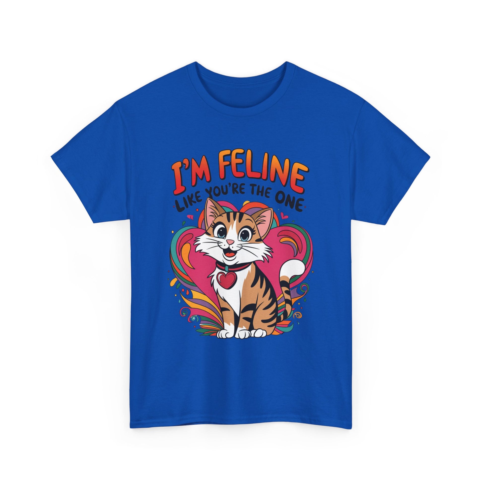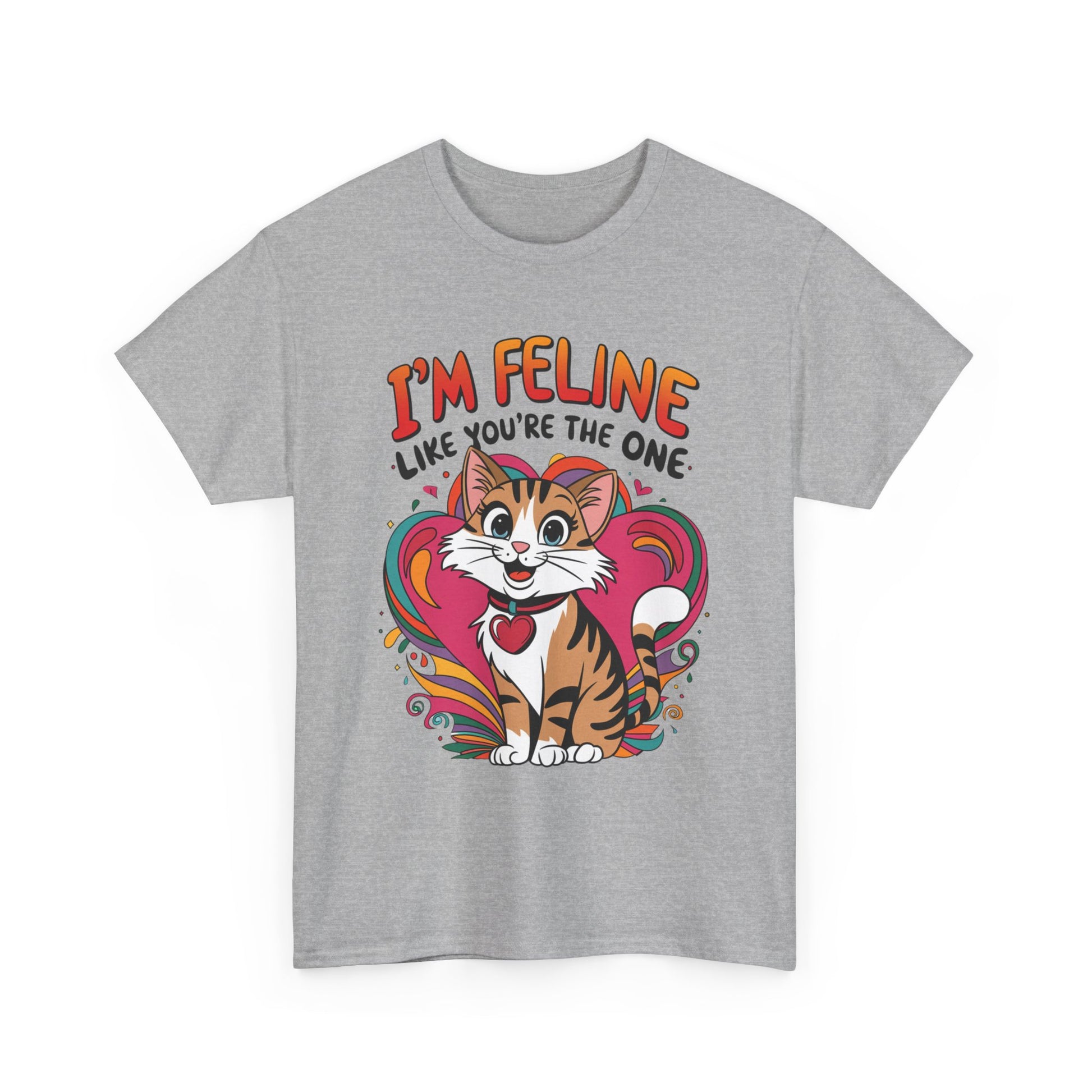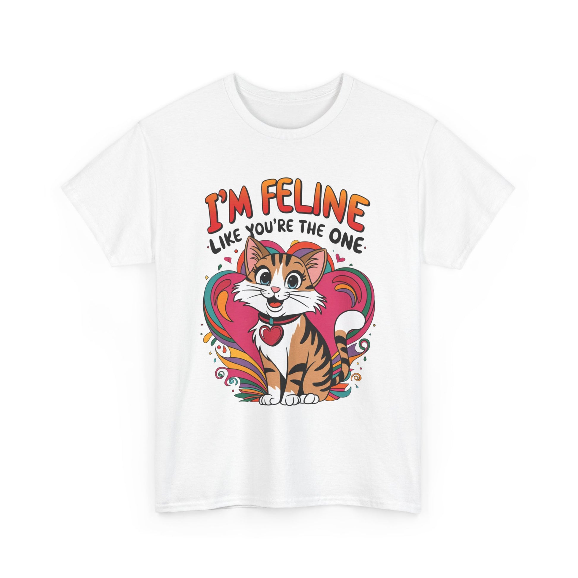 A fun T-shirt with a cat design perfect for Valentines Day. The shirt states 'I'm Feline Like You're The One', giving a playful and romantic vibe. This T-shirt is great for anyone looking to show their love for cats and their significant other during the holiday season or any casual day.
