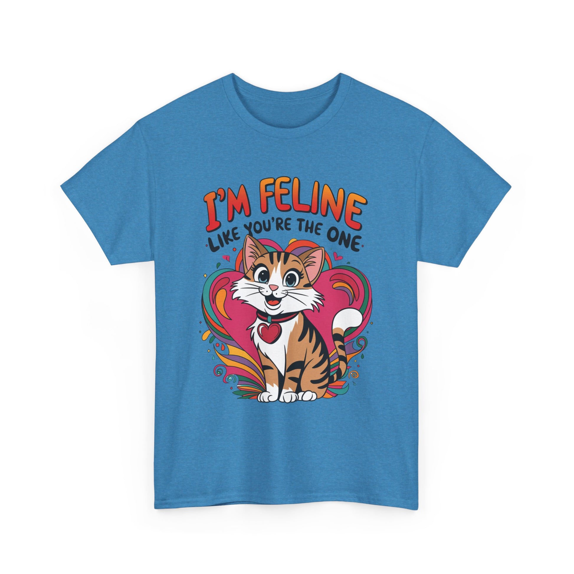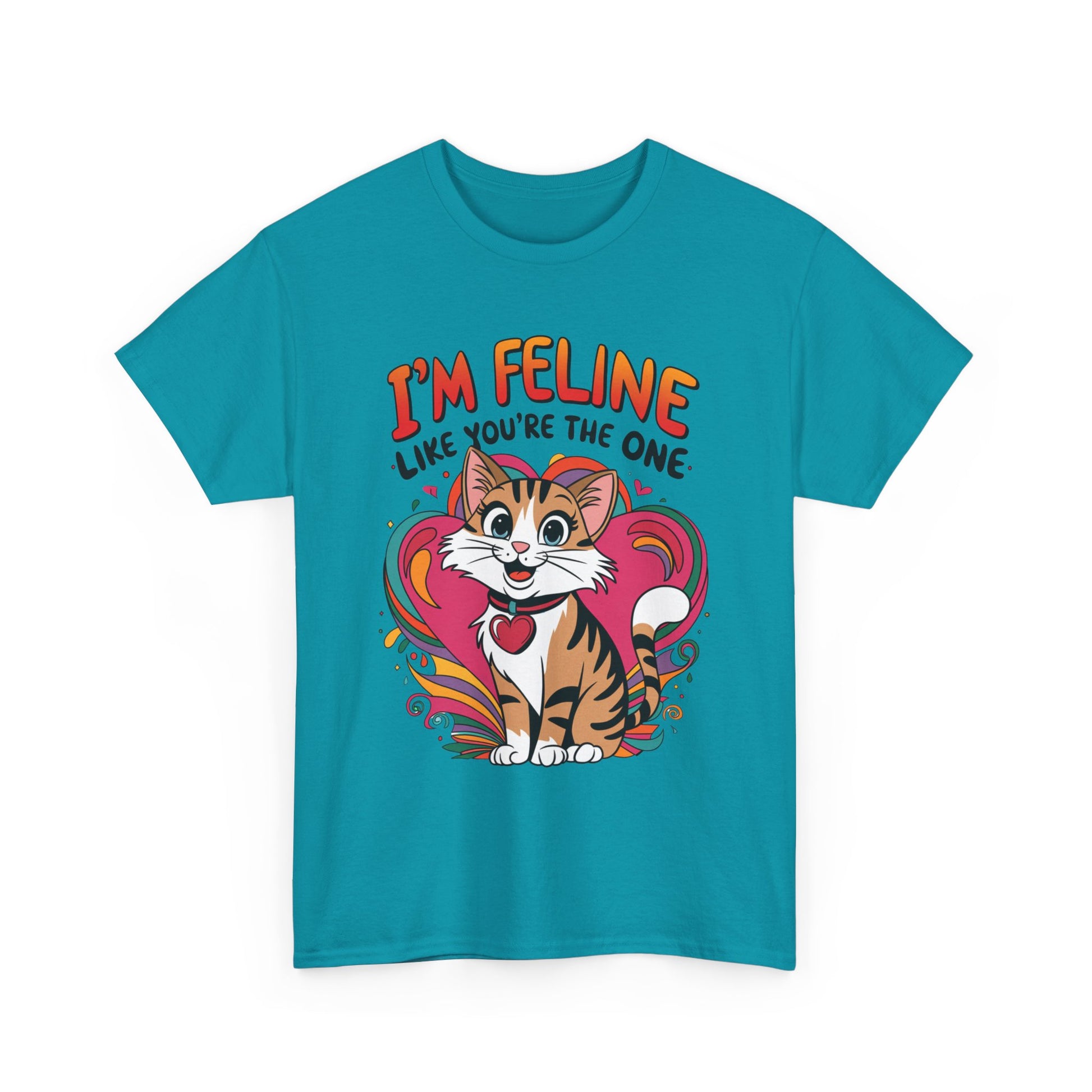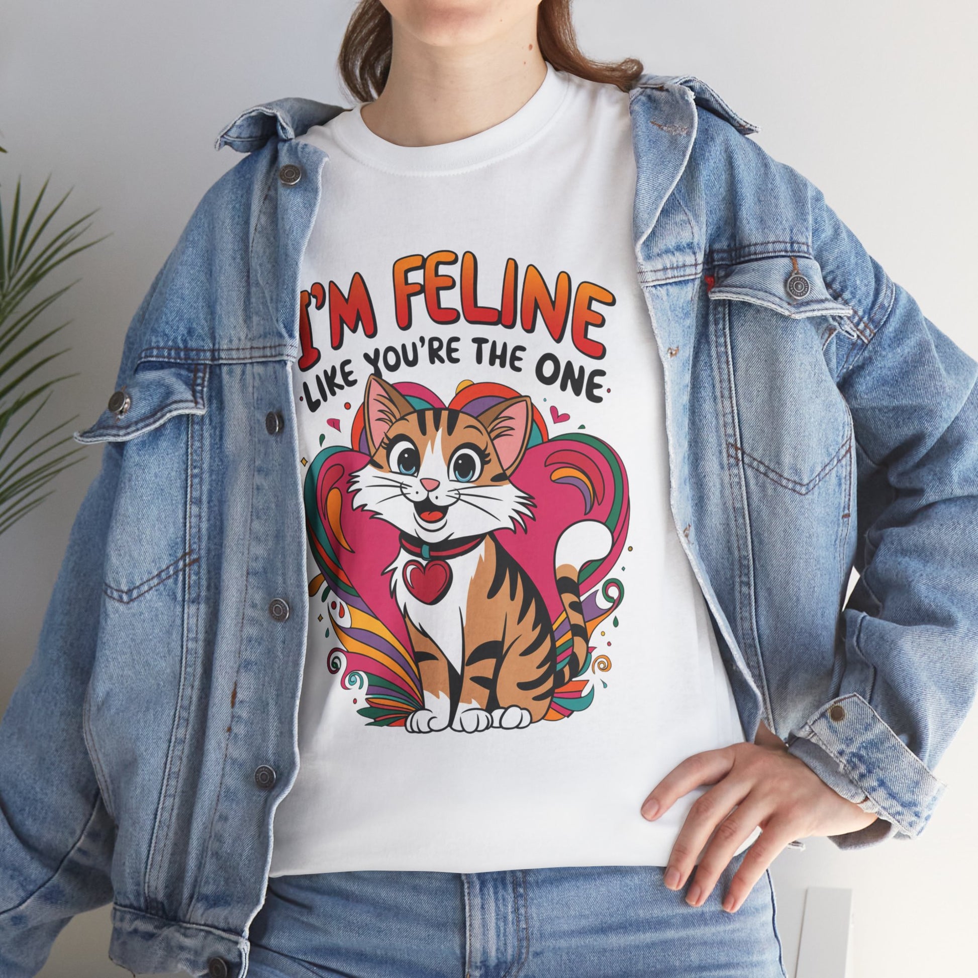 A fun T-shirt with a cat design perfect for Valentines Day. The shirt states 'I'm Feline Like You're The One', giving a playful and romantic vibe. This T-shirt is great for anyone looking to show their love for cats and their significant other during the holiday season or any casual day.