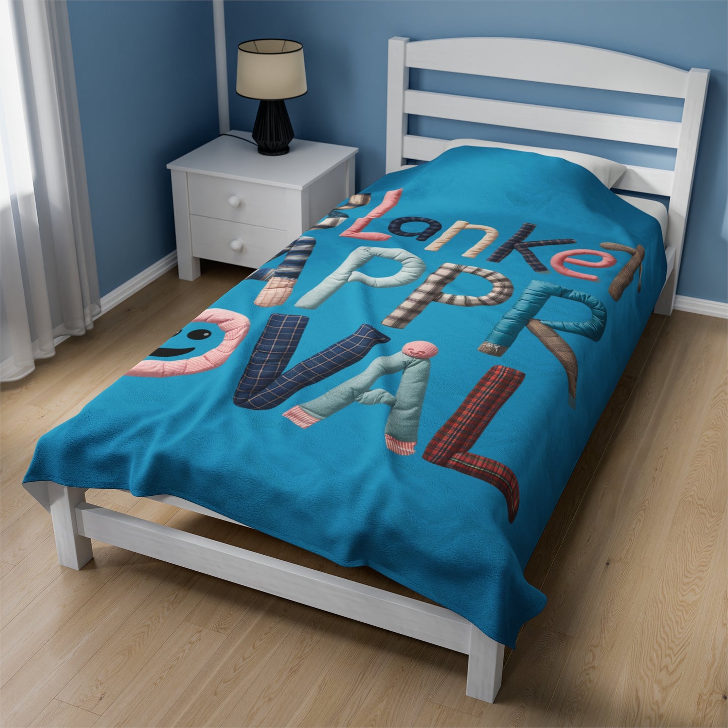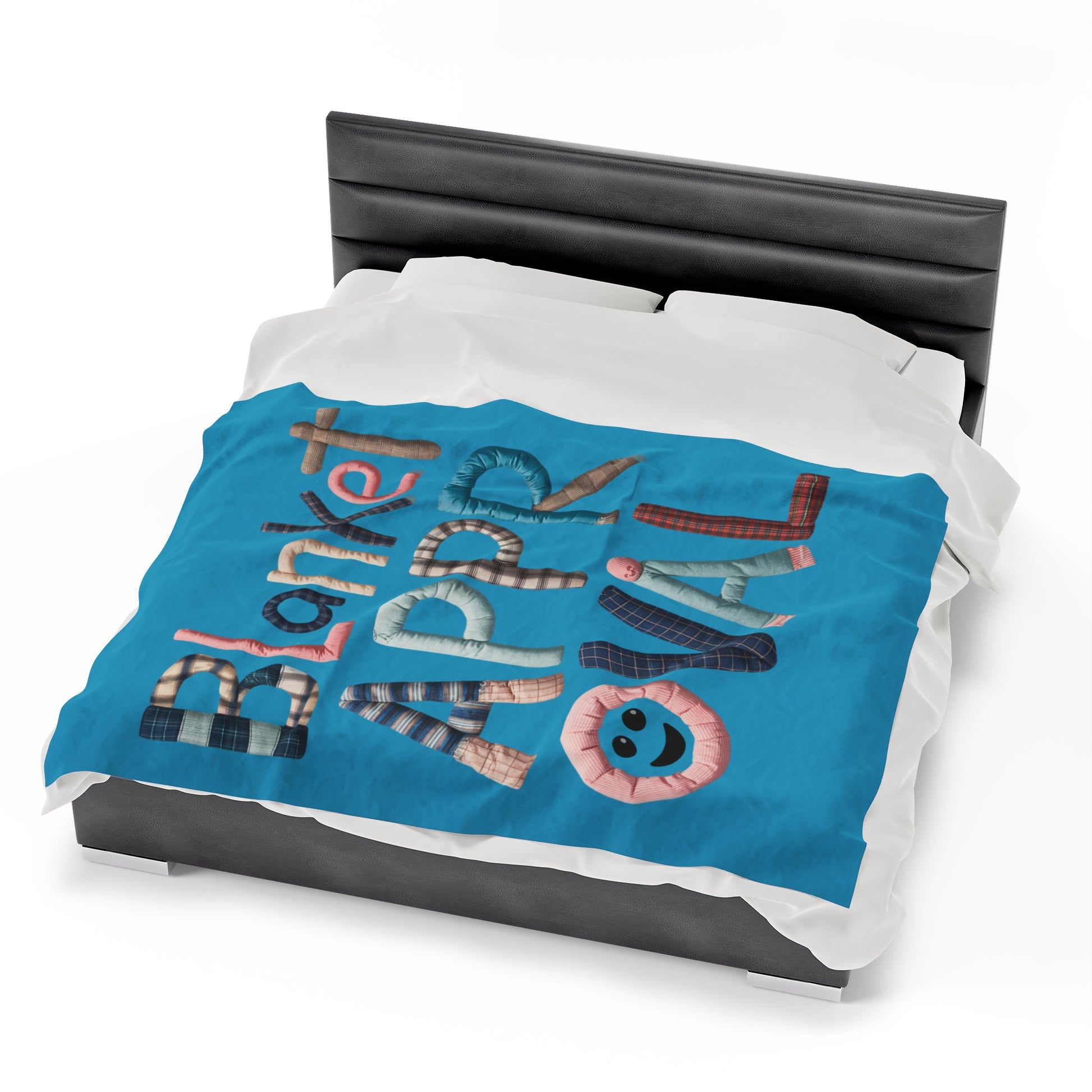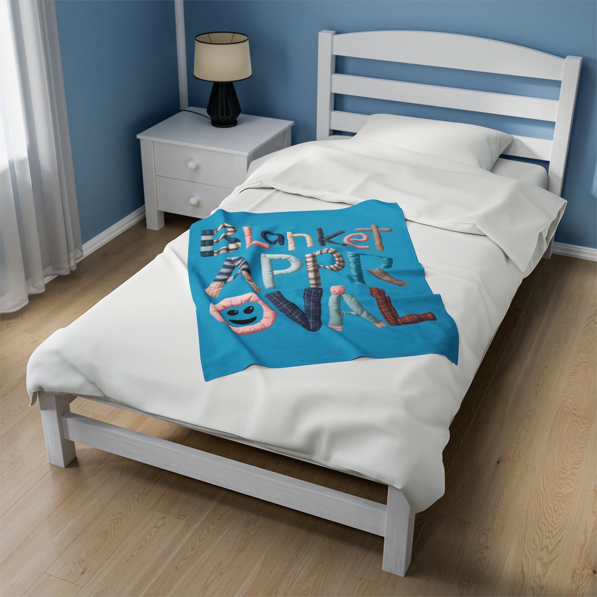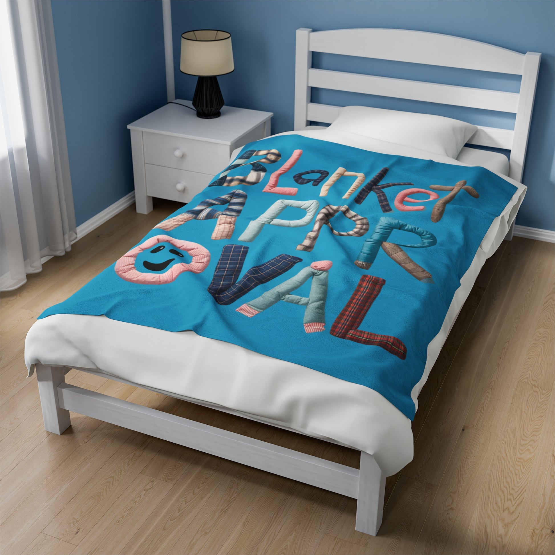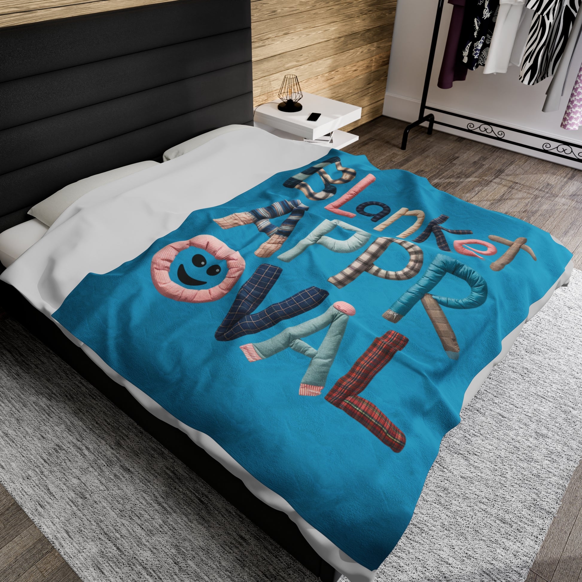 A Fun Plush Blanket that states 'Blanket Approval' with letters made out of blankets. This cozy and soft blanket is perfect for anyone who loves to snuggle up with a good blanket. It can add a playful touch to your home decor and is great for staying warm during the colder months. Ideal for cozy nights in or as a gift for someone who loves all things warm and comfy. Perfect for holidays, birthdays, or housewarming gifts.