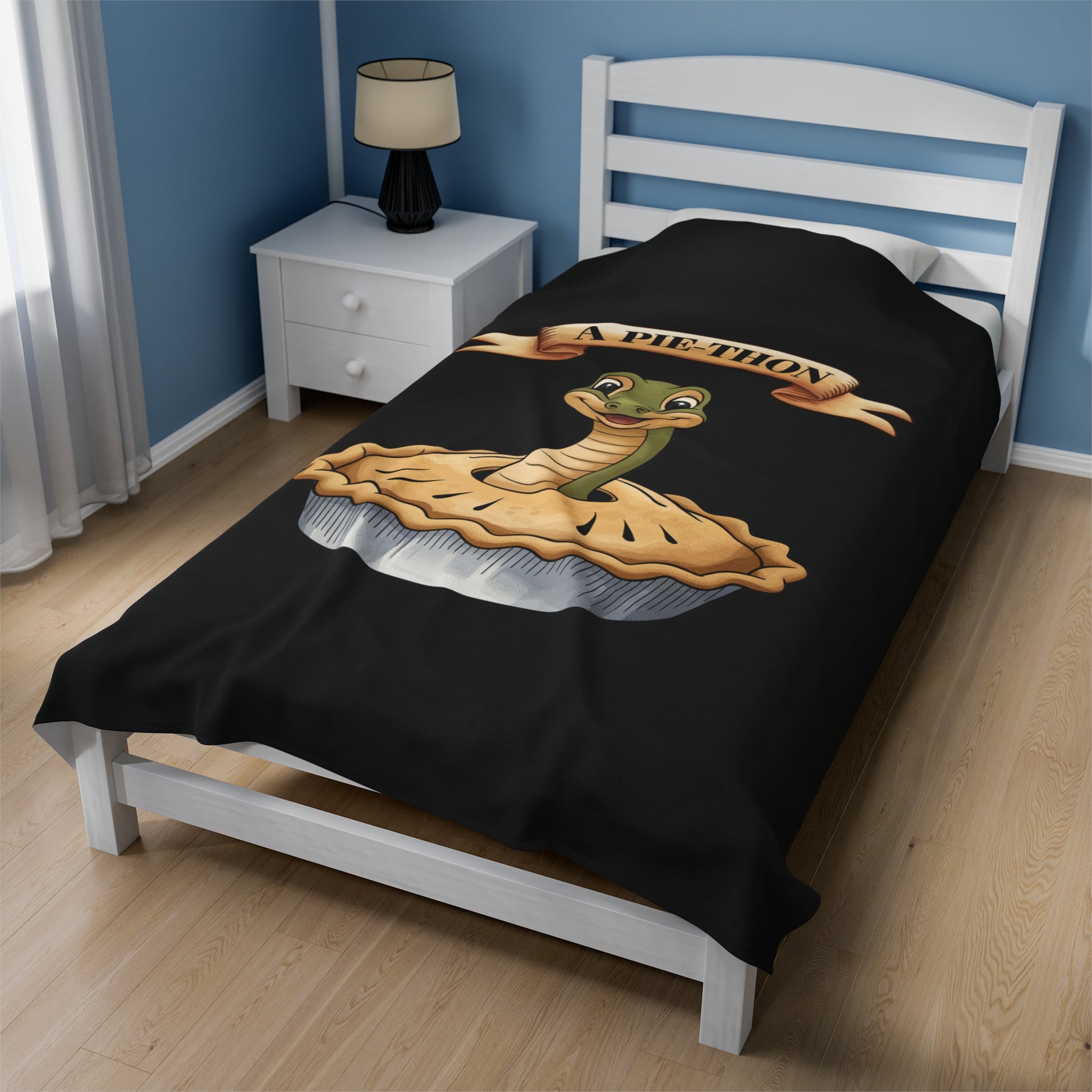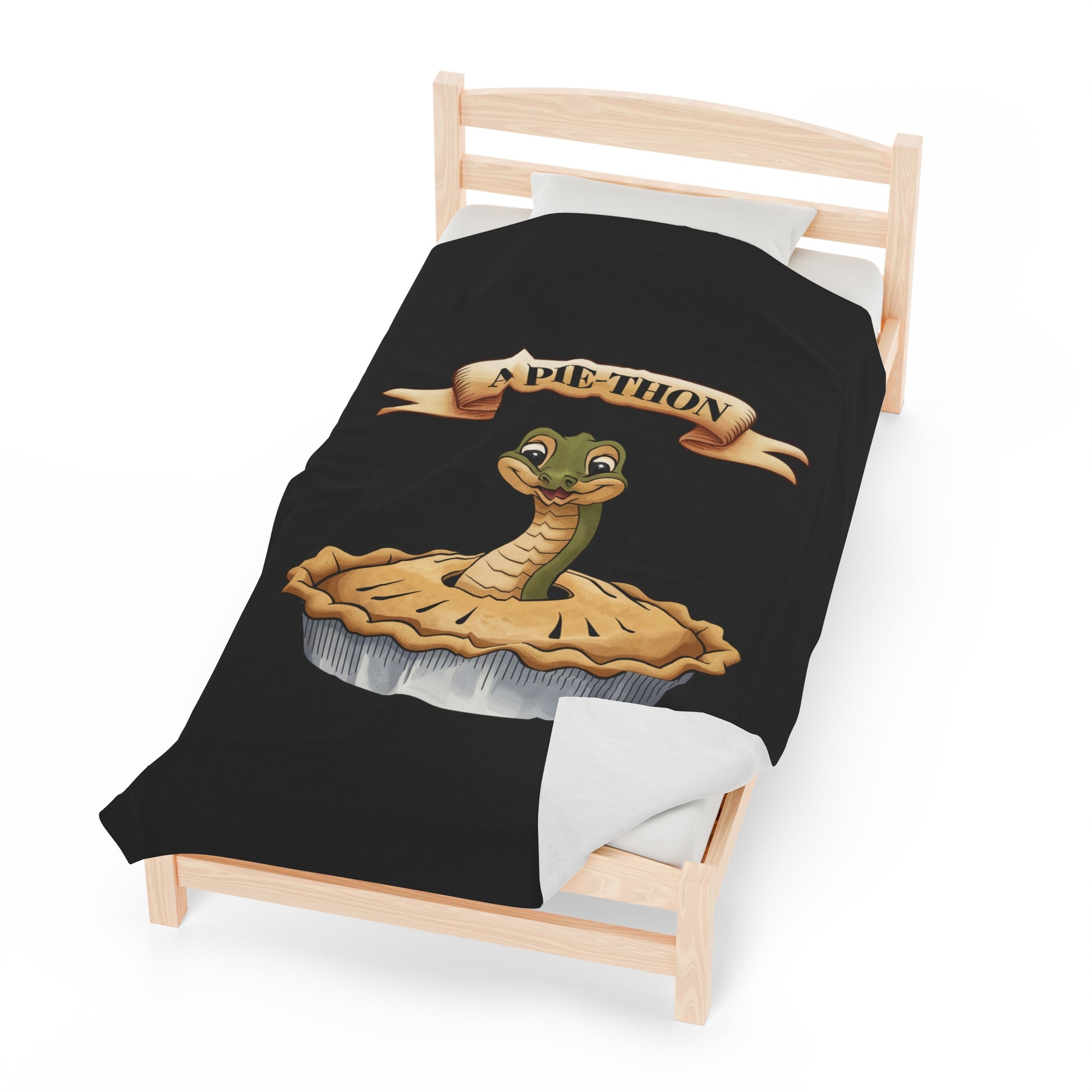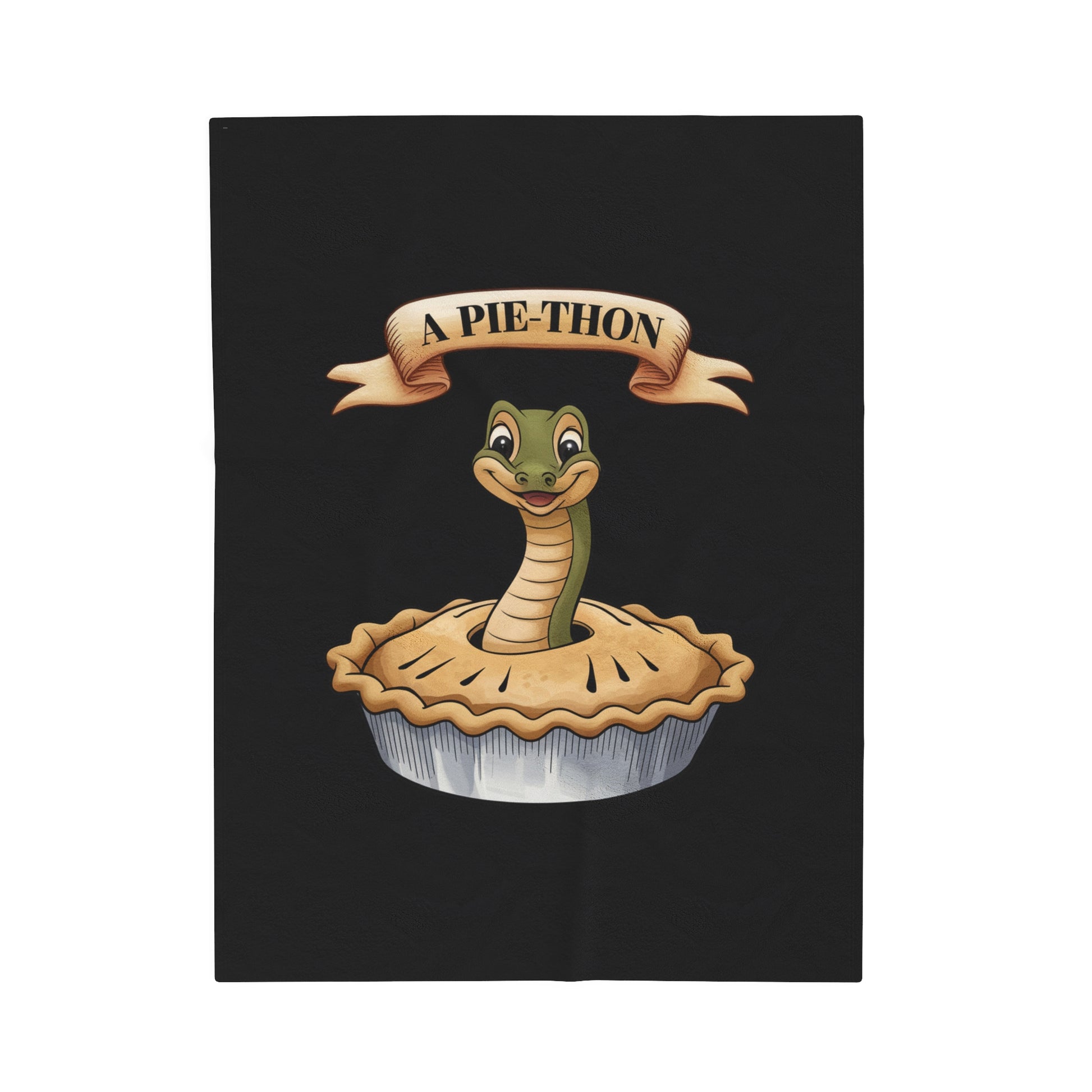A cozy Velveteen Plush Blanket featuring a fun joke design of a snake coming out of a pie with the clever wordplay 'Pie-Thon'. Perfect for those who enjoy humor and like to add a quirky touch to their home decor. Ideal for gifting on birthdays, housewarmings, or as a unique conversation starter during gatherings.