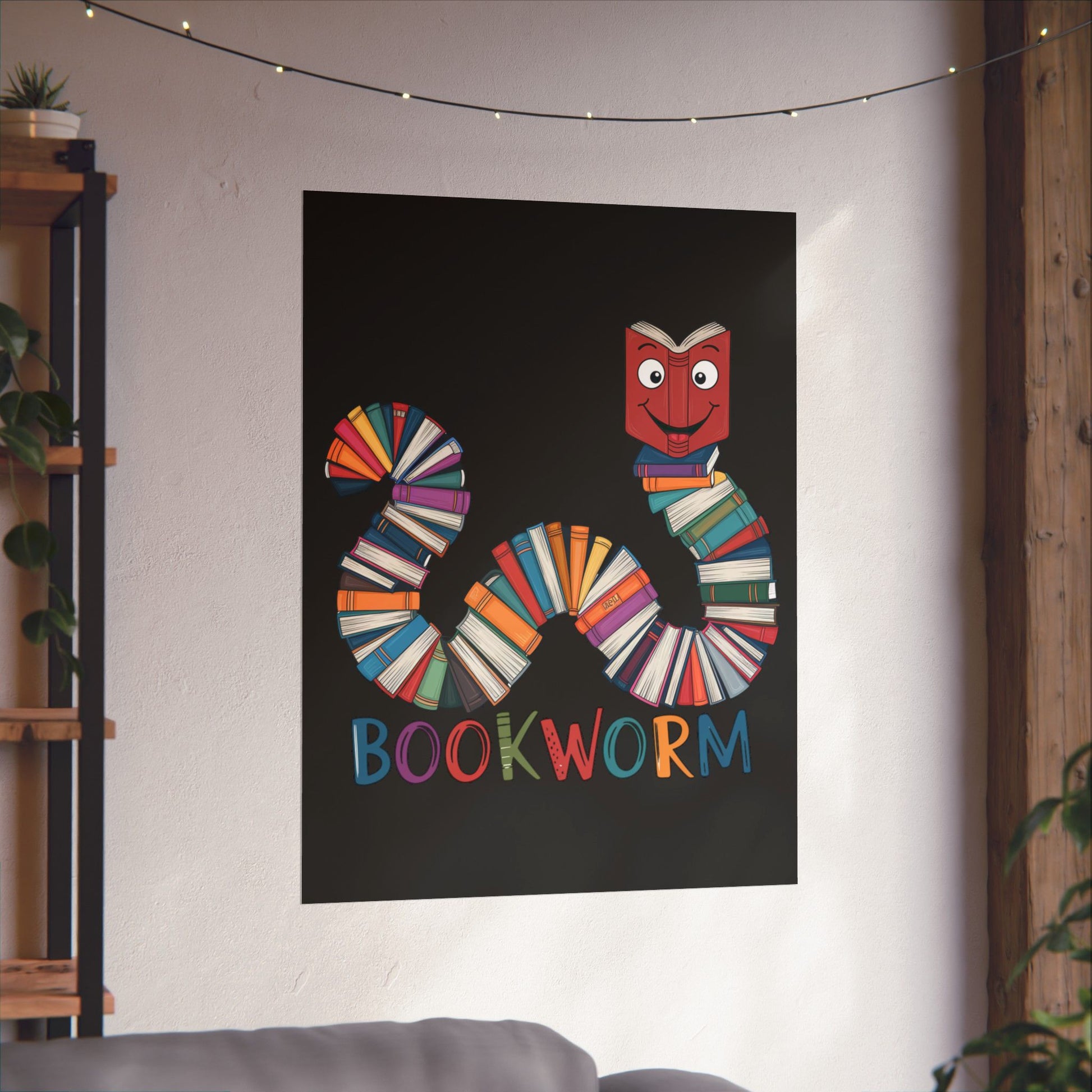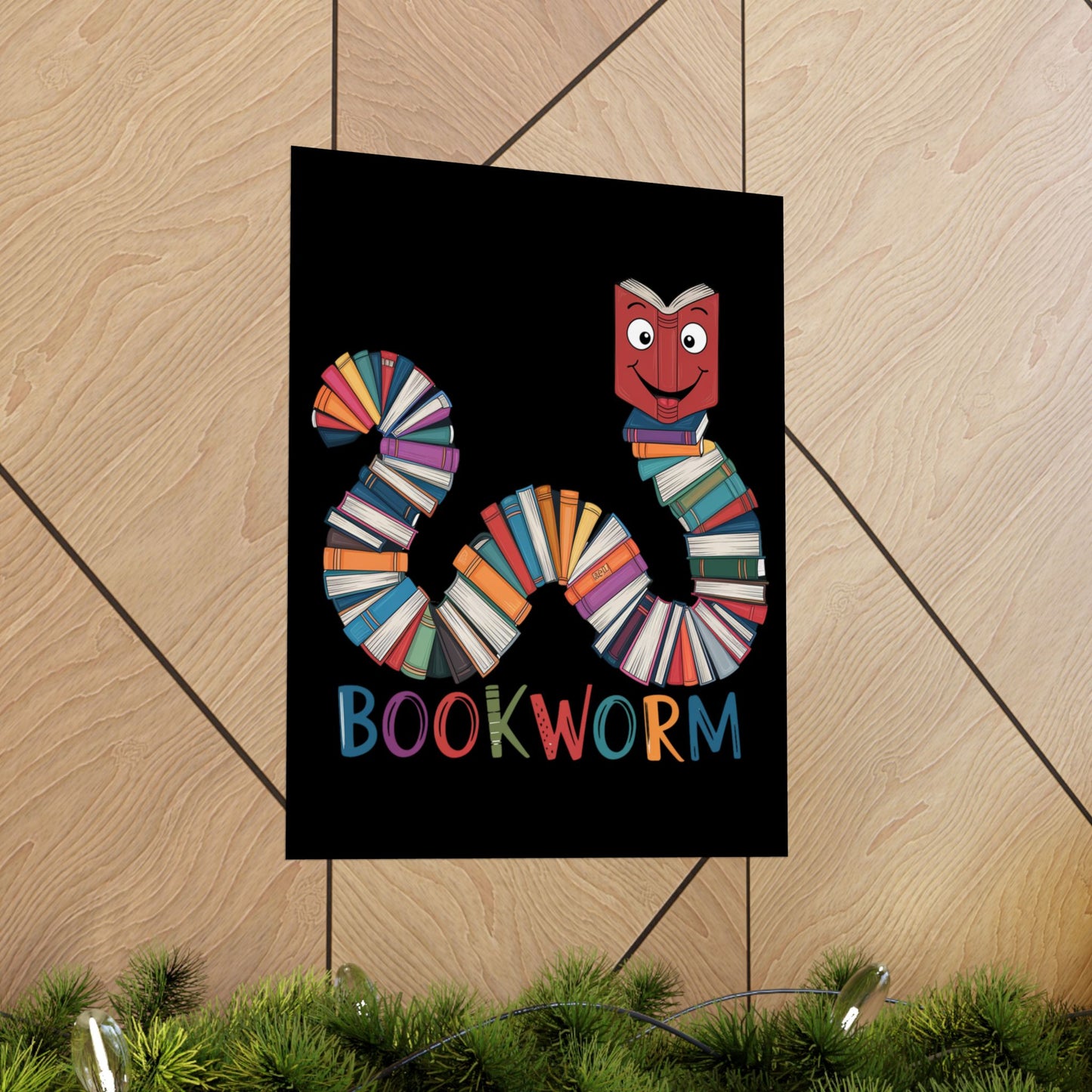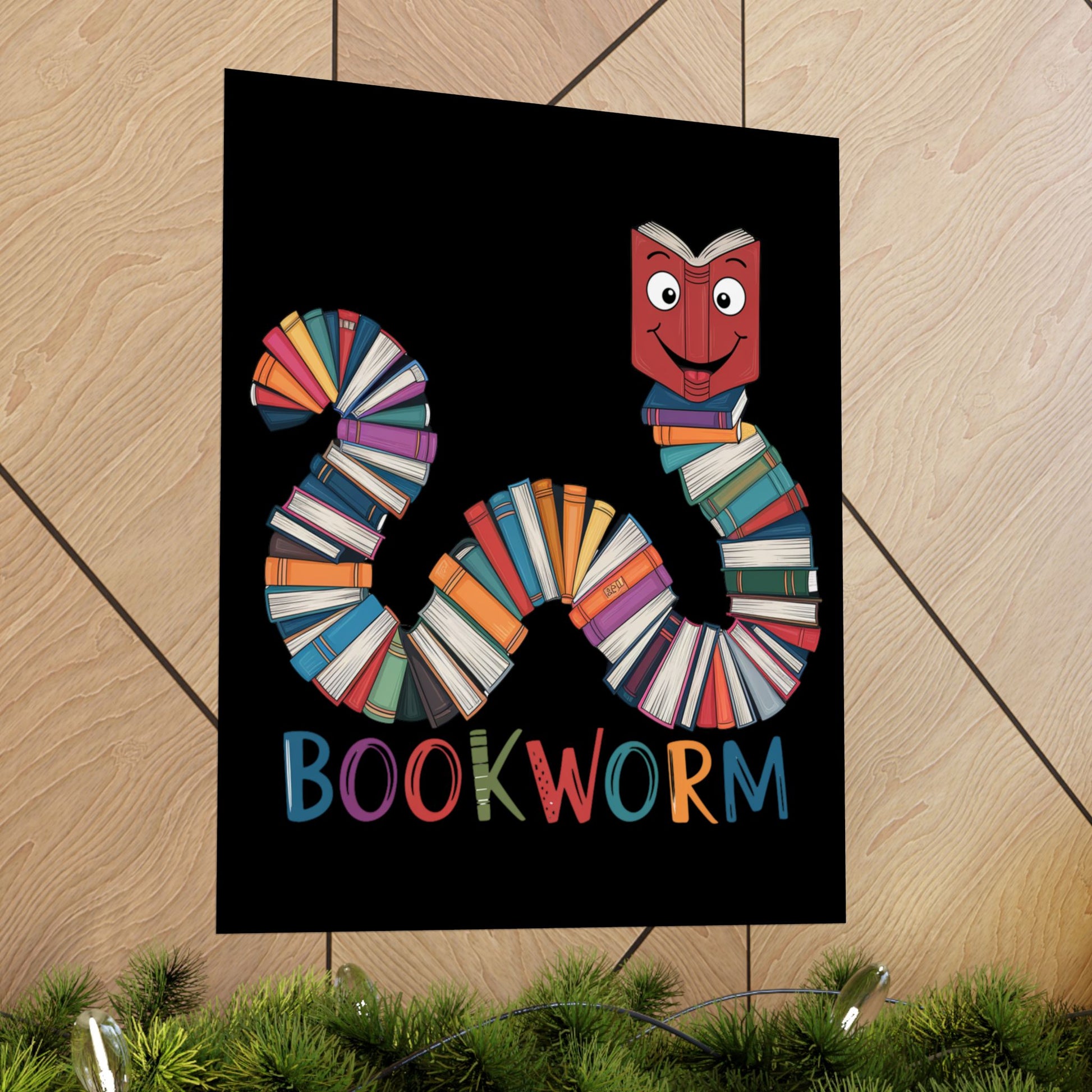 A fun poster featuring a worm made from books with the text 'Bookworm'. Perfect for book lovers and educators, this poster adds a touch of whimsy to any space. Ideal for decorating classrooms, home offices, or reading nooks. Great gift for teachers, librarians, or avid readers. Relevant for back to school, World Book Day, and National Library Week.