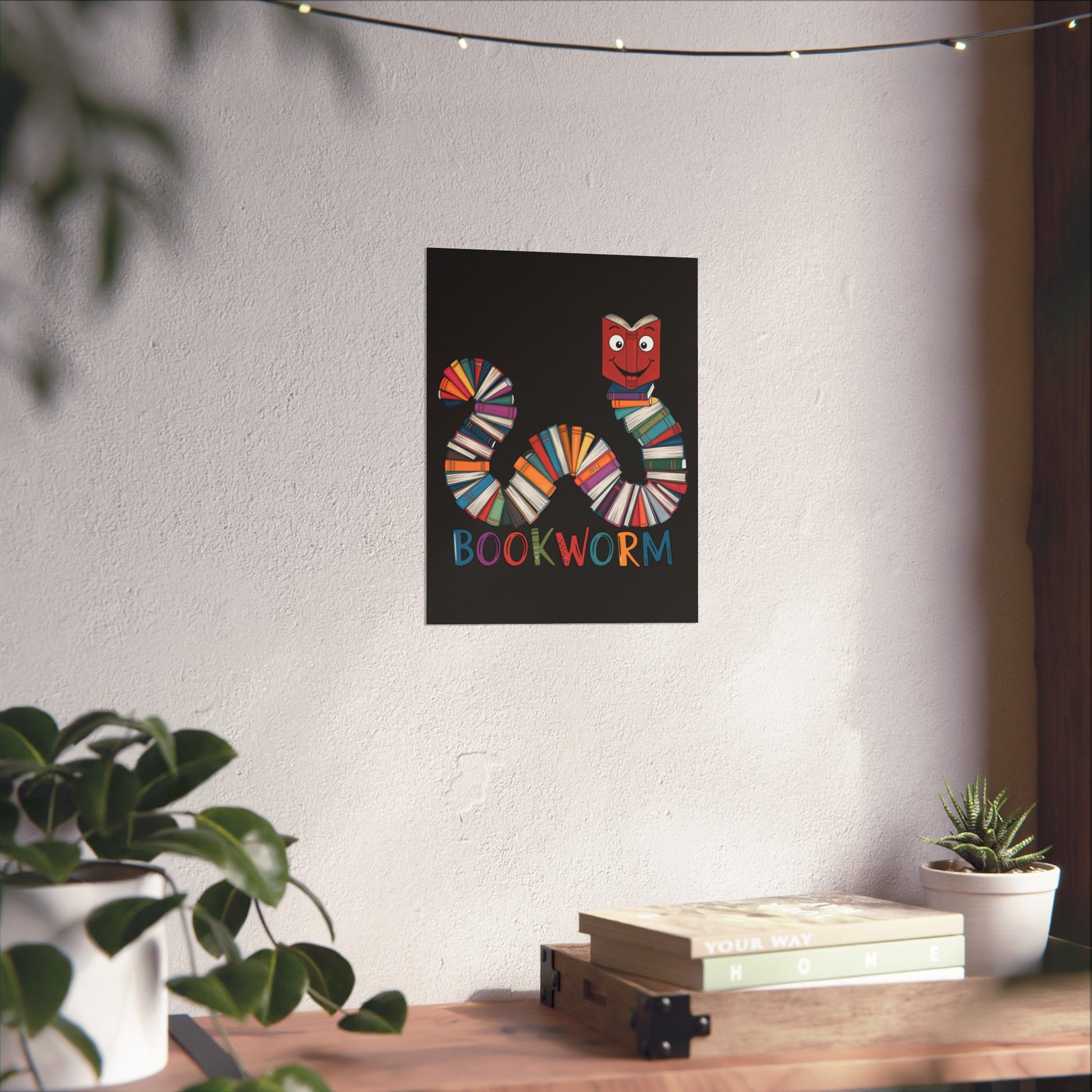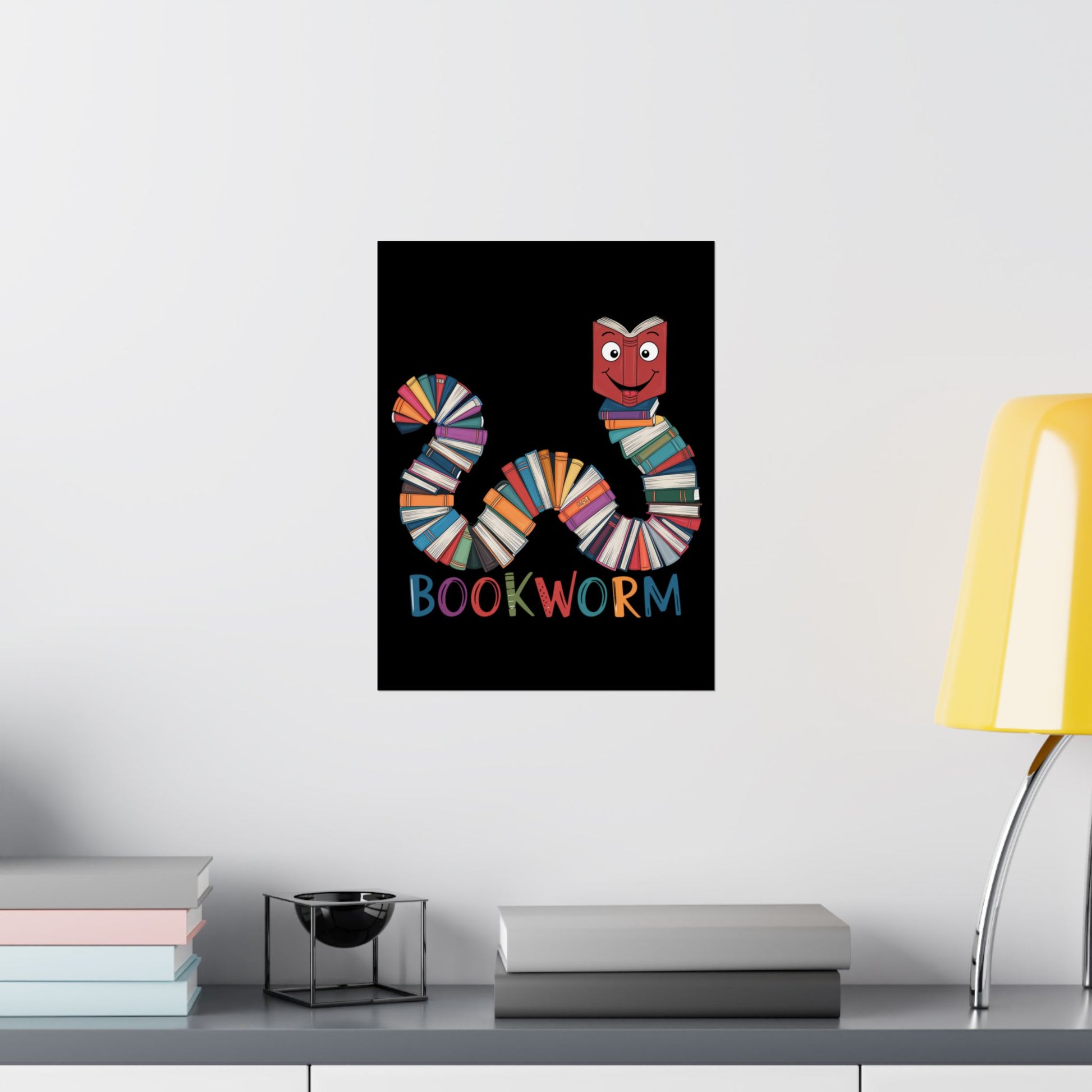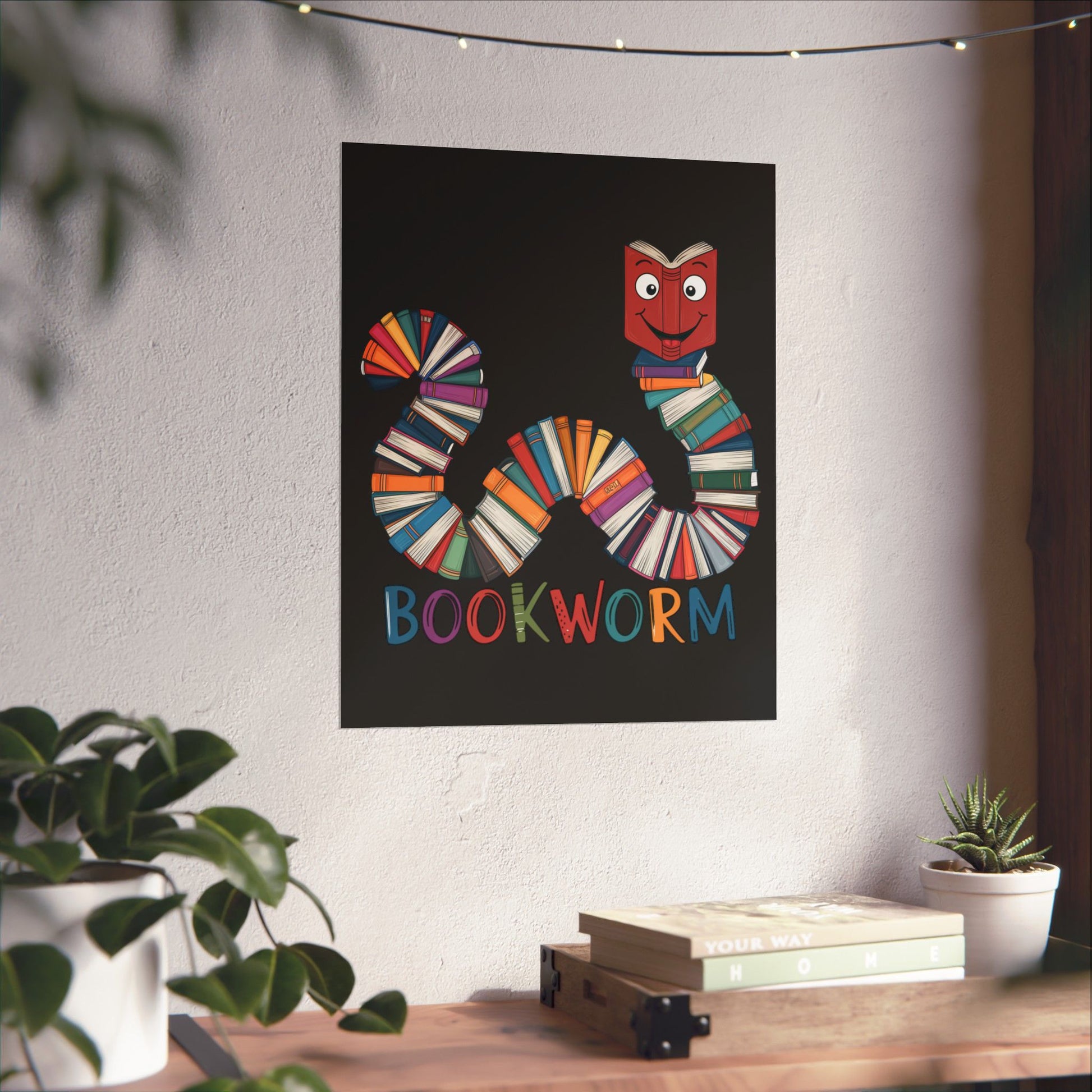 A fun poster featuring a worm made from books with the text 'Bookworm'. Perfect for book lovers and educators, this poster adds a touch of whimsy to any space. Ideal for decorating classrooms, home offices, or reading nooks. Great gift for teachers, librarians, or avid readers. Relevant for back to school, World Book Day, and National Library Week.