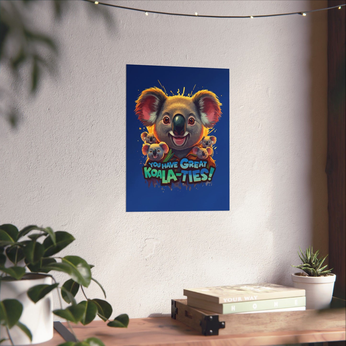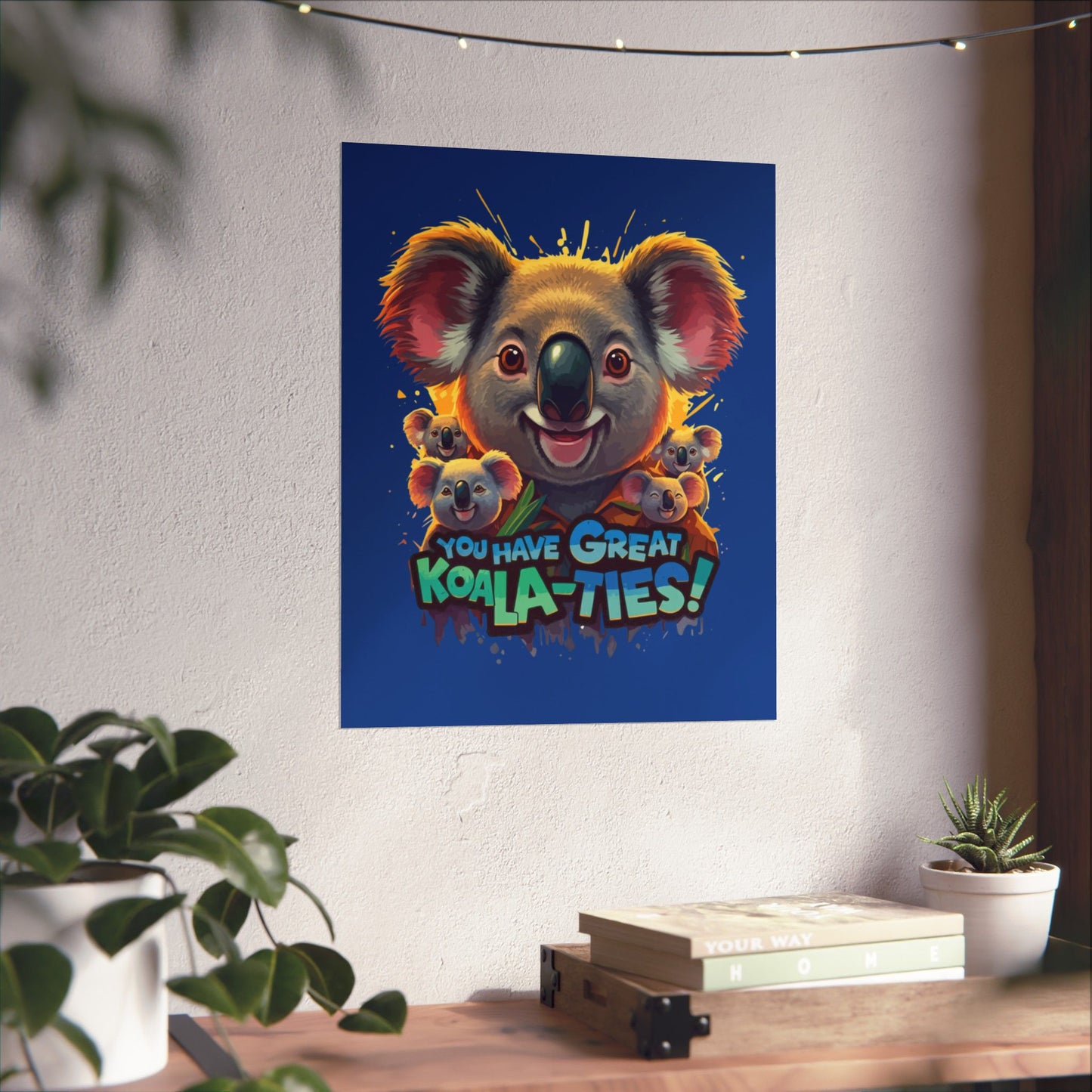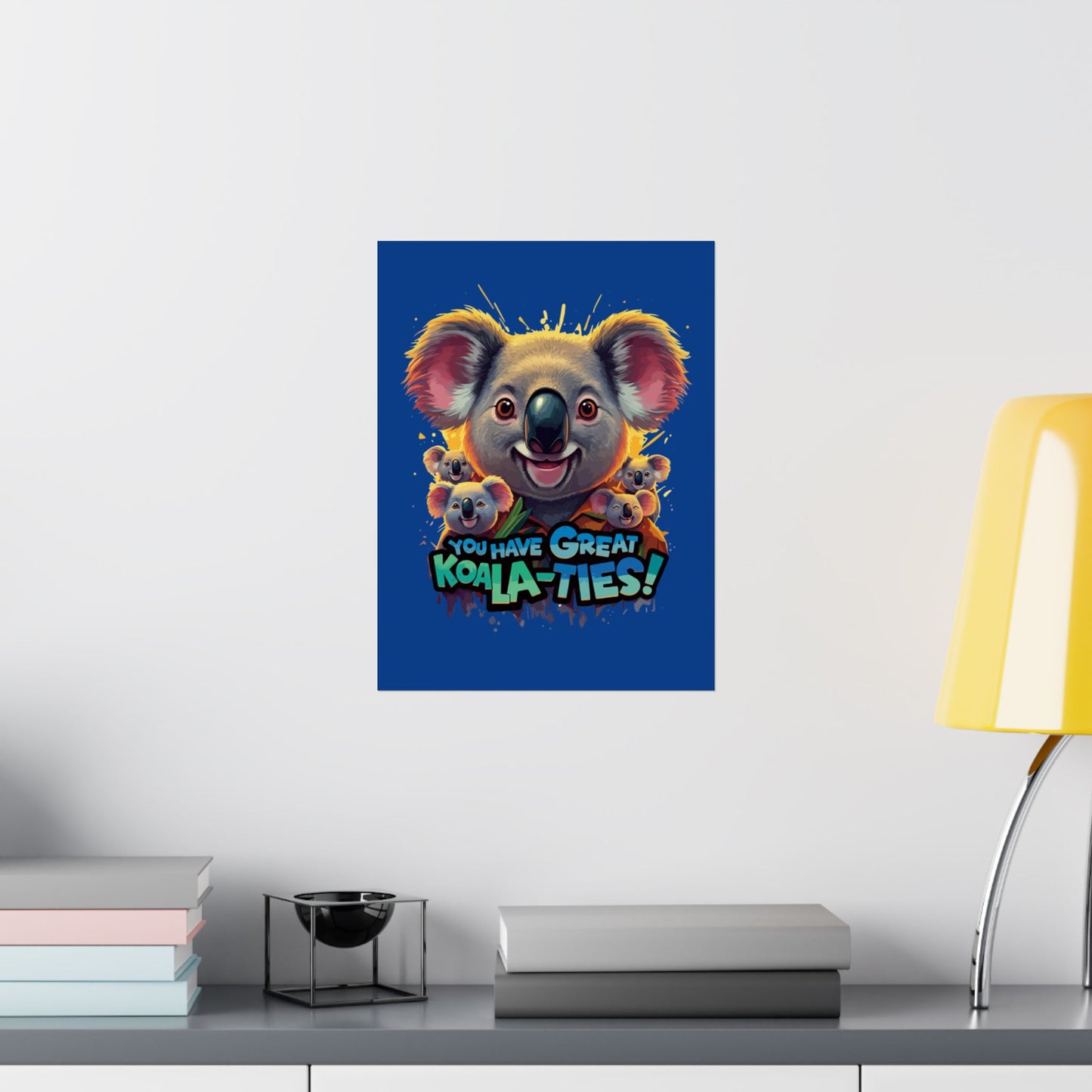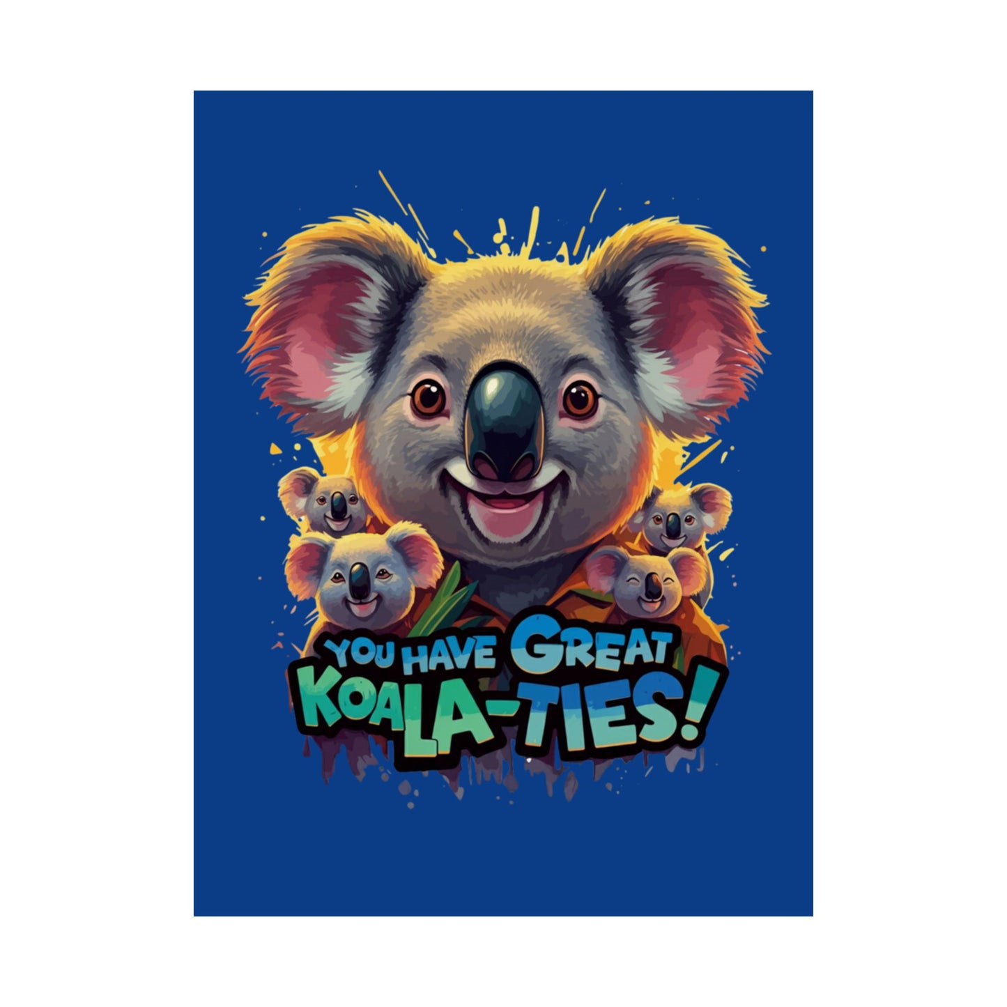A fun pun poster featuring a family of Koala bears with the phrase "You Have Great Koala-Ties". This poster adds a playful and cheerful touch to any room, perfect for animal lovers and those who appreciate a good pun. Ideal for decorating a child's room, nursery, or home office. Great for gifting on birthdays, holidays, or just because.