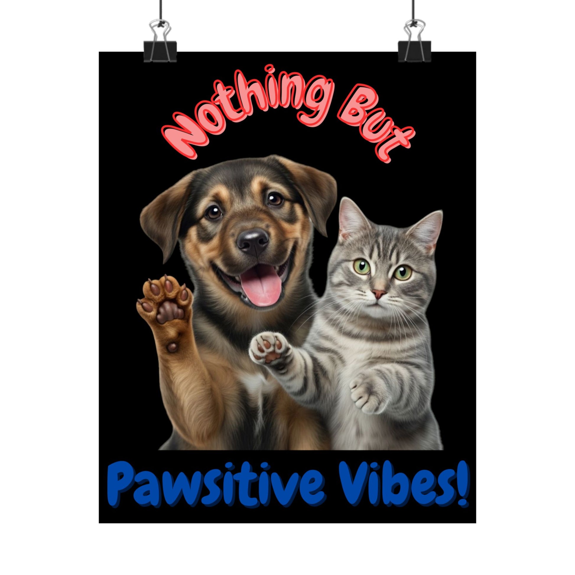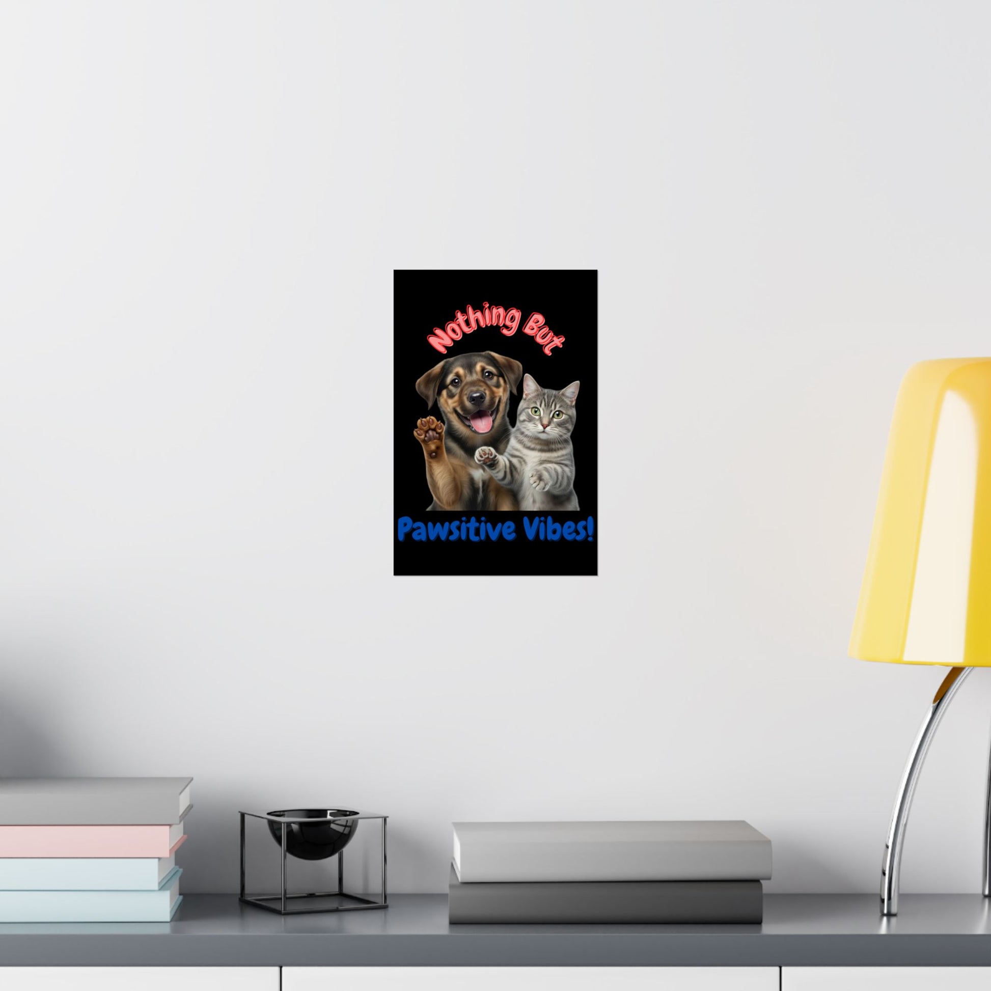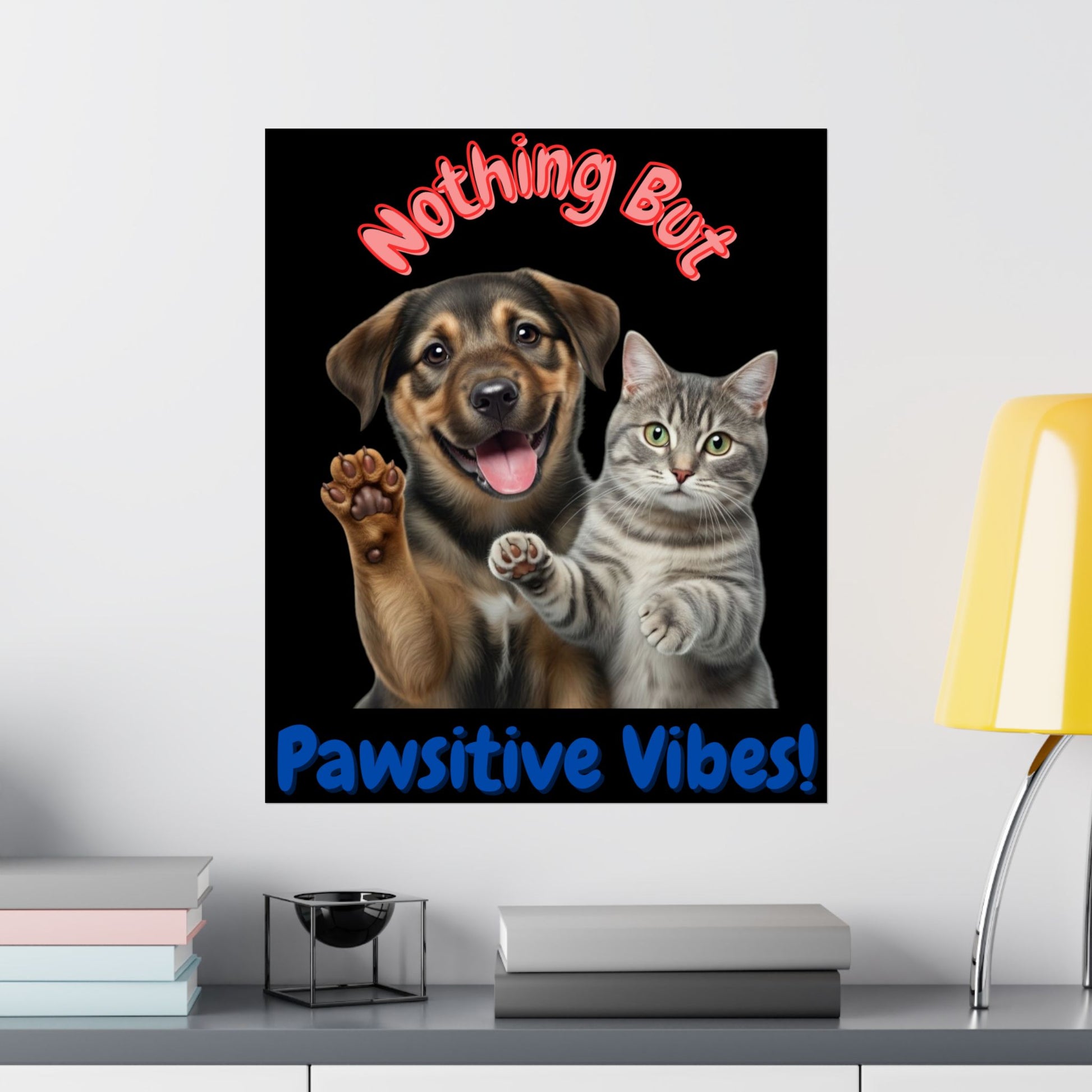 Brighten up your space with this fun pun poster featuring a cat and dog with the phrase "Nothing But Pawsitive Vibes". Perfect for animal lovers and those who appreciate a touch of humor in their decor. Great for adding a lighthearted vibe to any room, suitable for cat and dog owners, and ideal for gifting on birthdays, holidays, or just because.