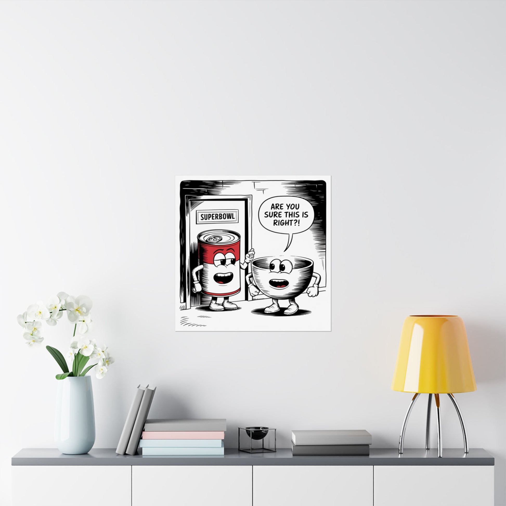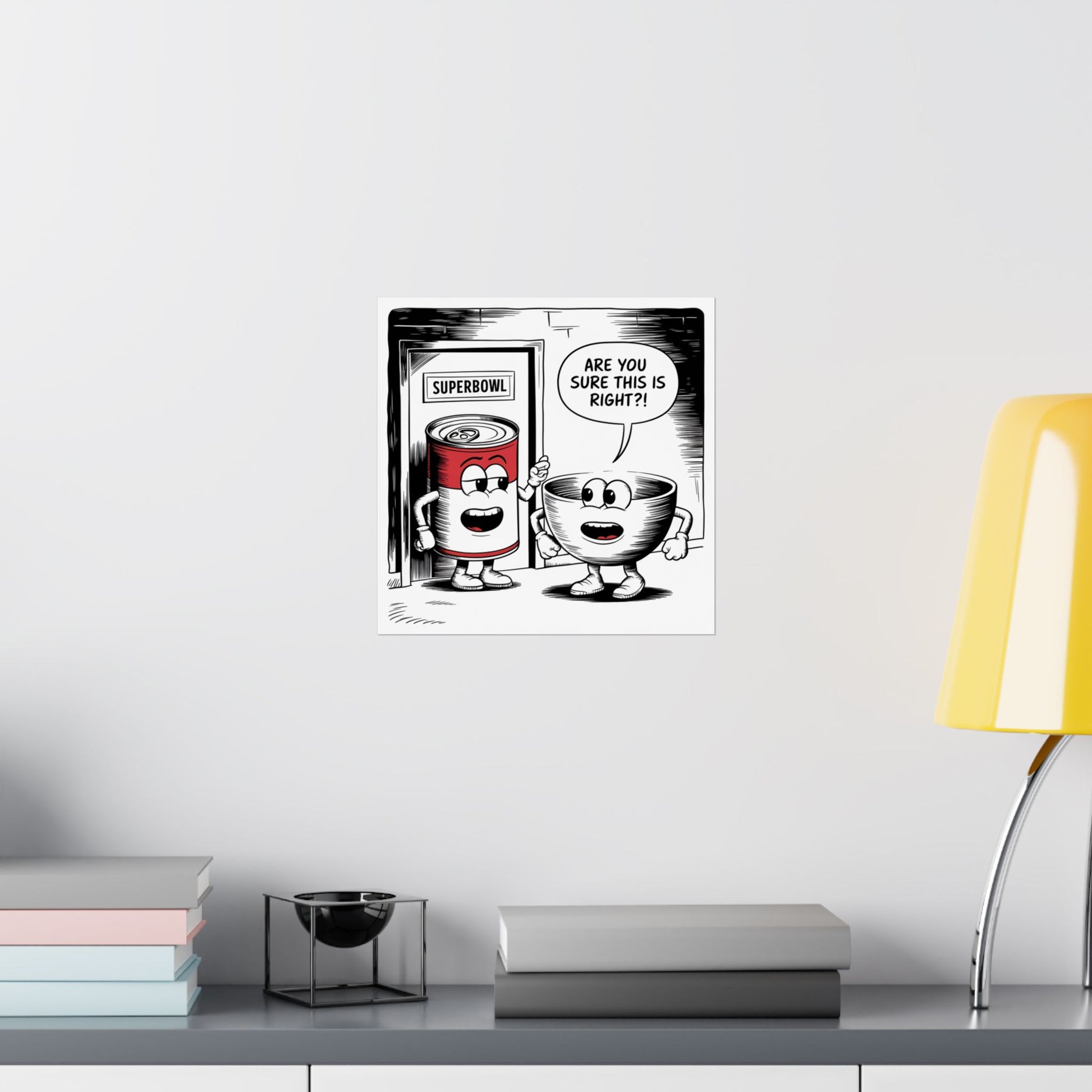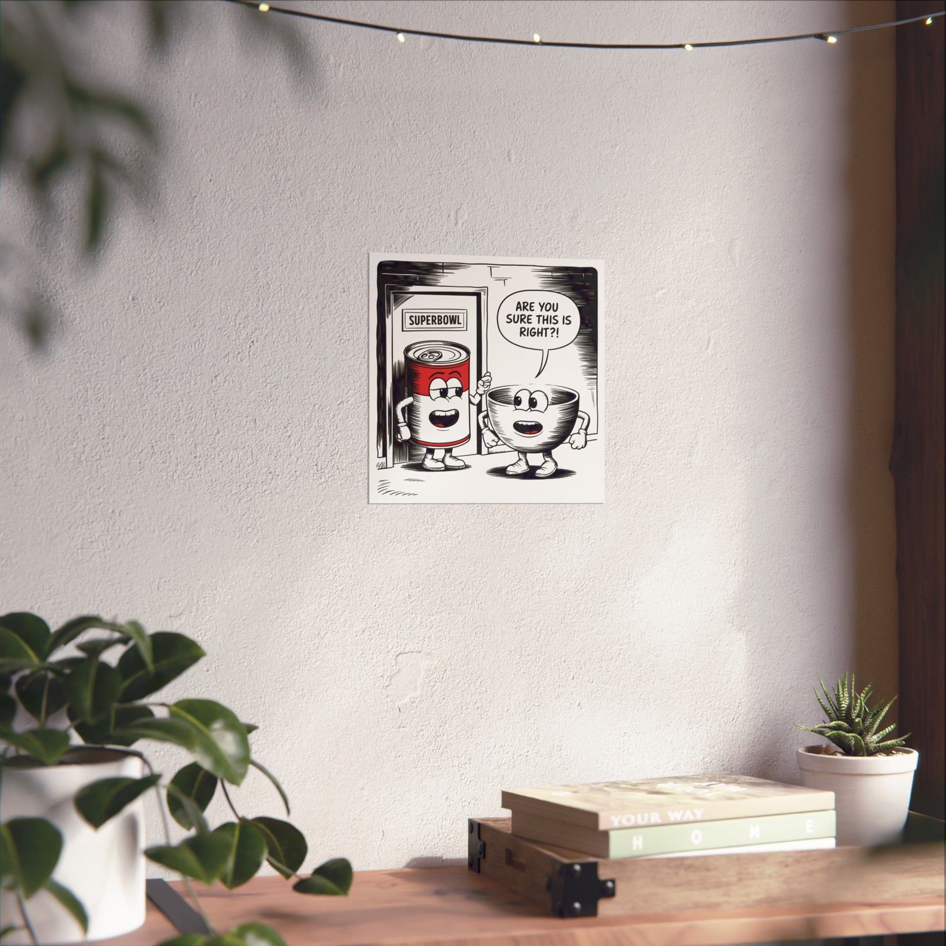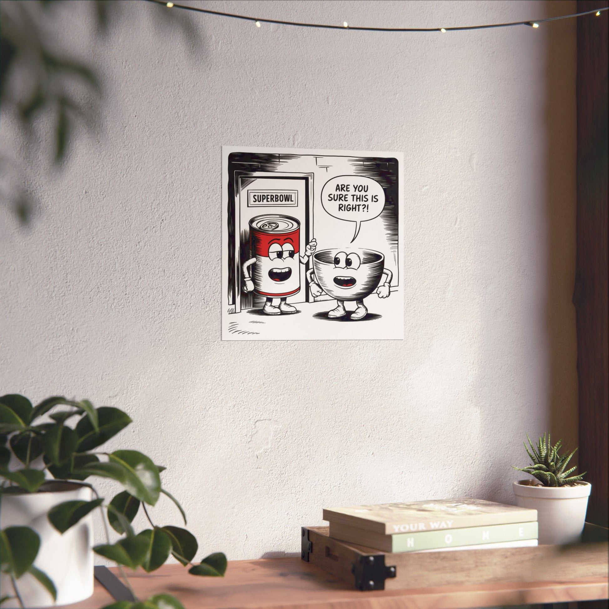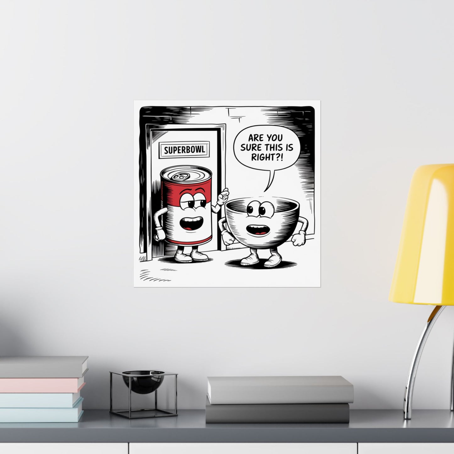 Vibrant matte vertical posters featuring a fun comic about a can of soup and a bowl entering a door labeled 'Superbowl'. Perfect for adding a touch of humor and personality to any room. Ideal for those who enjoy quirky and lighthearted decor. Relevant for Superbowl parties, game nights, and casual gatherings.