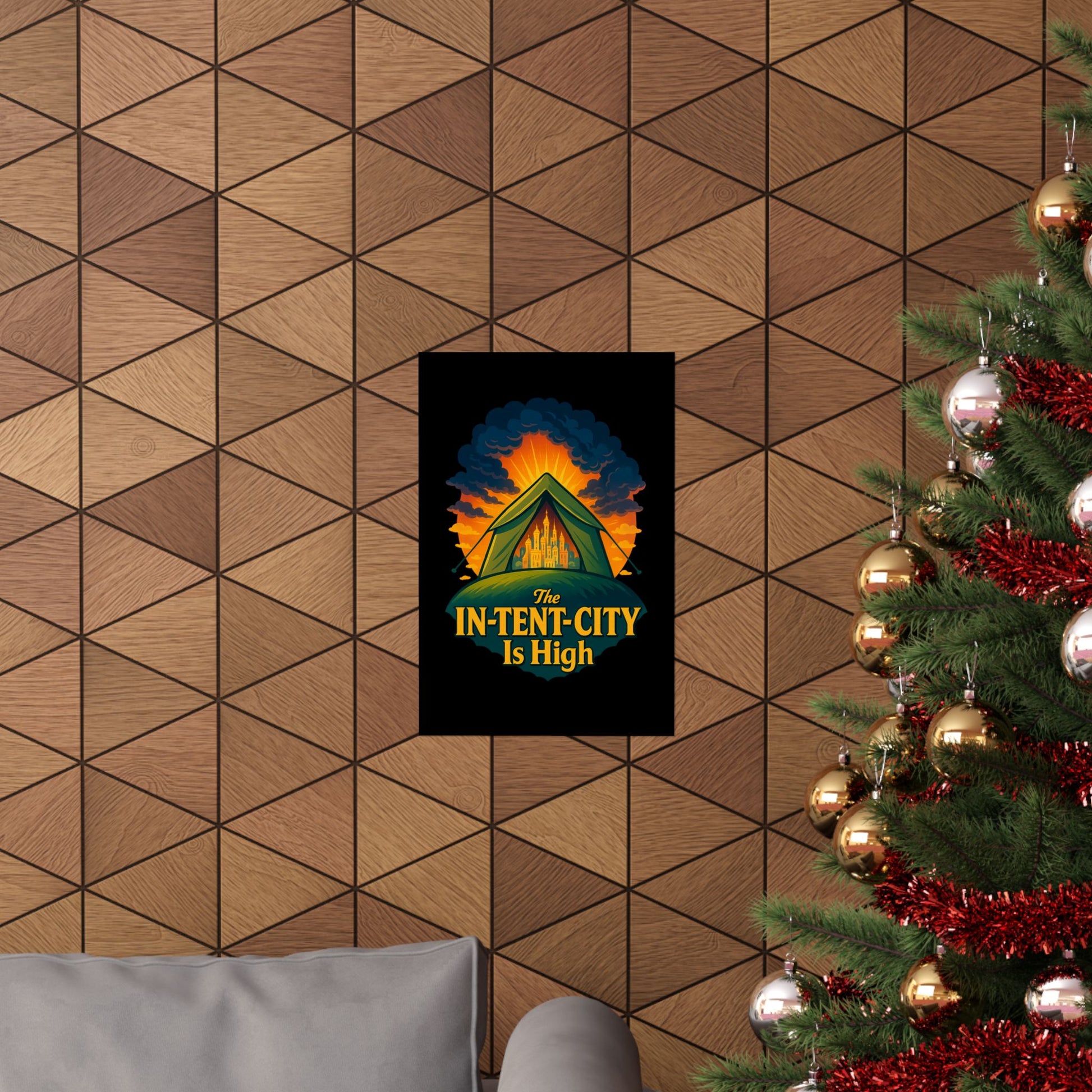 A fun poster featuring a city within a tent high on a hill with the quote 'The In-Tent-City is High'. Perfect for those looking for a unique and whimsical piece of art to add a touch of creativity to their living space. Ideal for adults who enjoy playful and imaginative decor. Relevant for home decor, gifts for artists or creative individuals, and for occasions like birthdays or housewarmings.