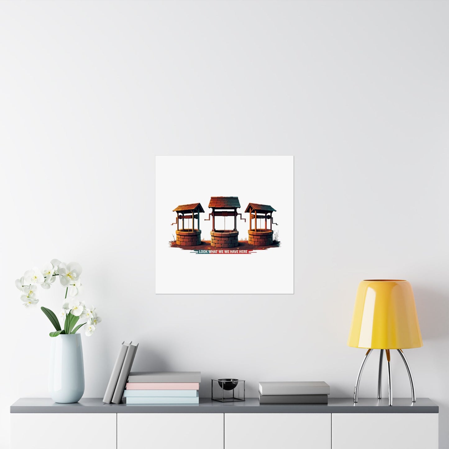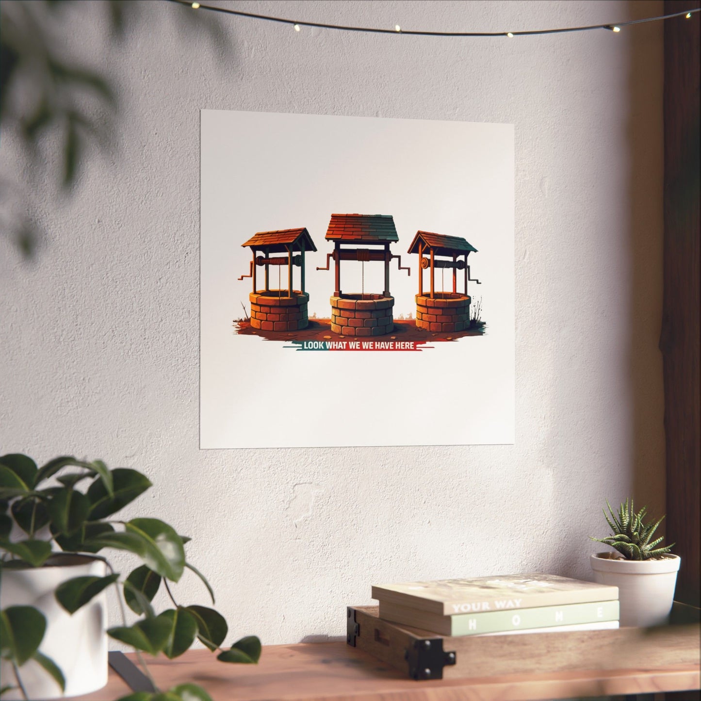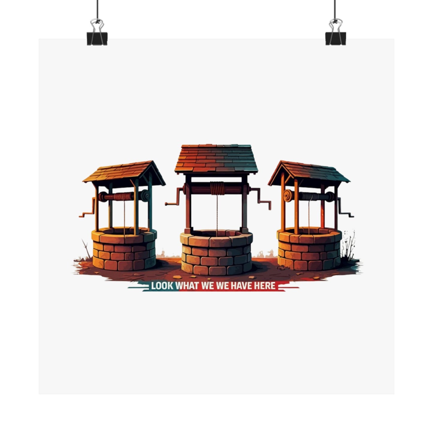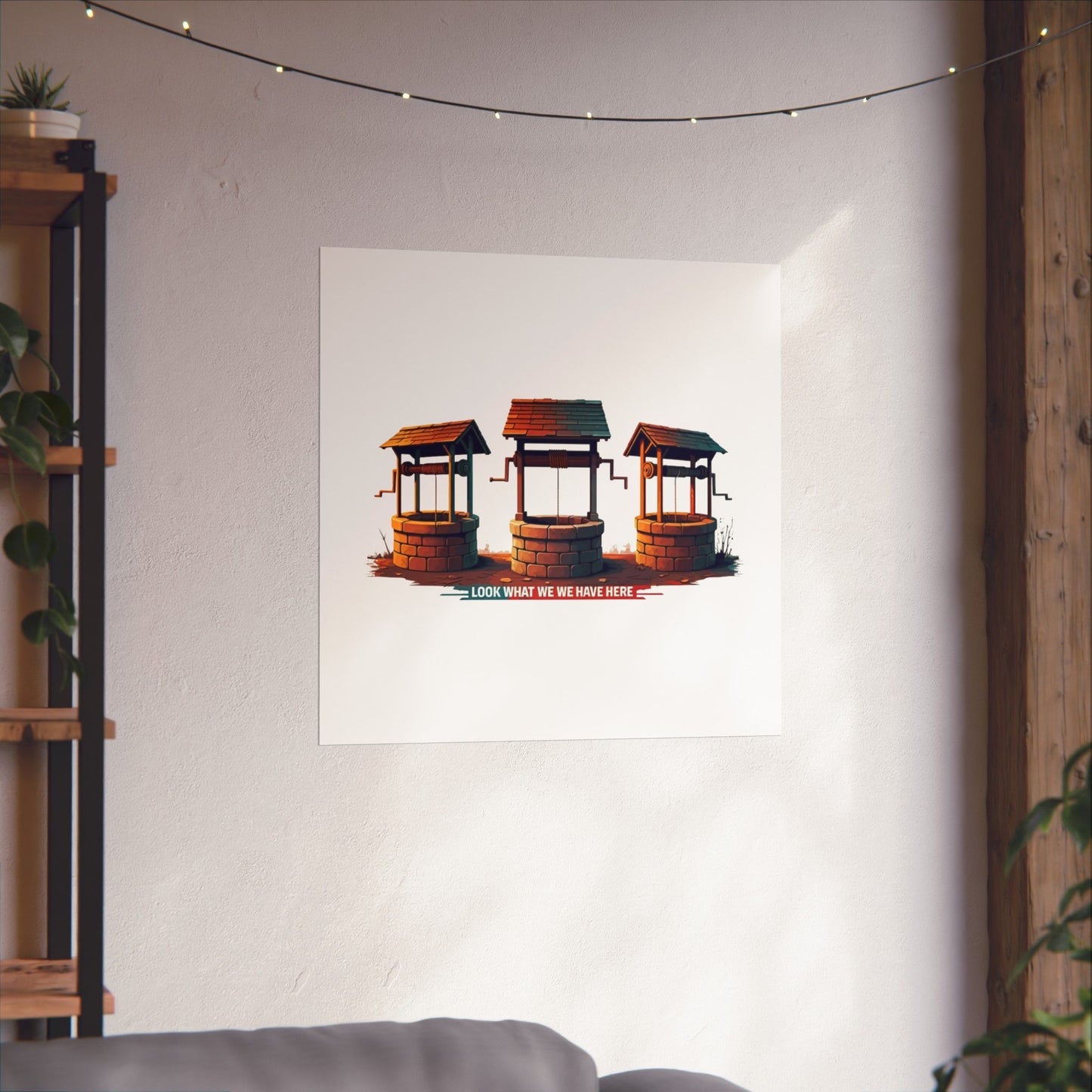 A fun pun poster that states 'Well Well Well, Look What We Have Here'. This poster adds a playful and humorous touch to any room, perfect for those who enjoy witty decor. Ideal for home offices, dorm rooms, or as a gift for a friend with a great sense of humor. Relevant for birthdays, holidays, or just to bring a smile to someone's face.