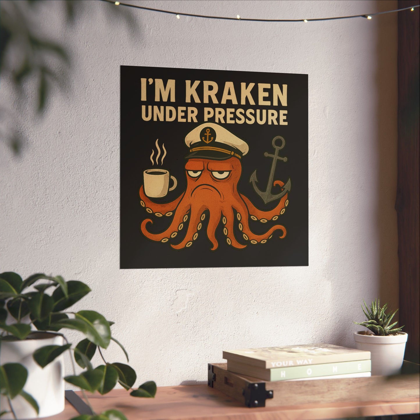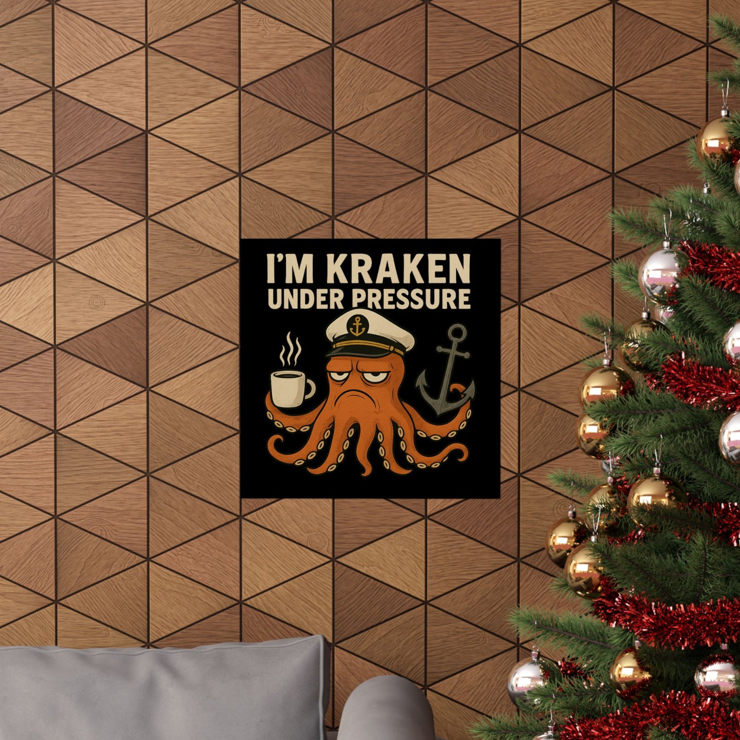A fun poster featuring a stressed Octopus with the quote 'I'm Kraken Under Pressure'. Perfect for adding a quirky touch to any room or office space. Ideal for adults looking for a unique and humorous decor piece. Relevant for holidays, birthdays, and office celebrations.