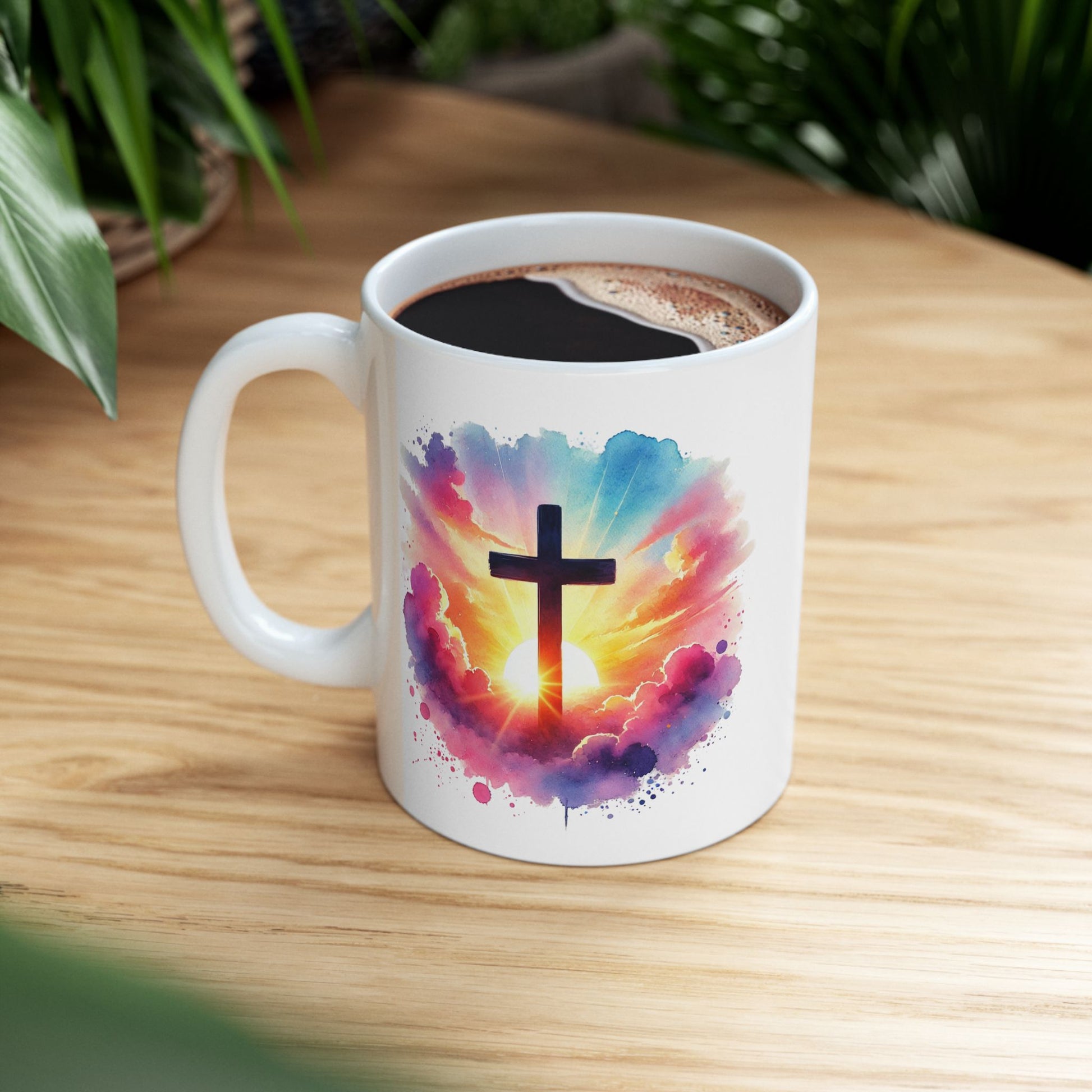 Christian Cross Sunrise Mug – Inspirational Faith Coffee Cup with Colorful Sky & Clouds, Religious Gift, Dishwasher Safe Prayer Mug