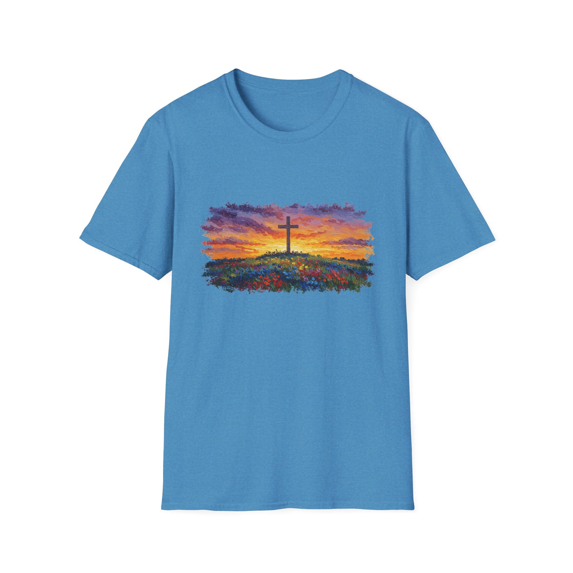 Bring the vibrant beauty of impressionist art to your wardrobe with this Van Gogh‑Style Cross Sunset Tee. Featuring a boldly textured landscape of glowing sunset skies, wild blooms, and a peaceful cross silhouette—this design blends faith, artistry, and nature in one.