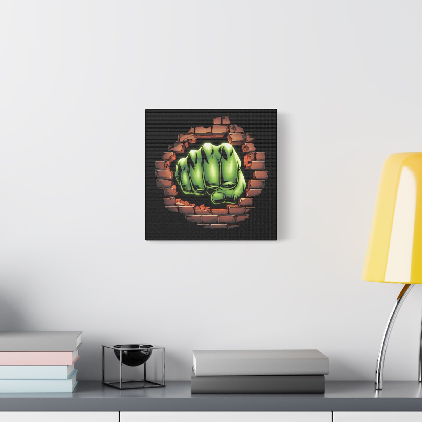 A fun wall canvas featuring the Green Fist smashing through the wall. This bold and unique design adds a touch of excitement to any room. Perfect for those who love quirky and eye-catching art pieces. Relevant for birthdays, holidays, and home decor.