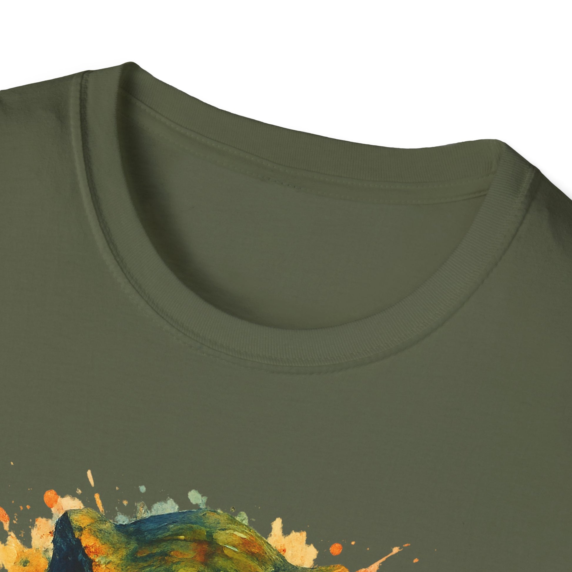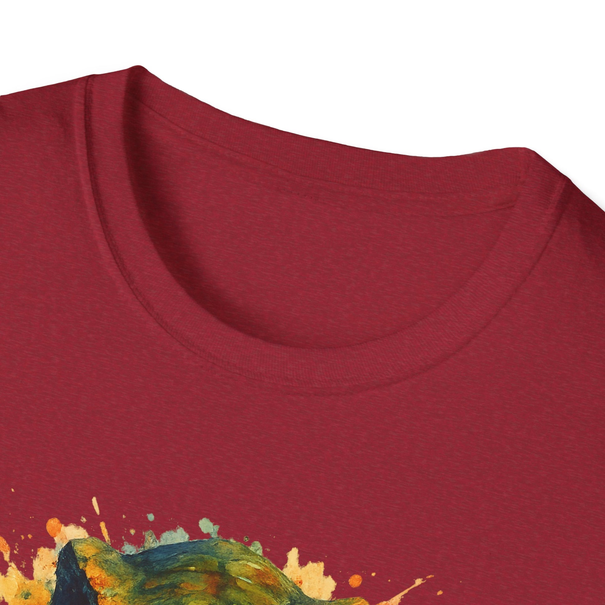 On-trend watercolor splash style—recent popularity in top dinosaur graphic shirts.