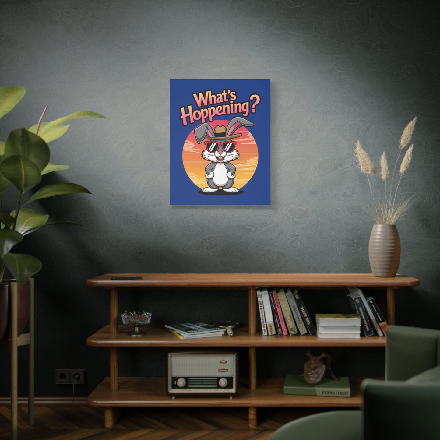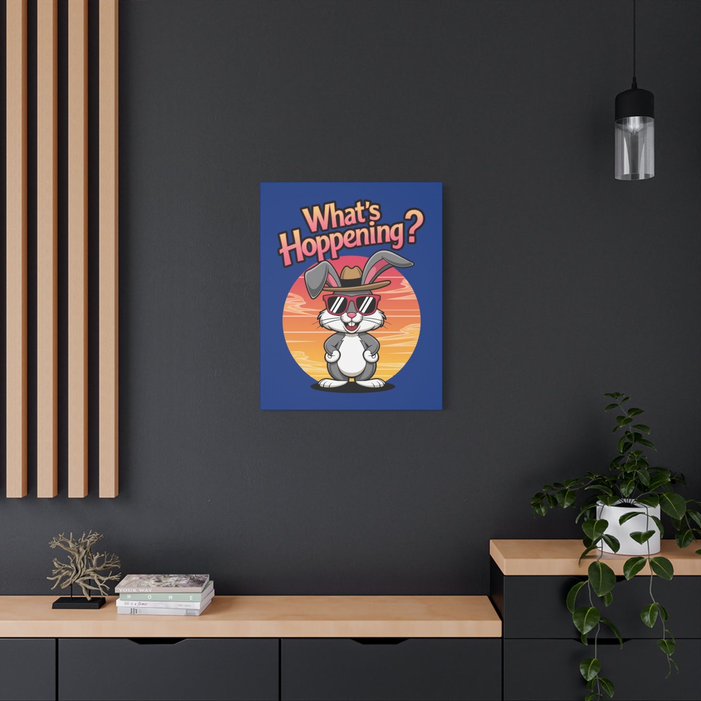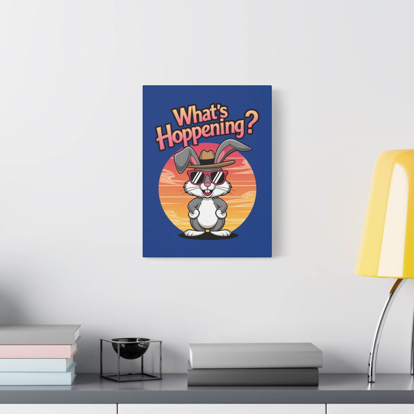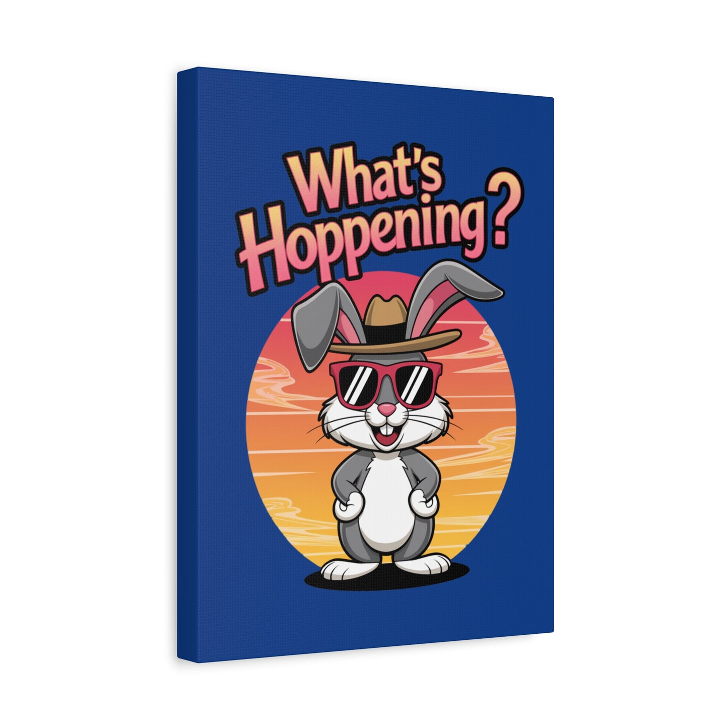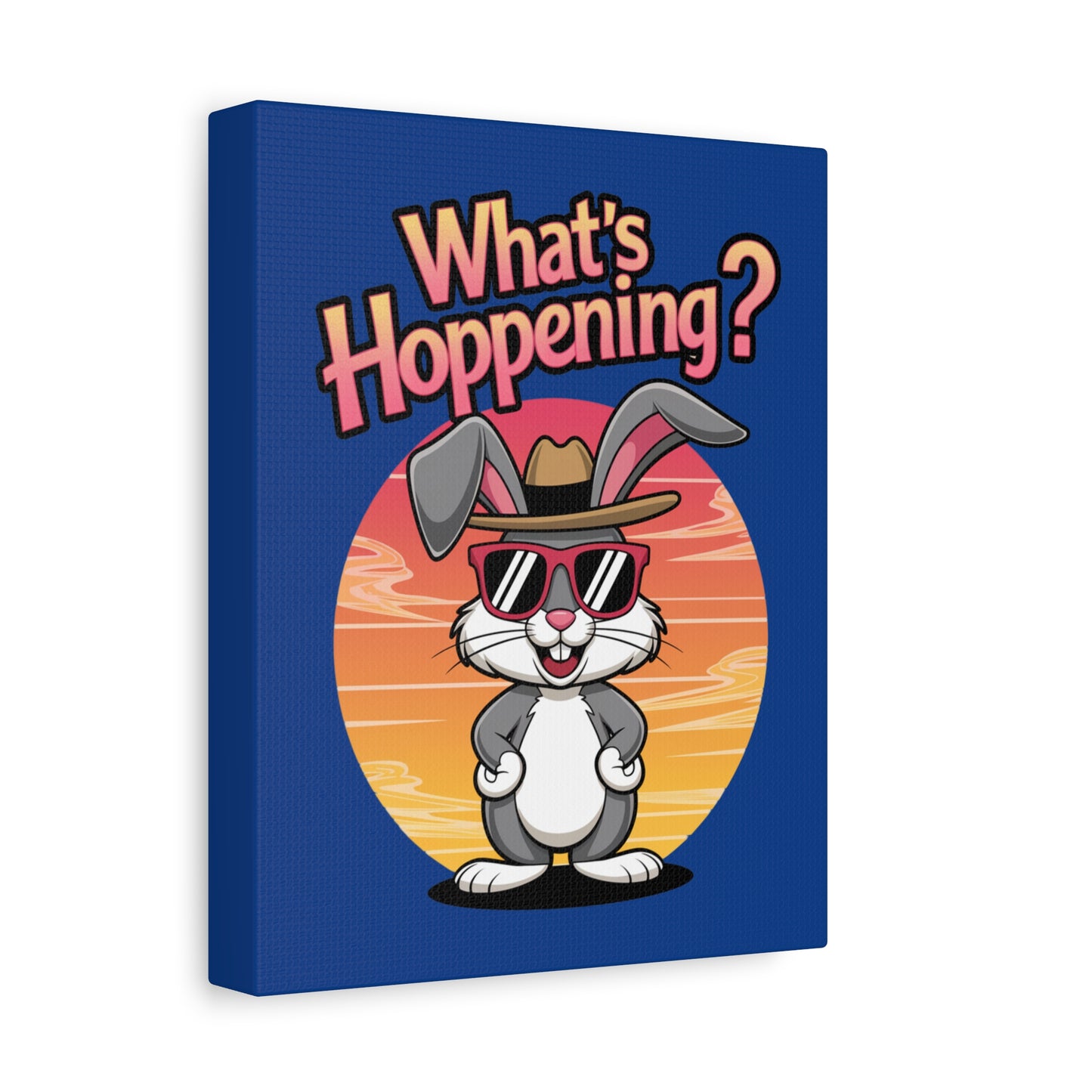 A fun canvas art piece with a cool bunny on it that states "What's Hoppening". This canvas art piece gives a playful and whimsical vibe, perfect for adding a touch of humor to any room. Ideal for Easter celebration decorations or as a gift for bunny lovers and those who appreciate unique art pieces.